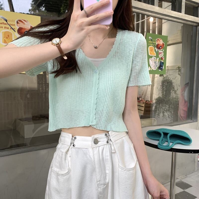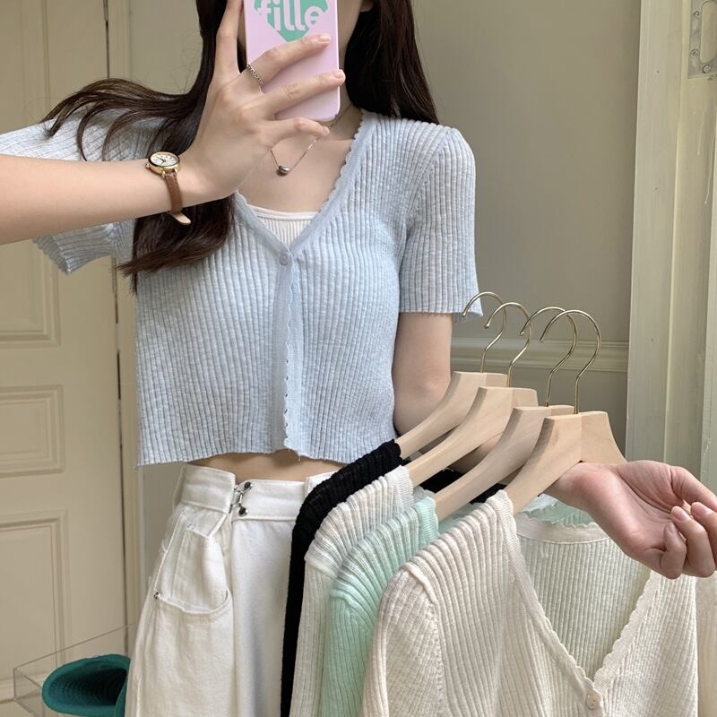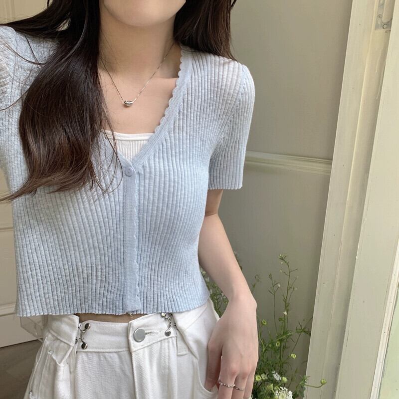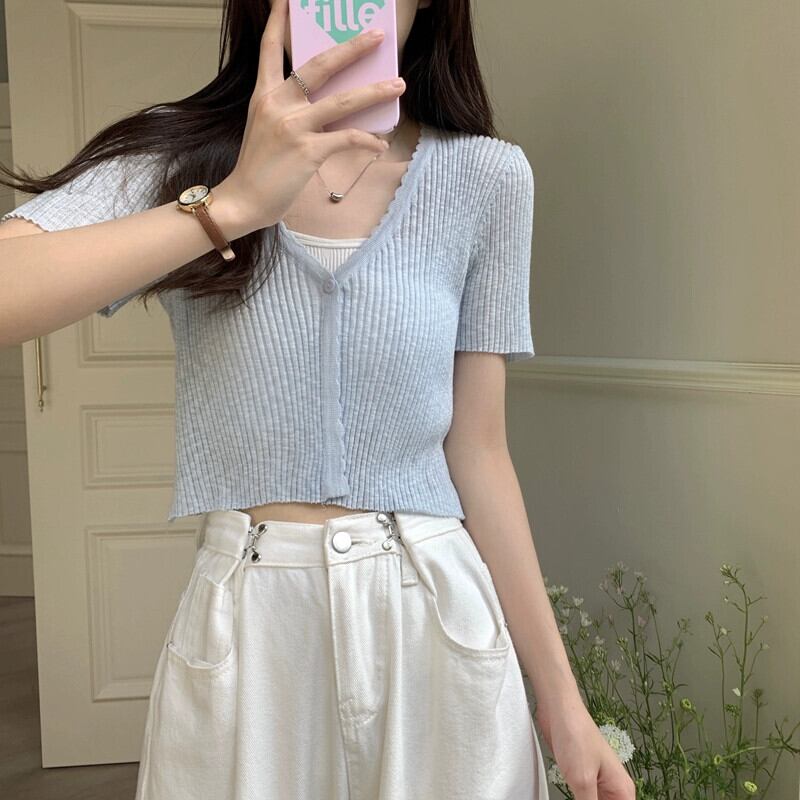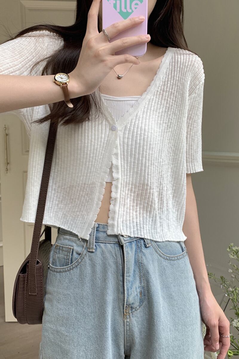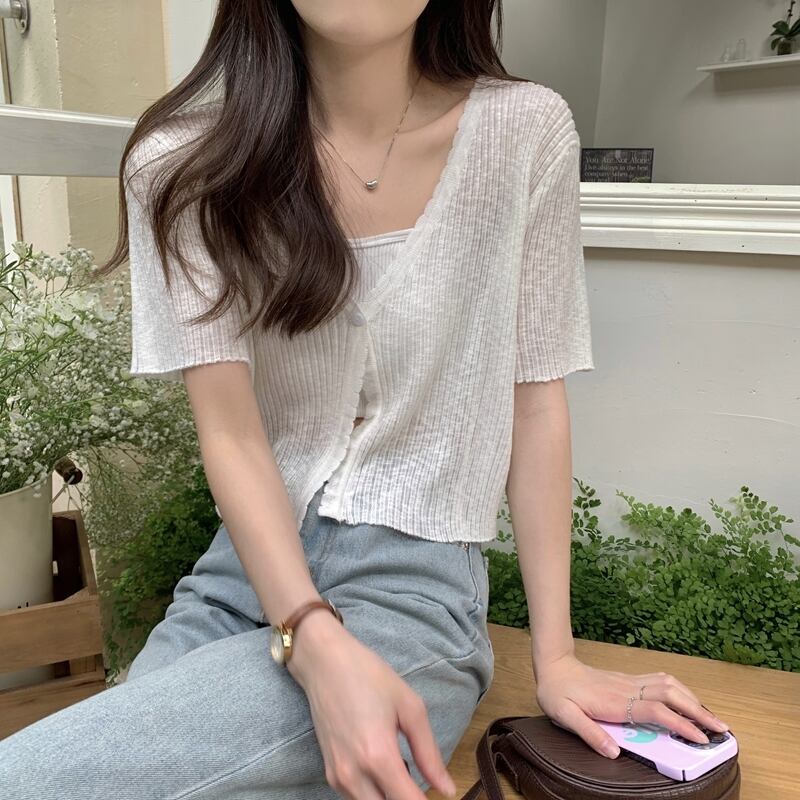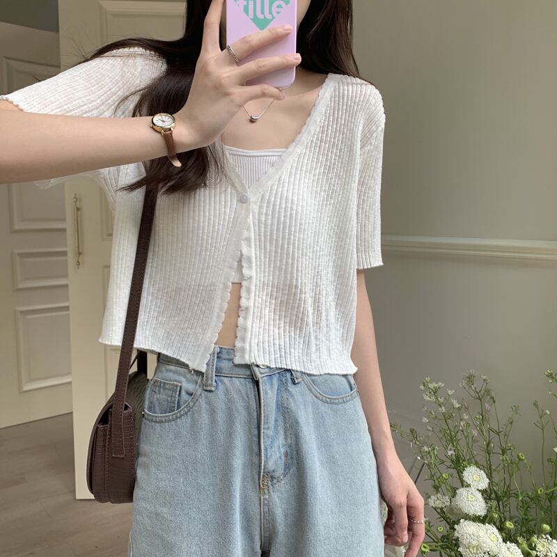 アイスシルクニット半袖カーディガン薄いセクション女性の夏の短いセクション小さなショールサスペンダー付きアインスタイル V ネックトップホワイト ショート サマー 夏物 Vネック 7460065800045901 | framboise21