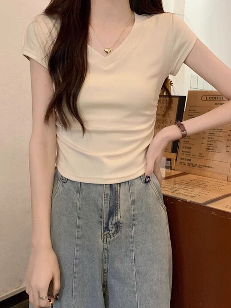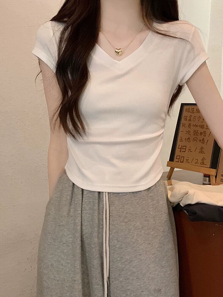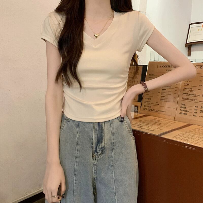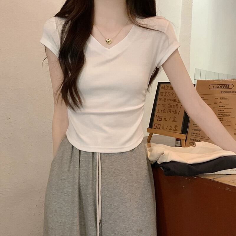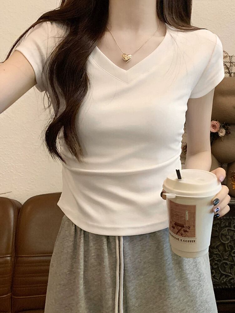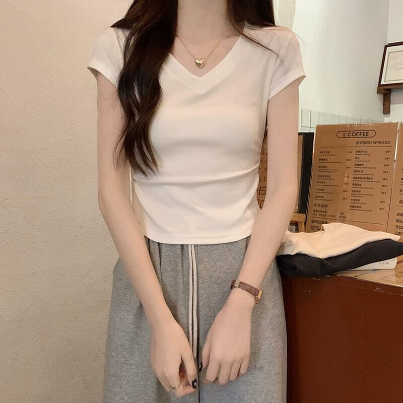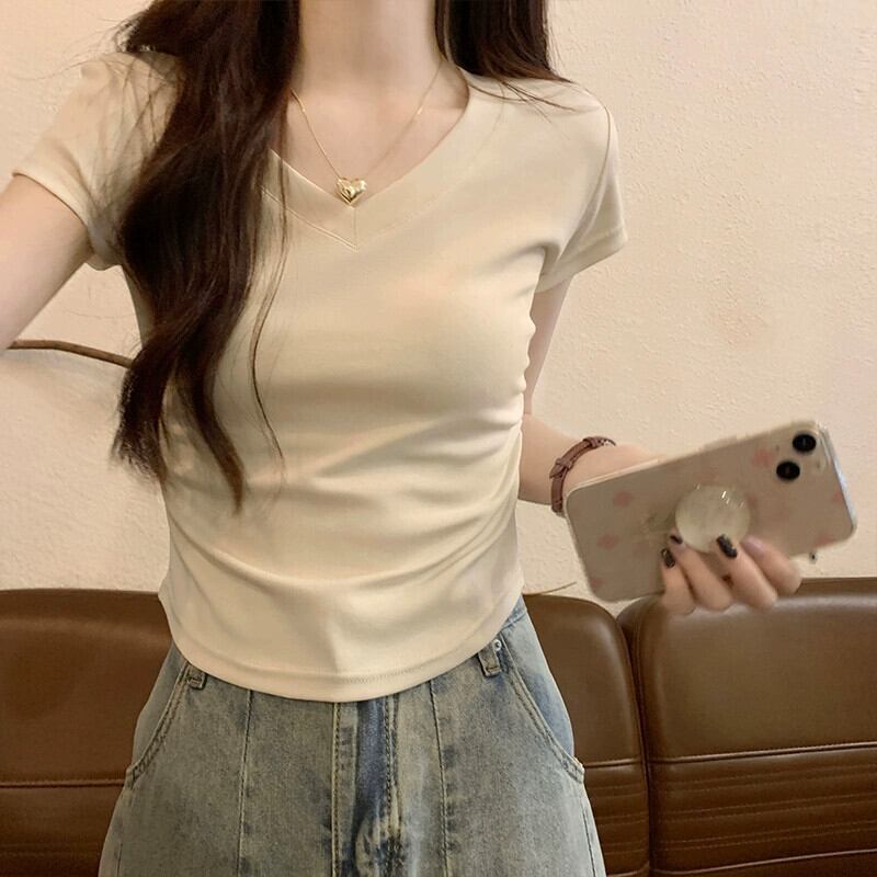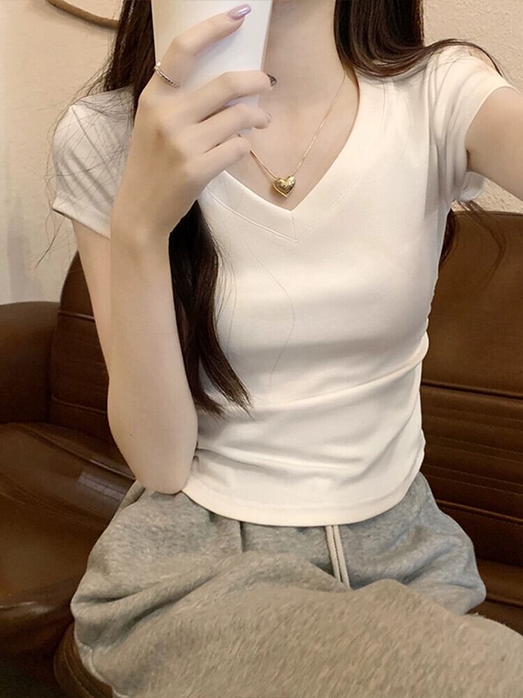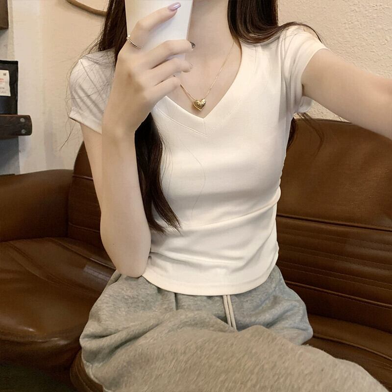 不規則な裾の湾曲した純綿半袖 t シャツの女性の夏の eign スタイルのファッション自己修養と薄いショート ショルダー v ネック トップ コットン サマー 夏物 Vネック Tシャツ ピュア 7460089938727235 | framboise21
