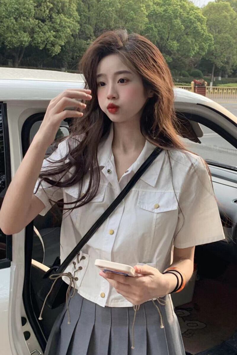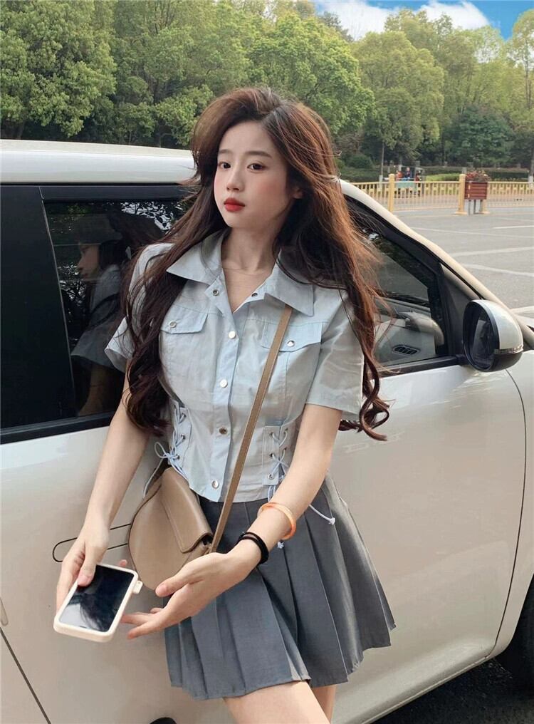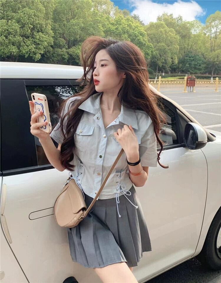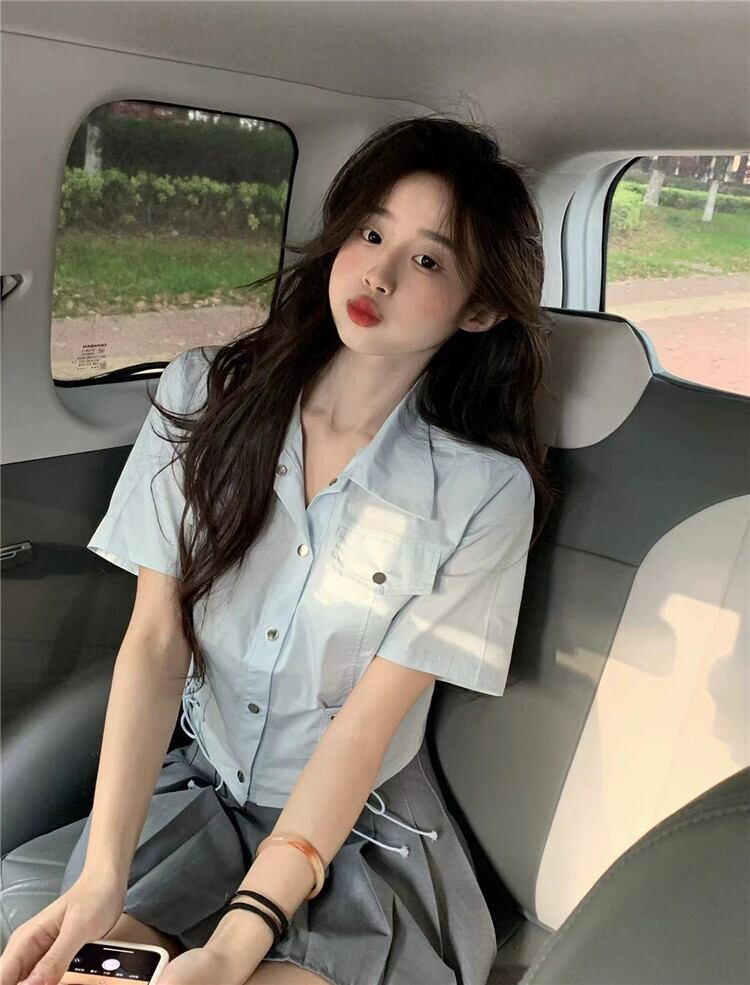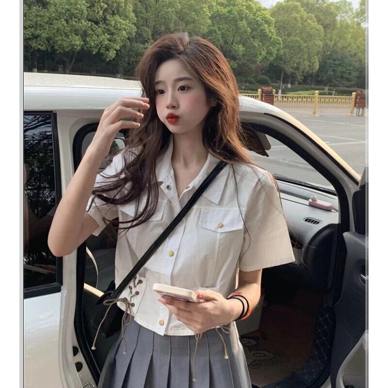 ポロカラー半袖シャツレディース夏アインスタイルデザイン自己修養の感覚スリムストラップハイウエストショートトップイン潮 ハイウェスト サマー 夏物 7460024112134193 | framboise21