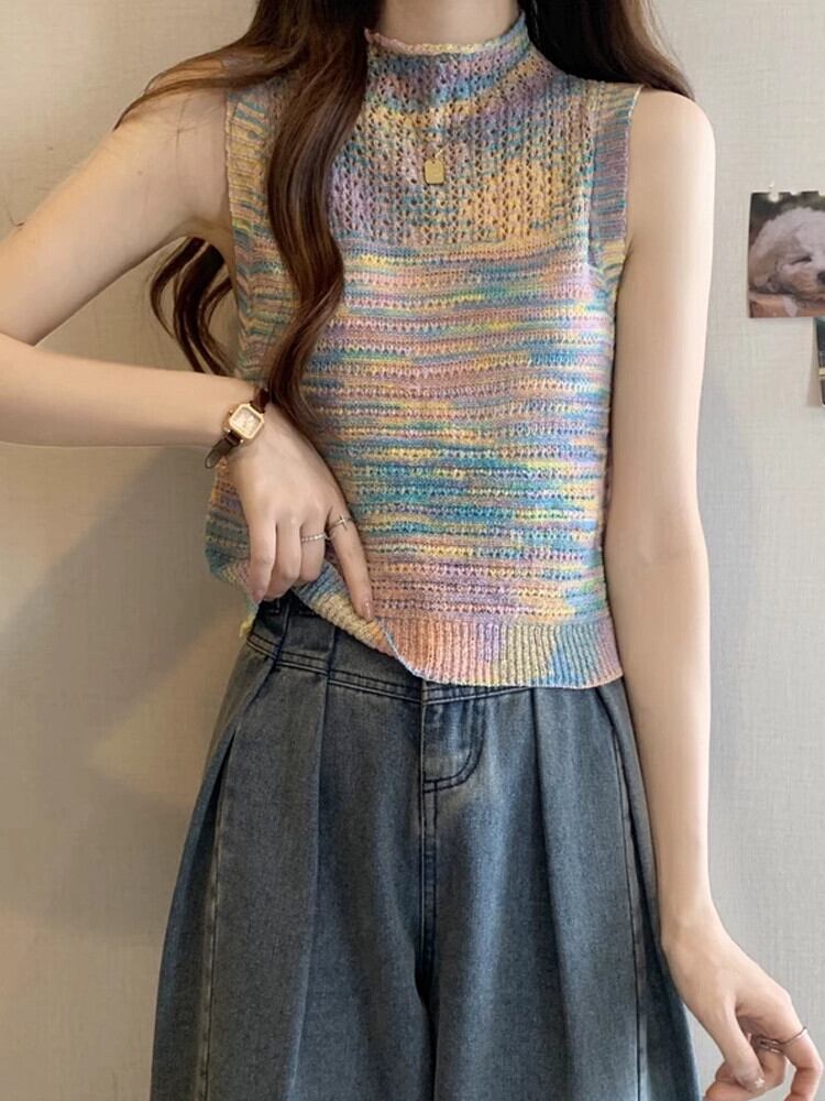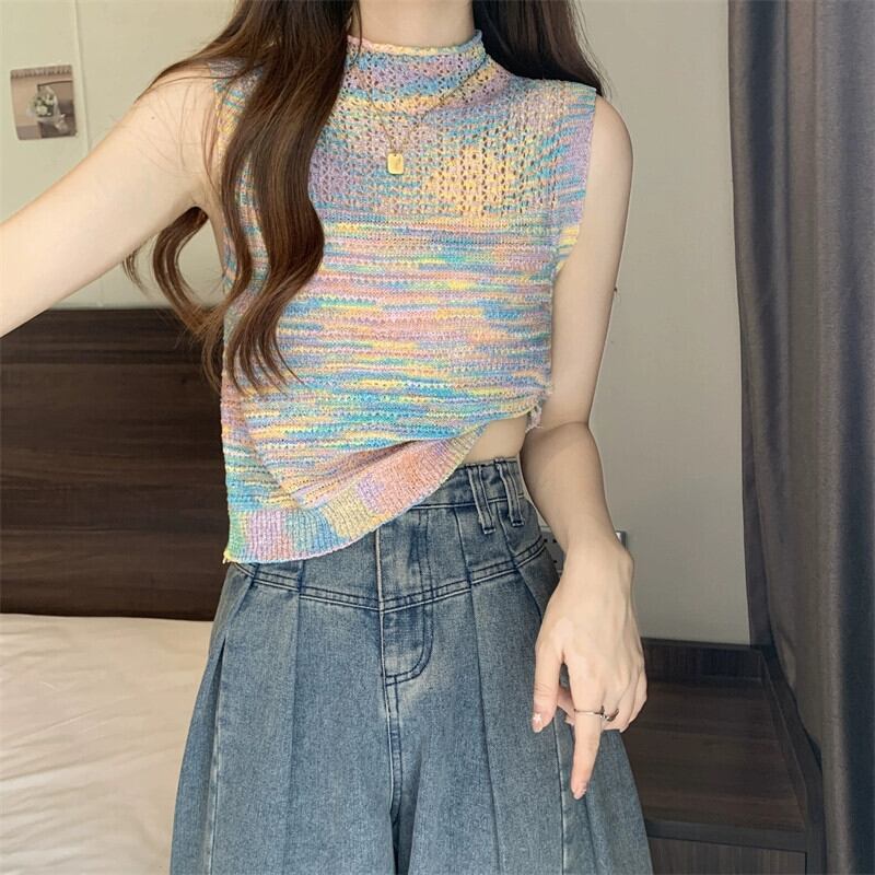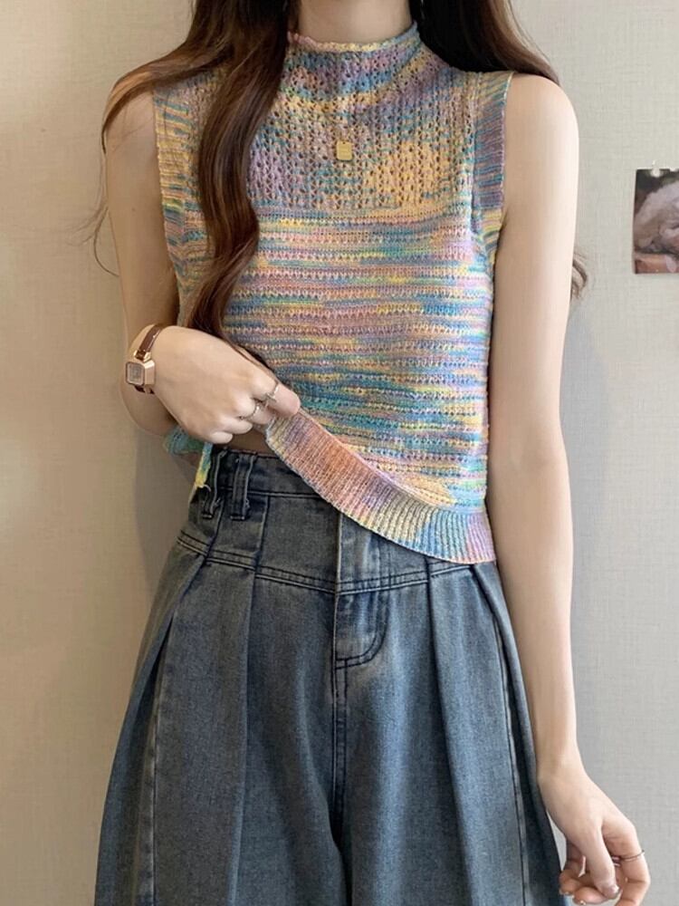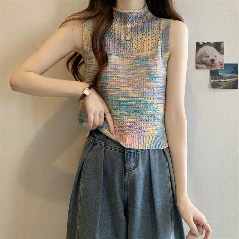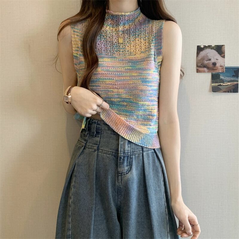 ハーフハイカラーベスト レディース 夏 アウター デザイン感 後ろ姿が美しい レインボーストライプ ニットキャミソール ノースリーブ トップス 薄手 サマー 夏物 7460057794254887 | framboise21