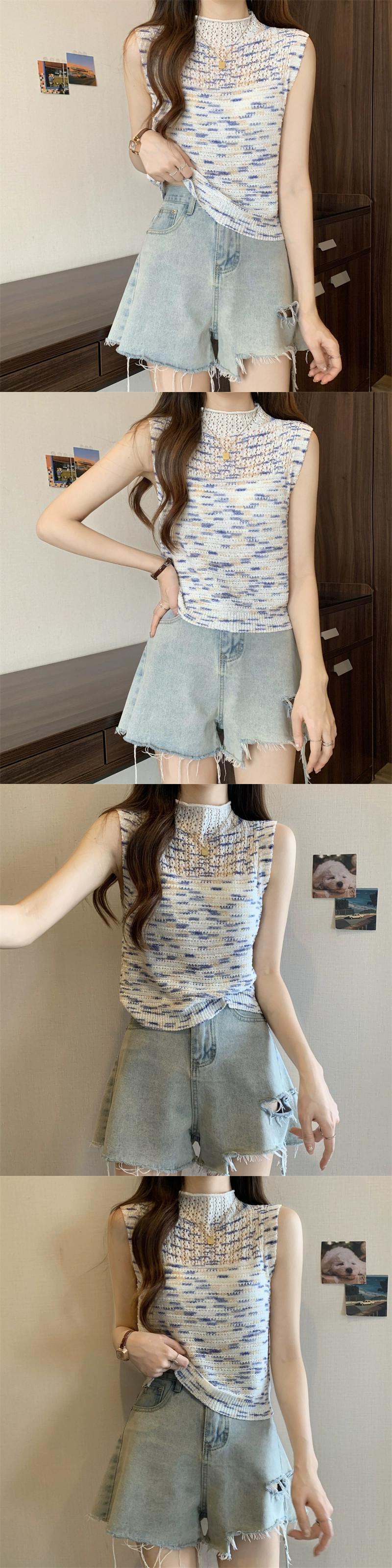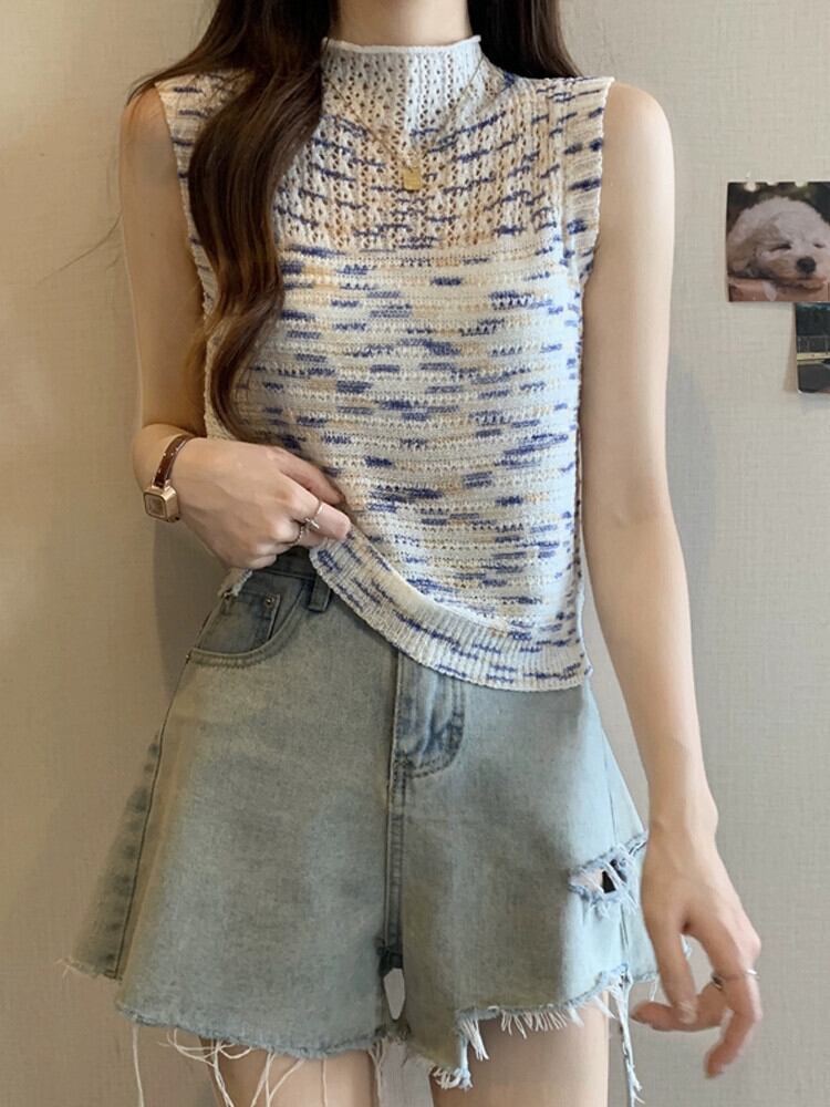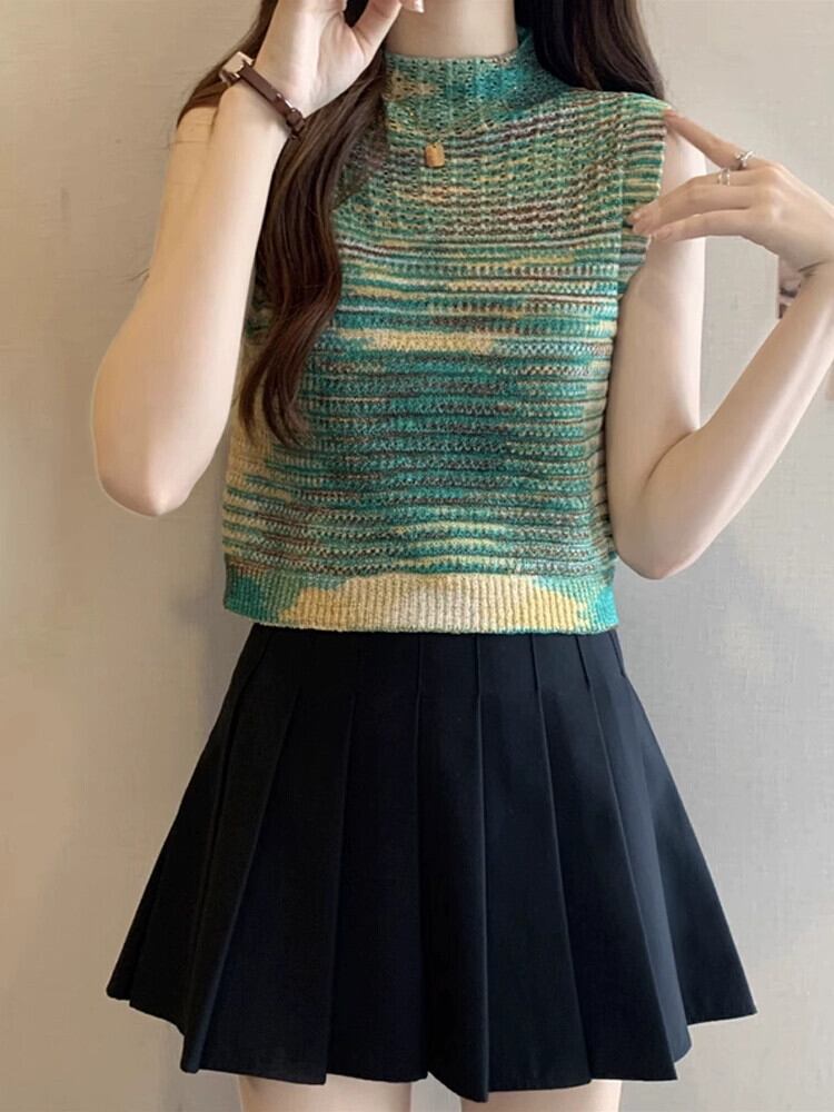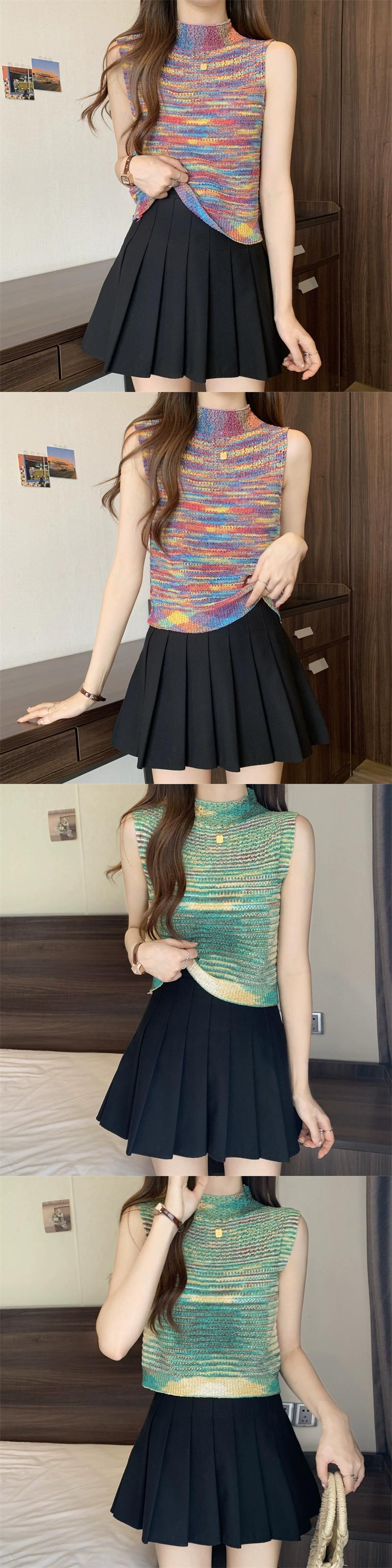 ハーフハイカラーベスト レディース 夏 アウター デザイン感 後ろ姿が美しい レインボーストライプ ニットキャミソール ノースリーブ トップス 薄手 サマー 夏物 7460057794254887 | framboise21
