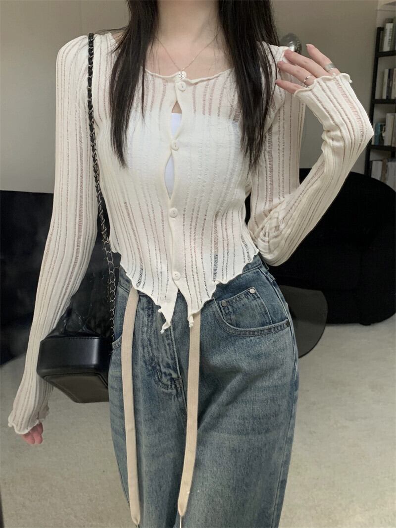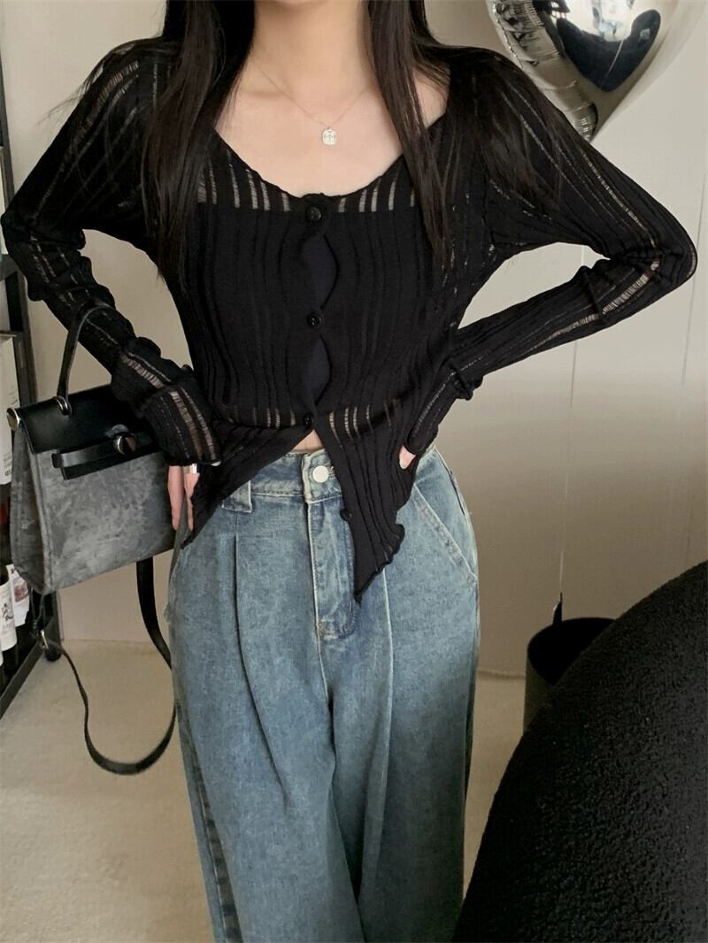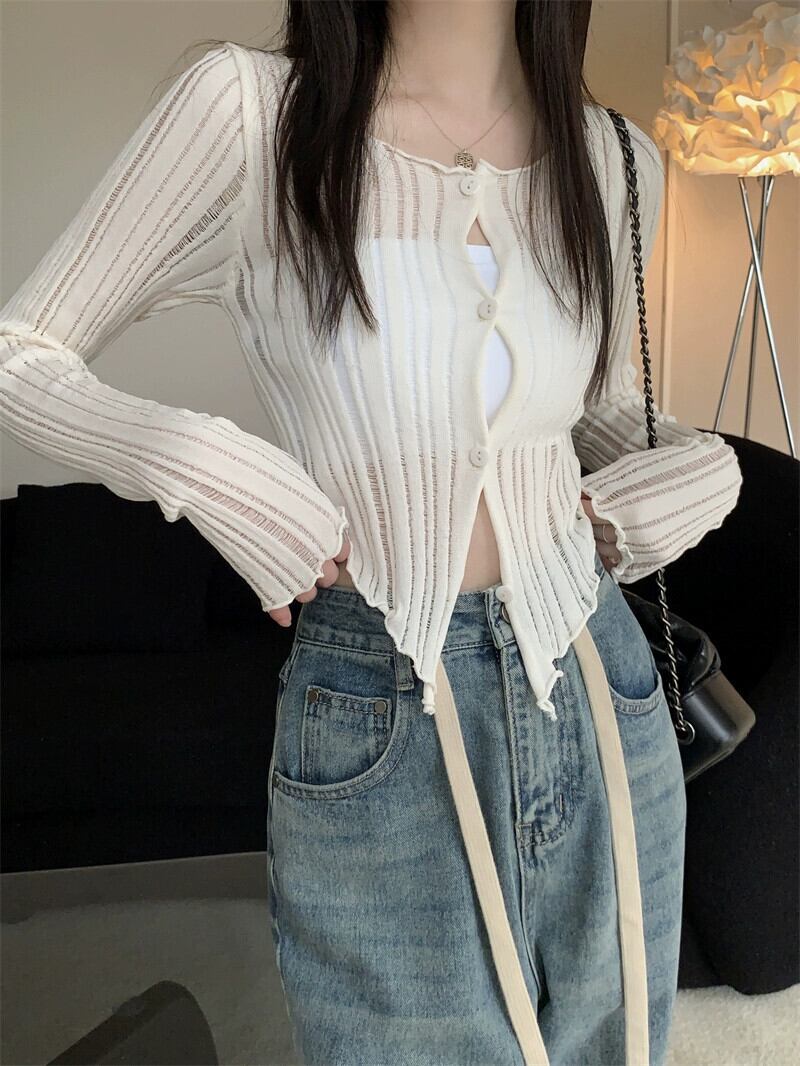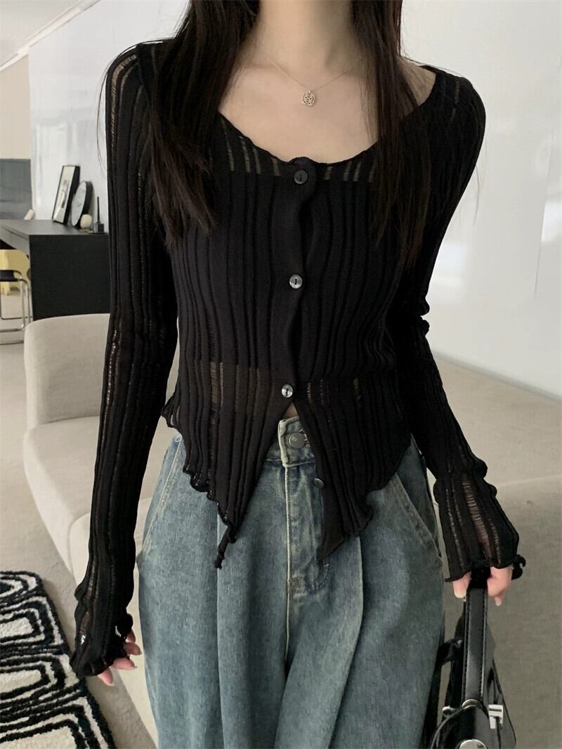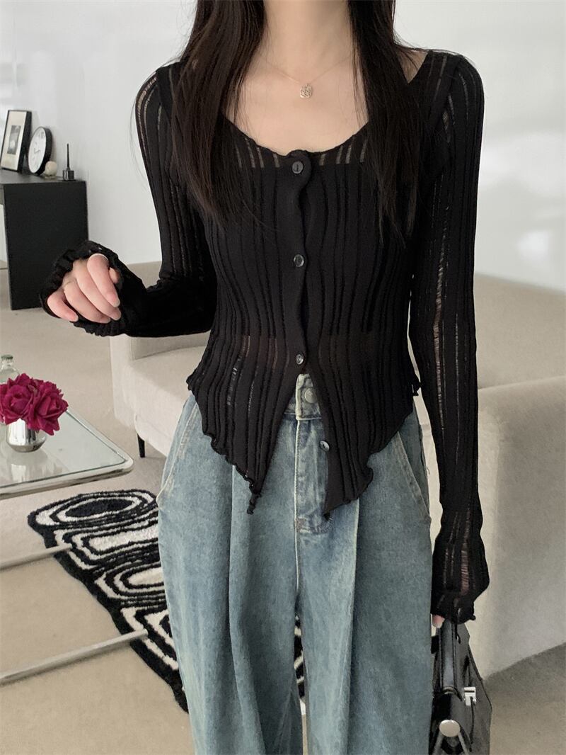 ブラックアイスシルク日焼け止めカーディガン女性の夏のファッションサスペンダー薄セクションブラウス不規則なショートニットジャケット サマー 夏物 7460040723619658 | framboise21