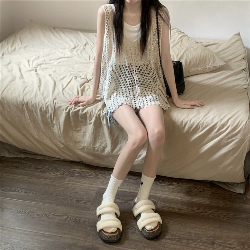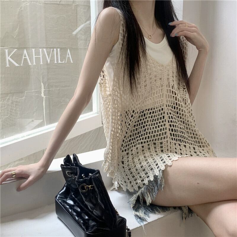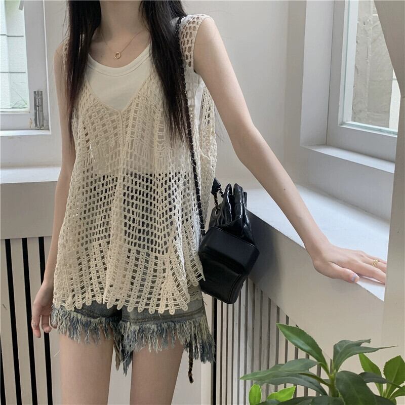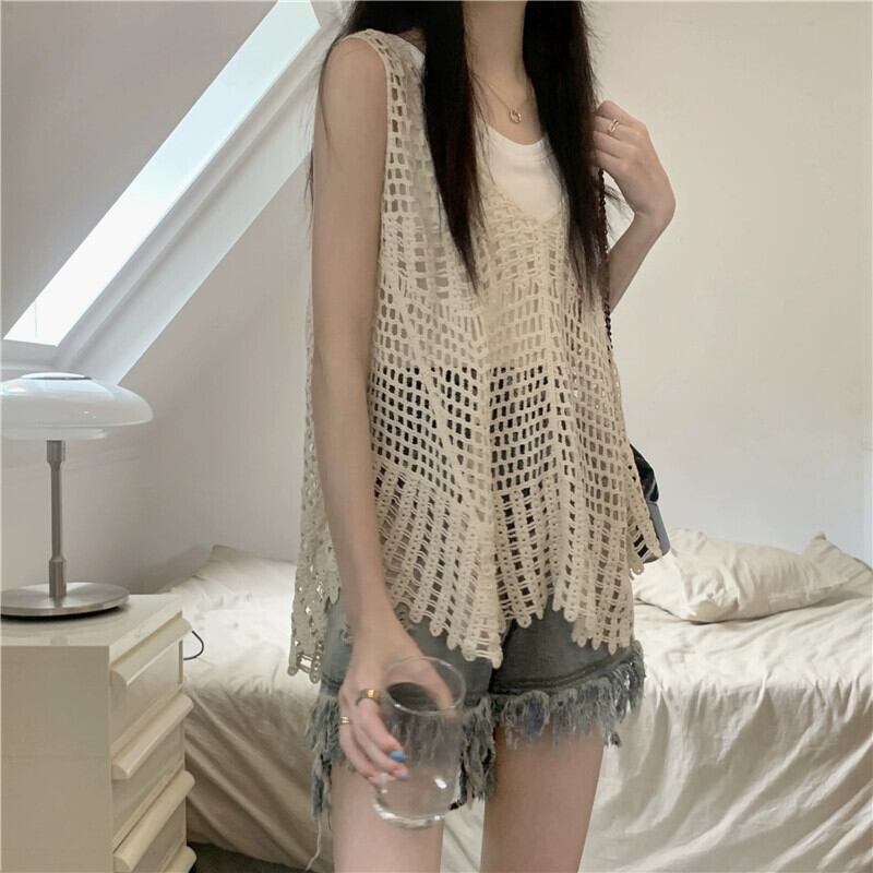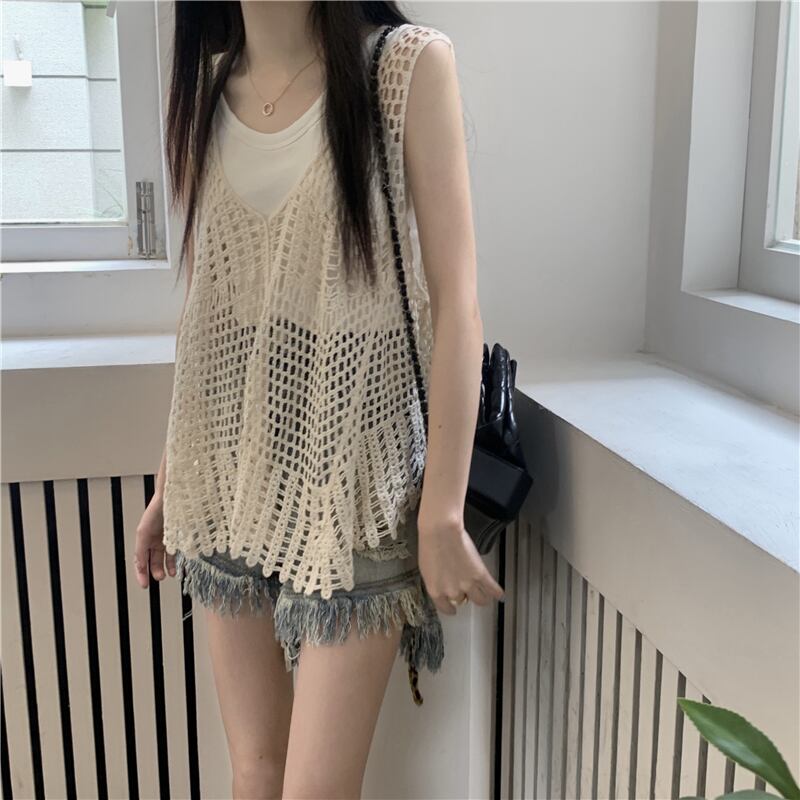 ニット中空キャミソール女性の夏のアウターウェアブラウスデザインセンスレトロなルーズレイヤードノースリーブベストショルダートップ レッド サマー 夏物 7460036965222210 | framboise21