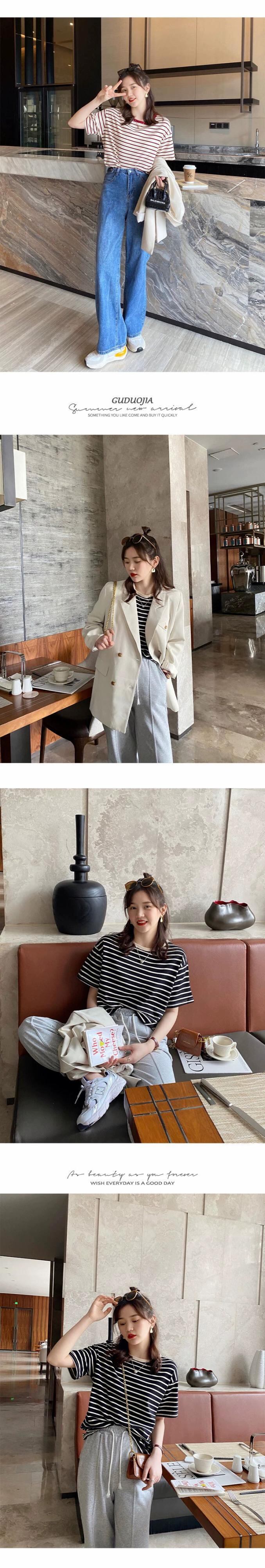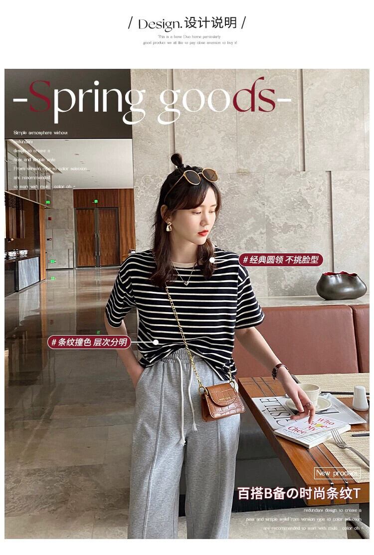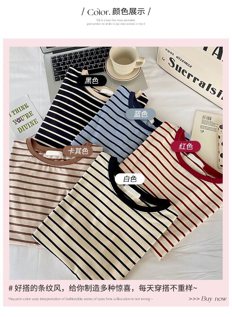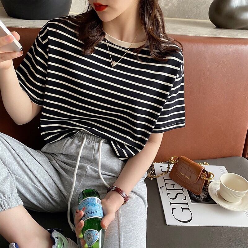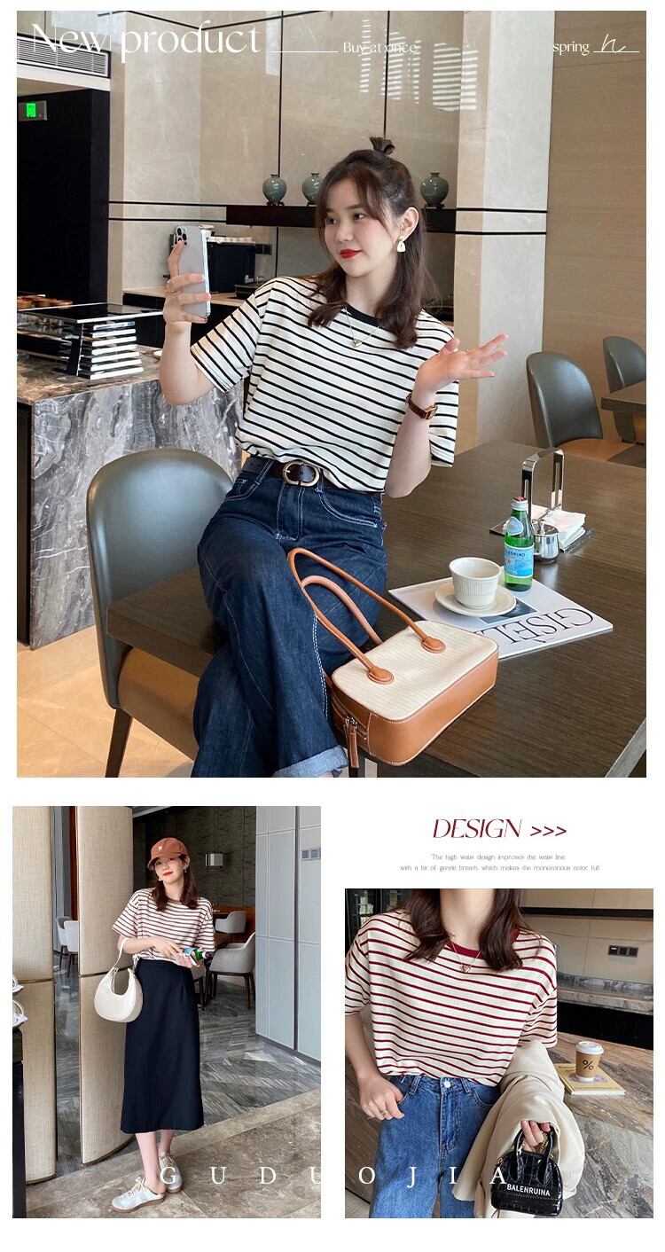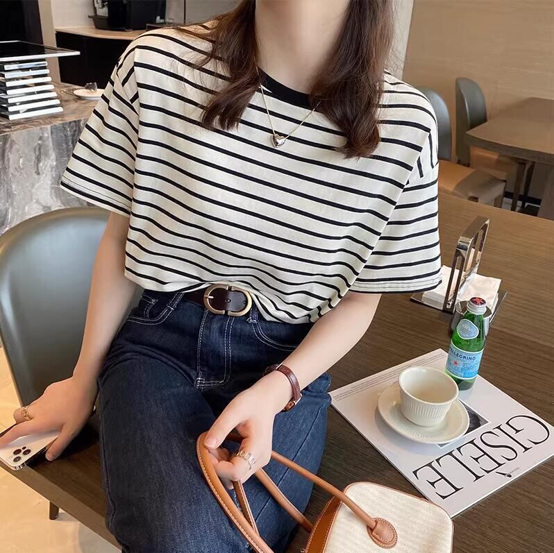 グリーンストライプ半袖Tシャツレディース2023年夏新バージョンゆったりデザインセンスオールマッチラウンドネック半袖トップス サマー 夏物 Oネック 7460064588890853 | framboise21