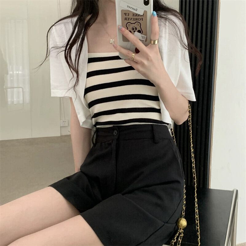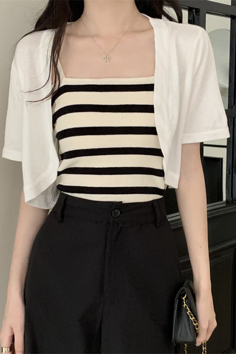 白い薄いニット半袖小さなカーディガン ジャケット、ストラップとスモックの短いアイス シルク トップの夏の小さなチョッキ ショート ホワイト サマー 夏物 7460098350899489 | framboise21
