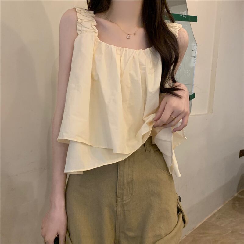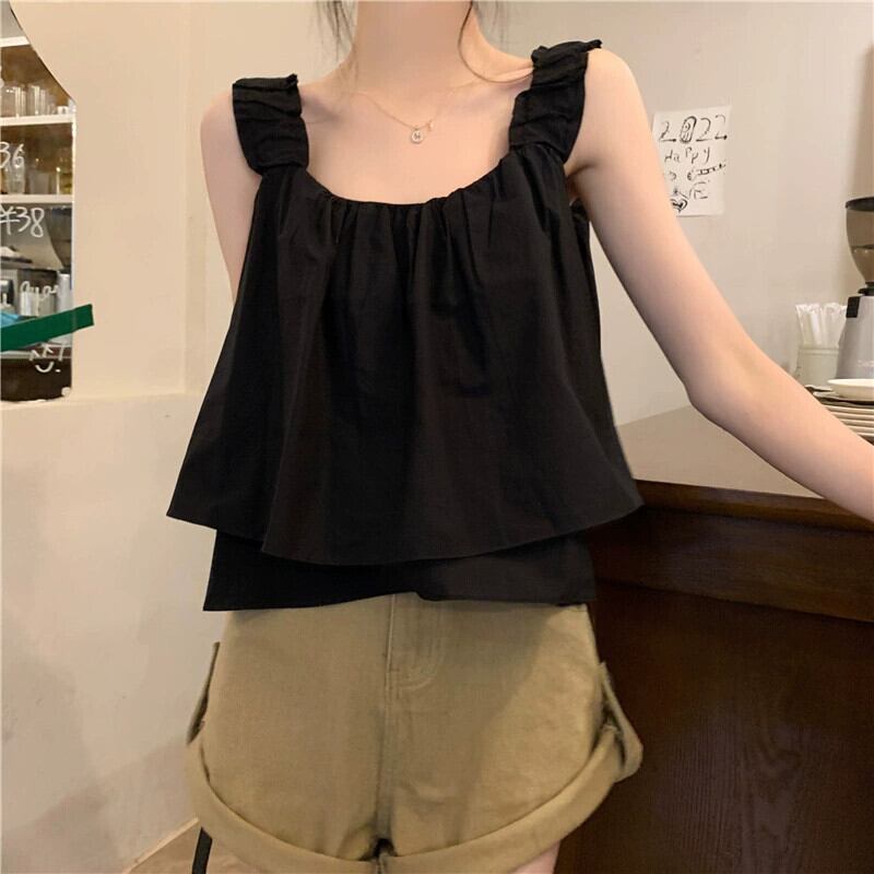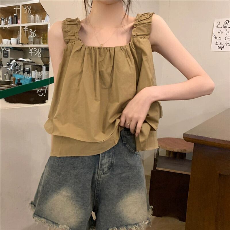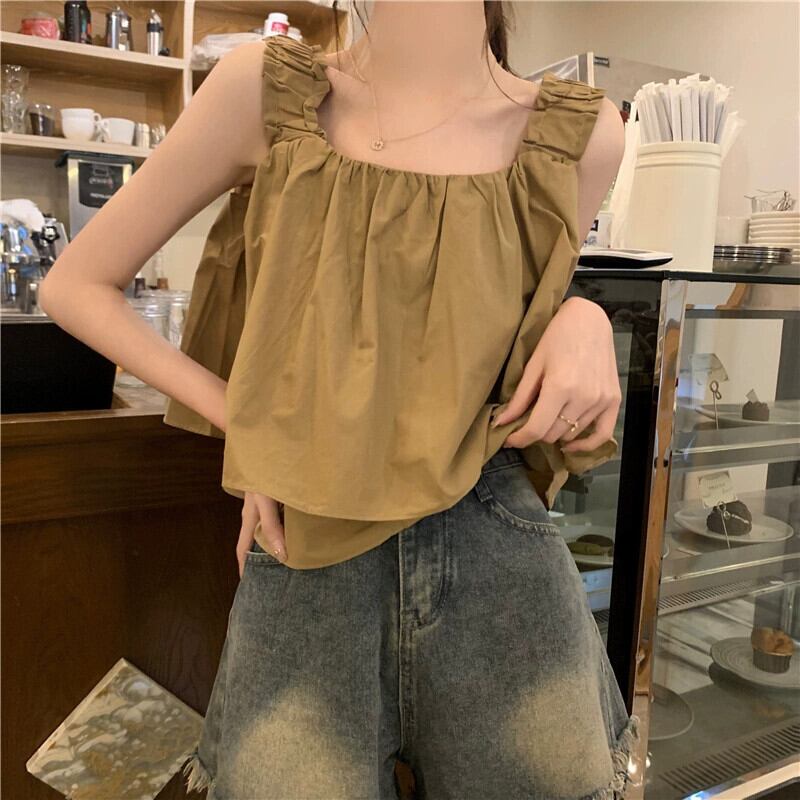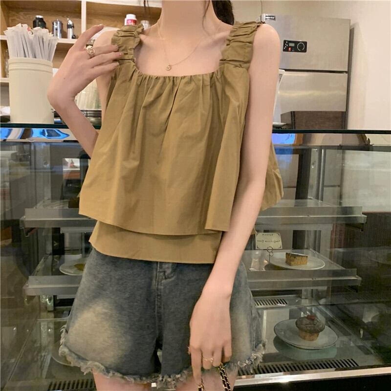 スクエアカラー ノースリーブ ベスト レディース 夏 アウター フレンチ レトロ デザイン シック プリーツ ショート ふわふわ キャミソール トップス サマー 夏物 スクウェア 7460075577090640 | framboise21
