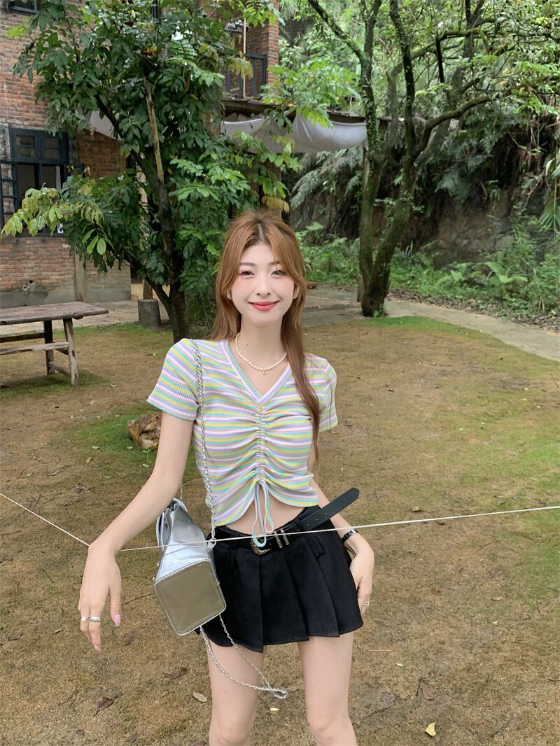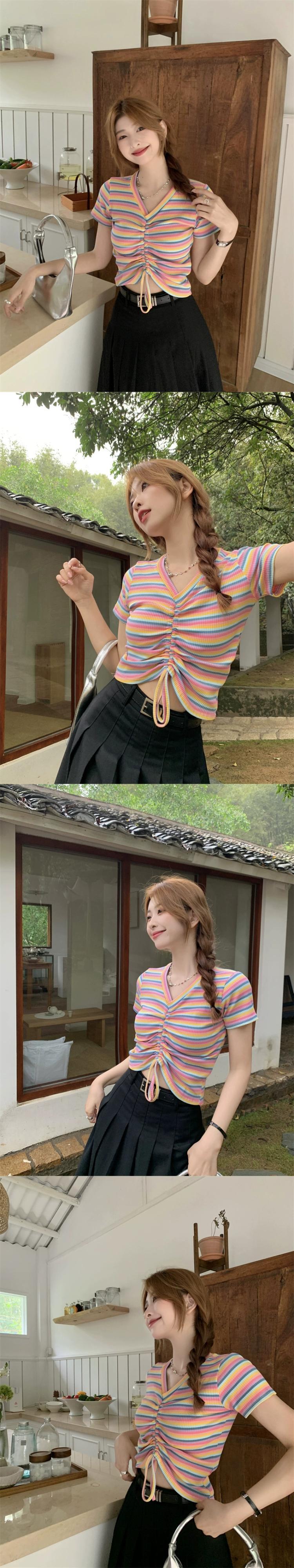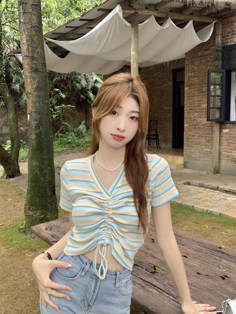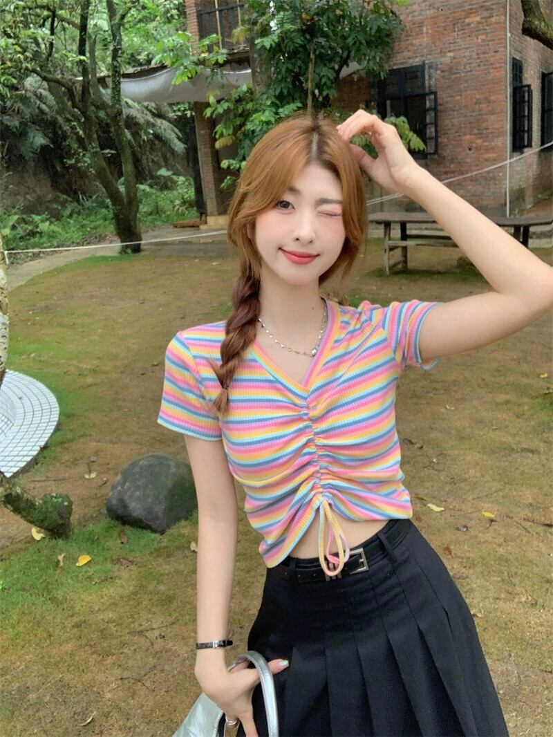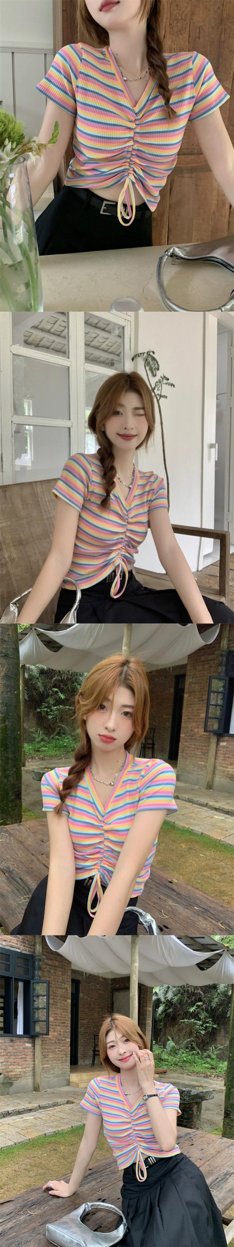 レインボーストライプ半袖Tシャツレディース夏のファッションデザインセンスシックなスリムハイウエストショートドローストリングVネックトップ ハイウェスト サマー 夏物 7460065872950215 | framboise21