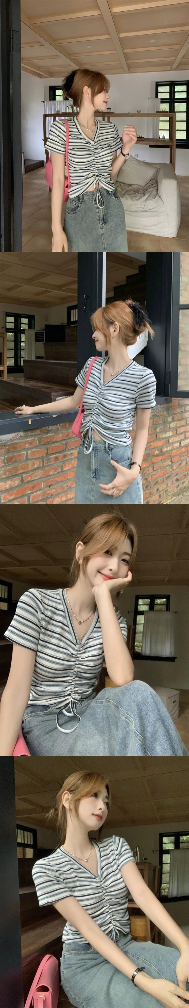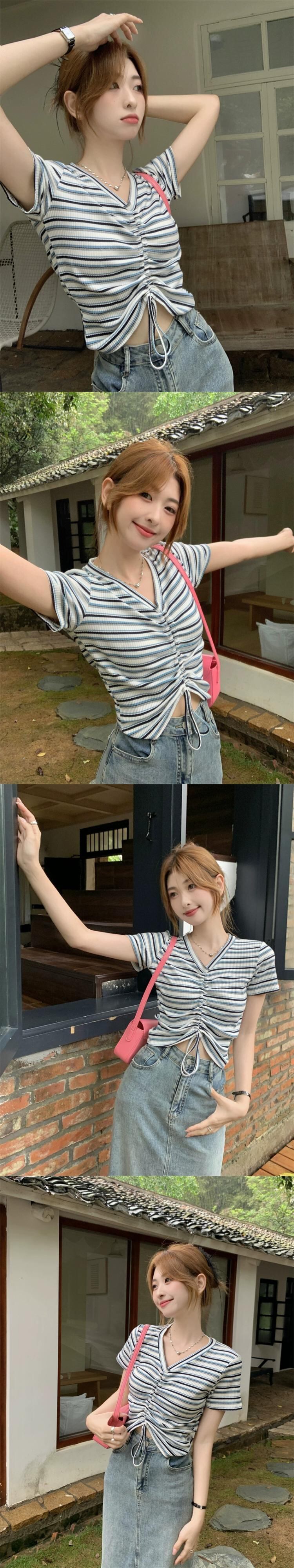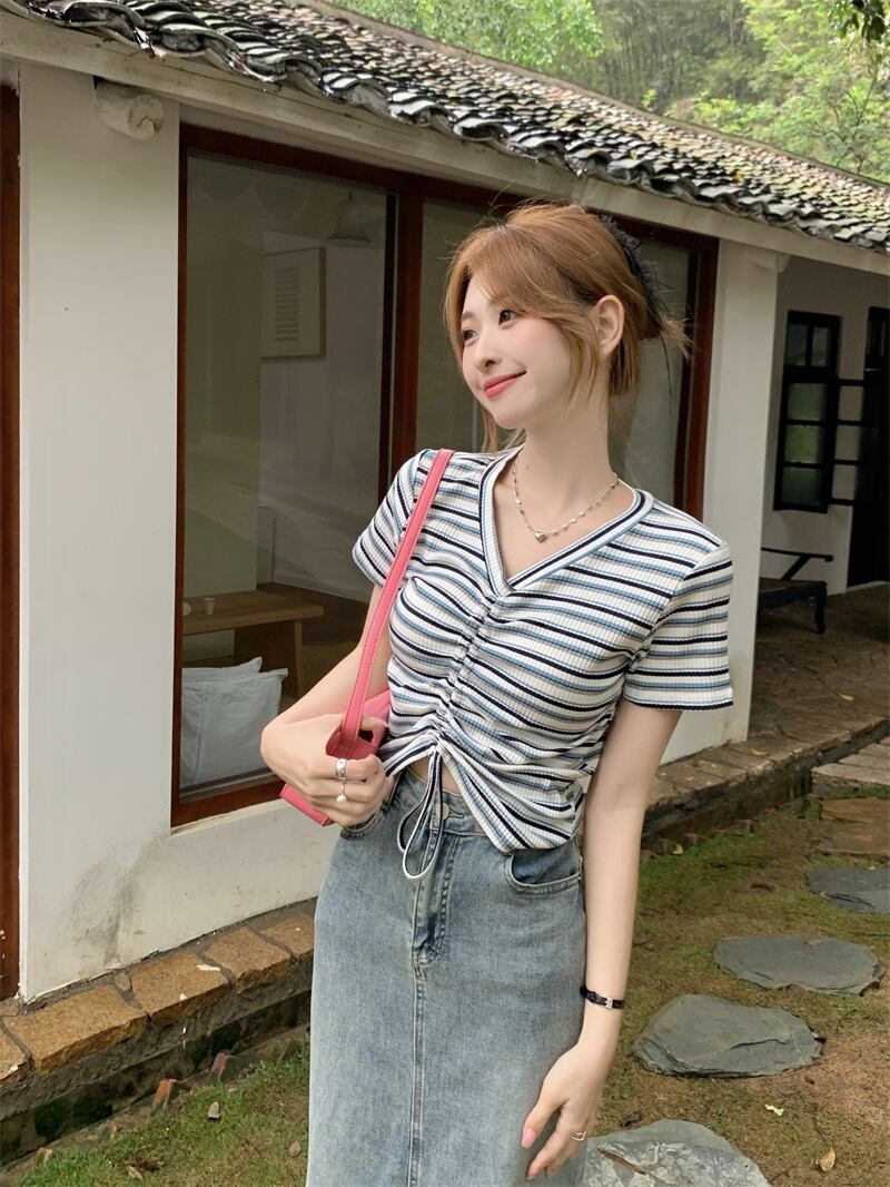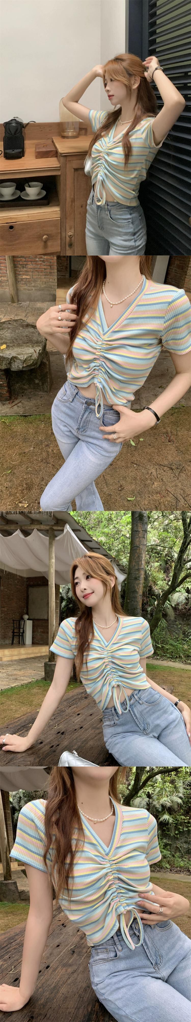 レインボーストライプ半袖Tシャツレディース夏のファッションデザインセンスシックなスリムハイウエストショートドローストリングVネックトップ ハイウェスト サマー 夏物 7460065872950215 | framboise21