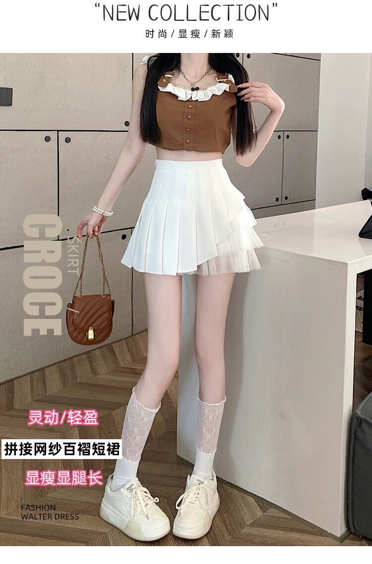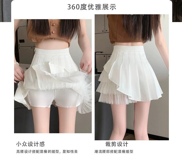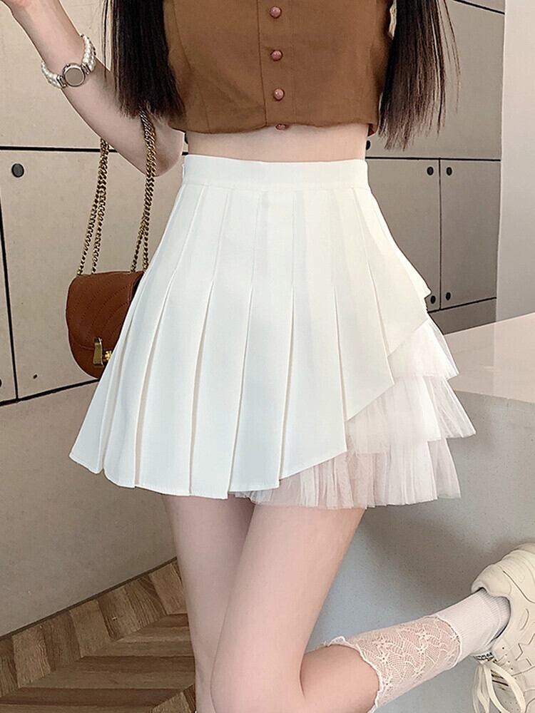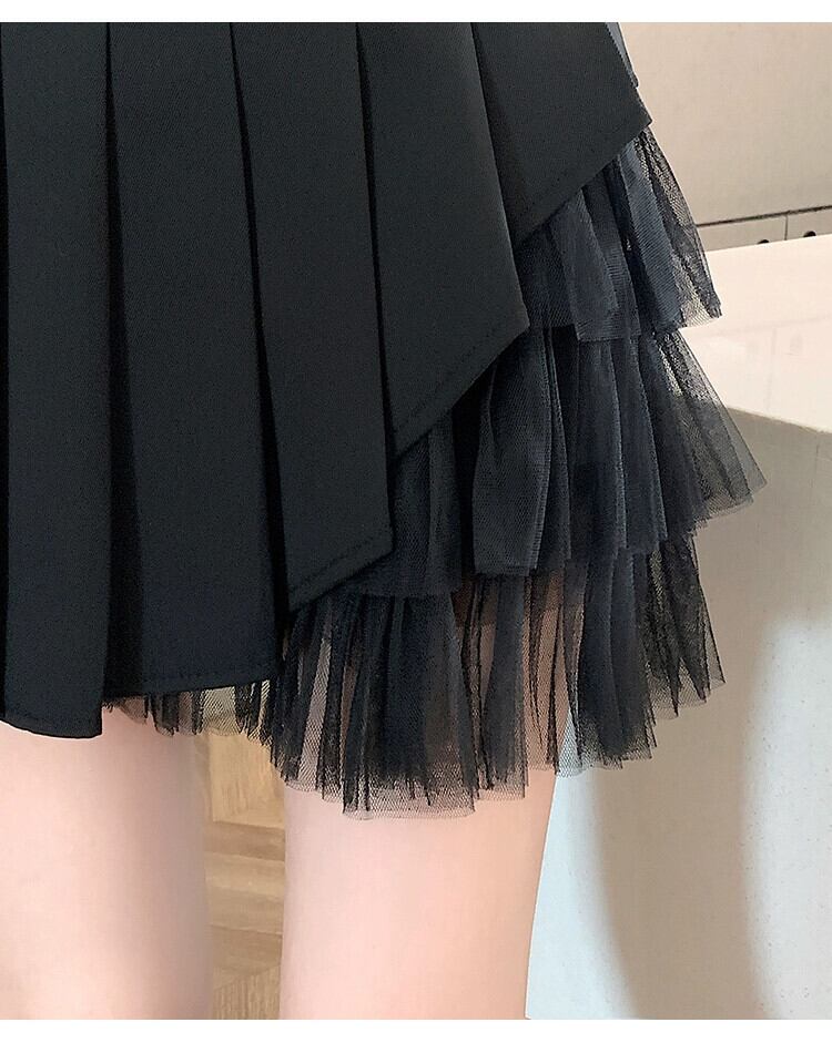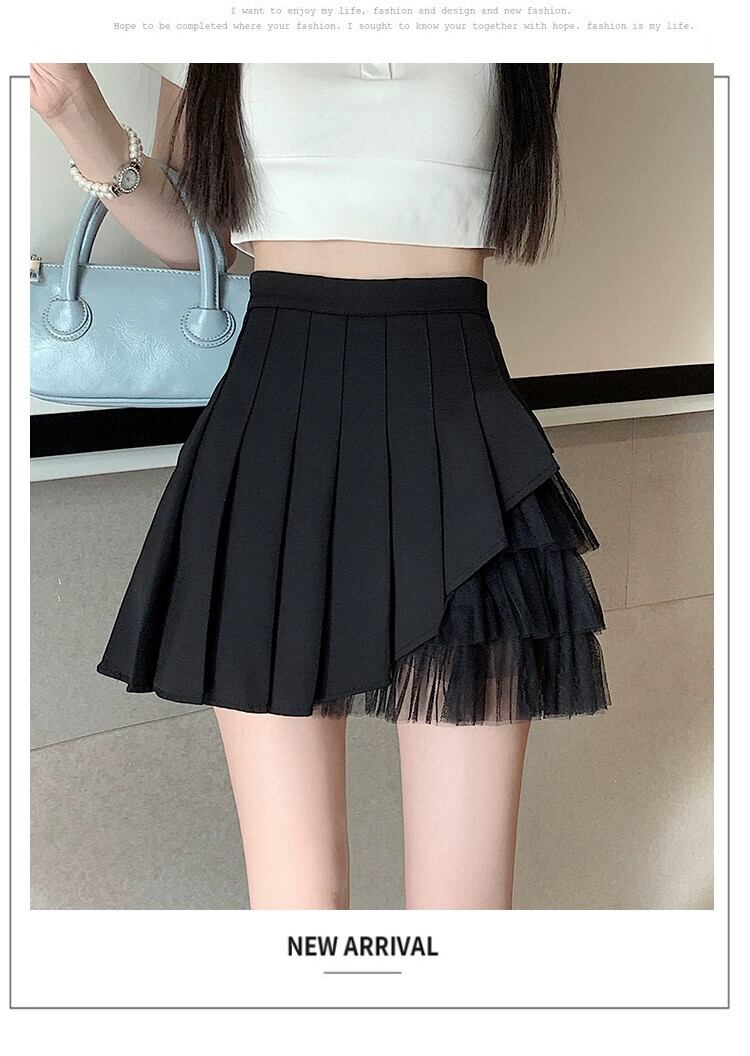 黒のハイウエストプリーツスカートの女性の夏のハイエンドステッチレース A ラインスカート痩身オールマッチメッシュスカート ブラック サマー 夏物 Aライン 7460014966406694 | framboise21