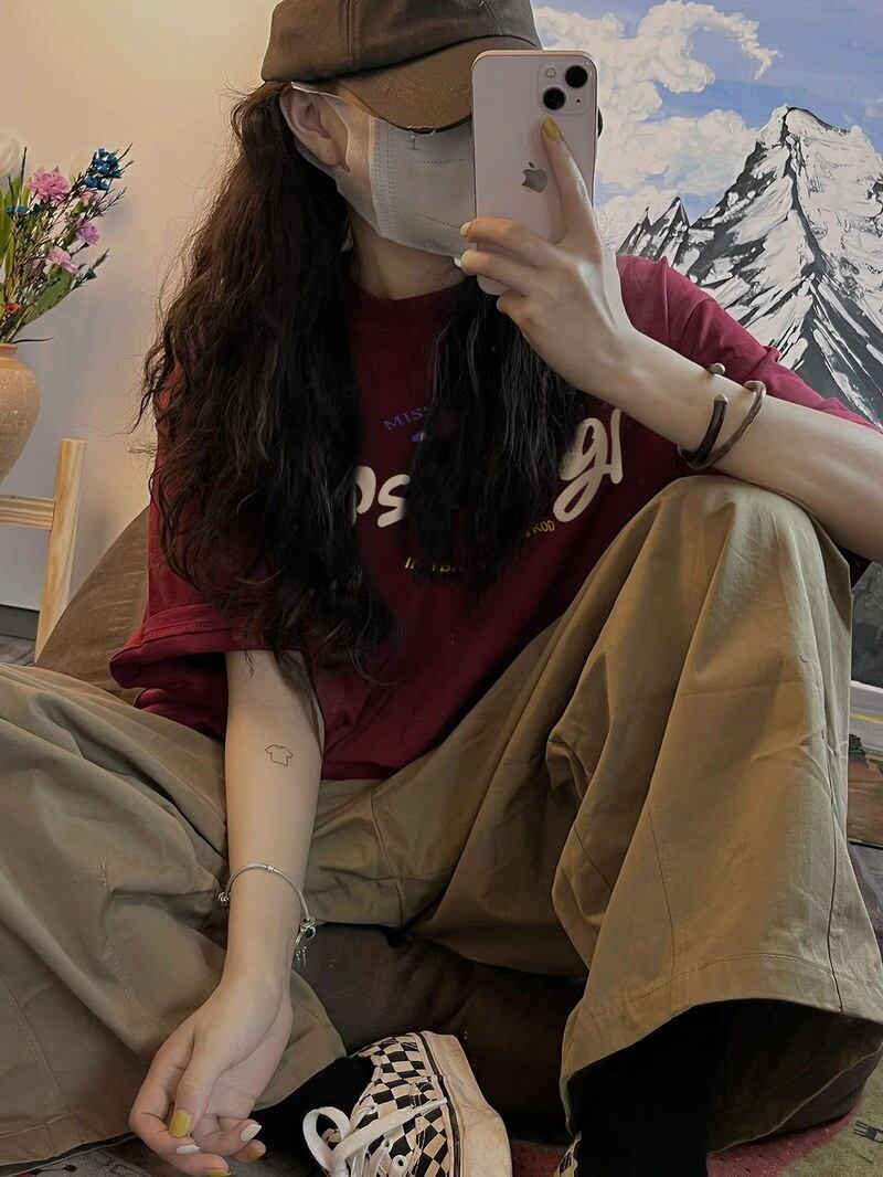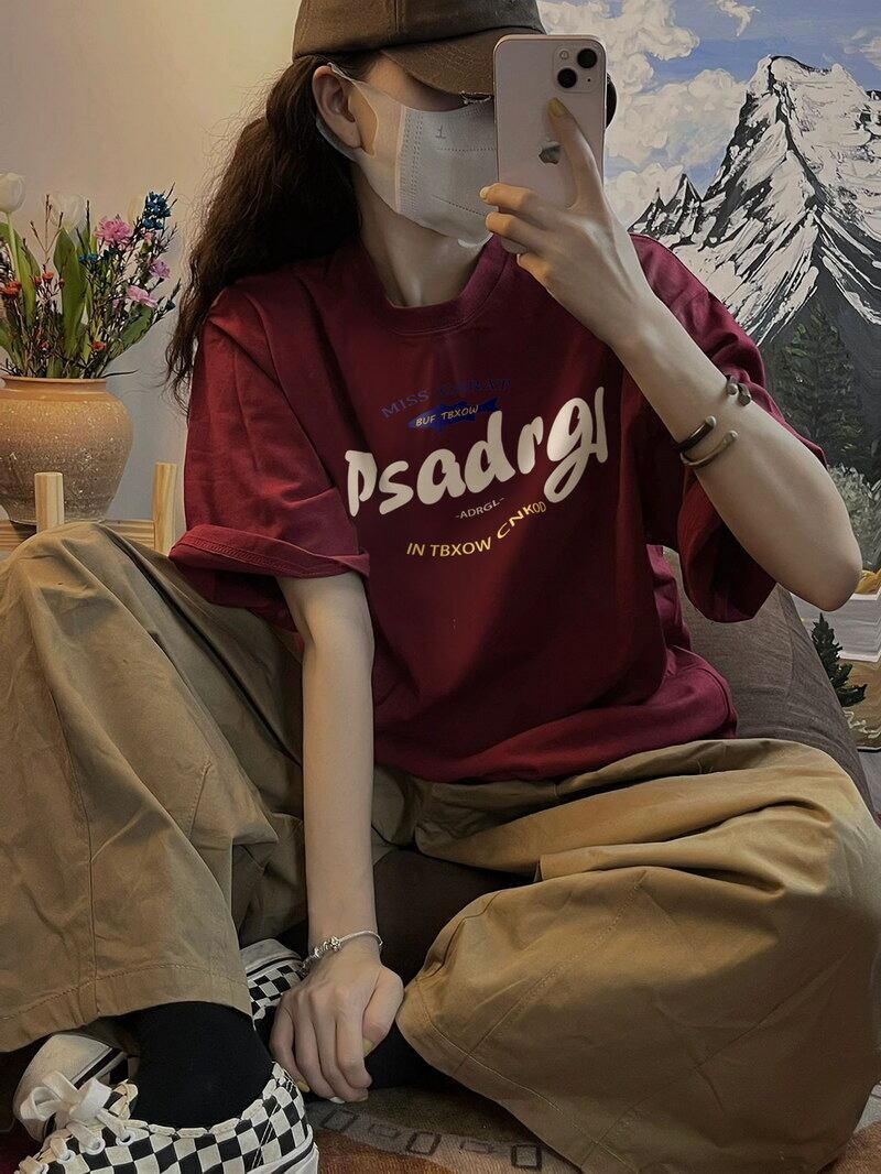 ワインレッドコットン半袖Tシャツレディース夏アメリカンレトロ香港風デザインセンスミドル丈ショルダーラウンドネックトップ サマー 夏物 Oネック 7460094033506027 | framboise21