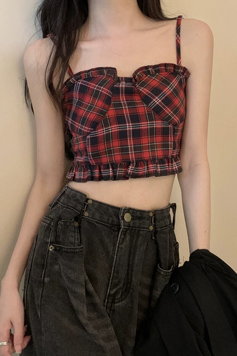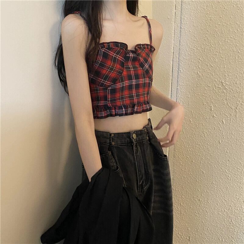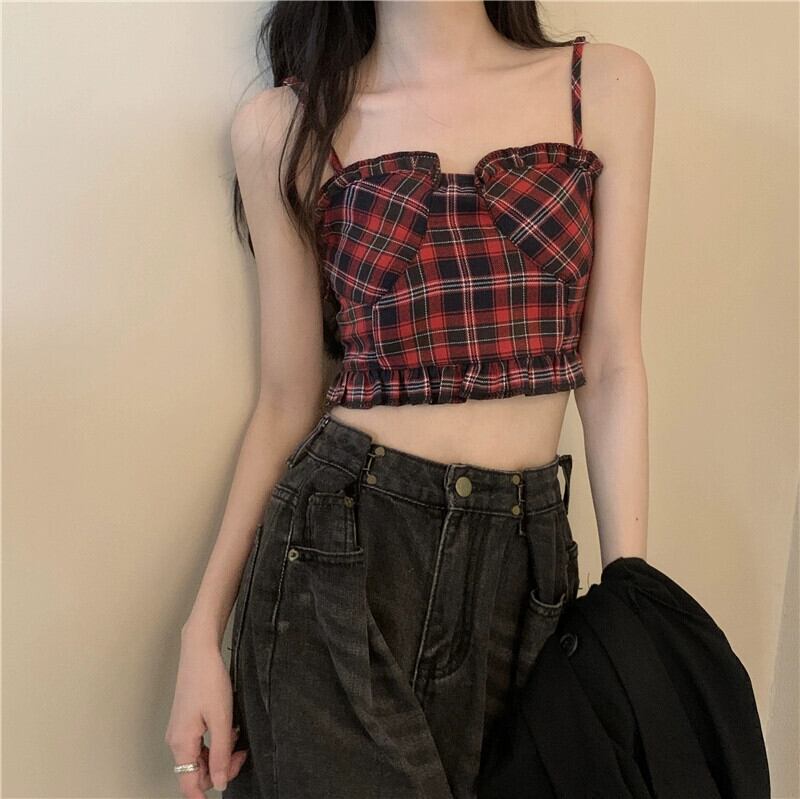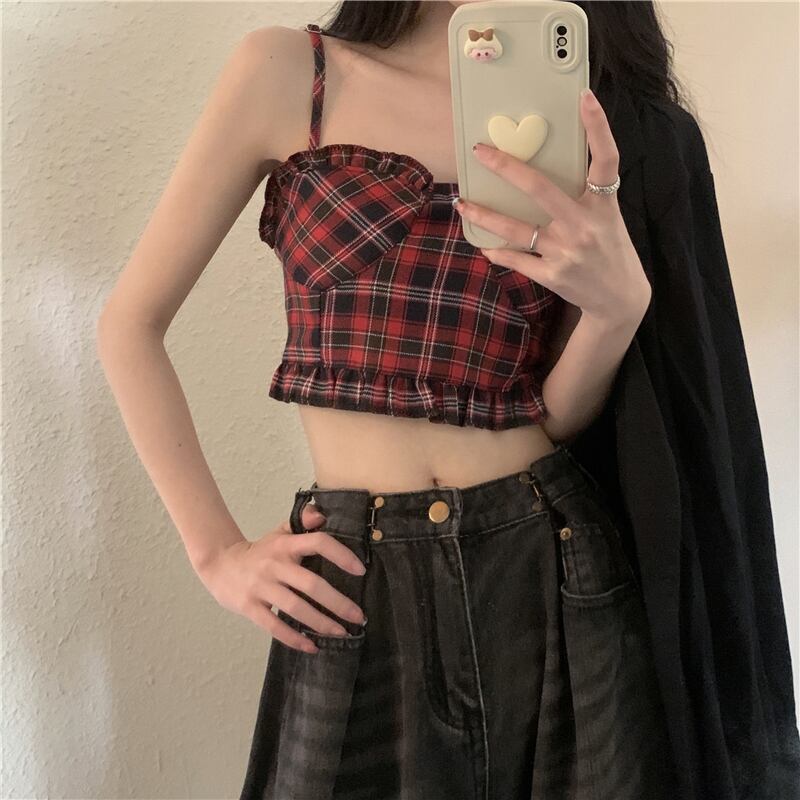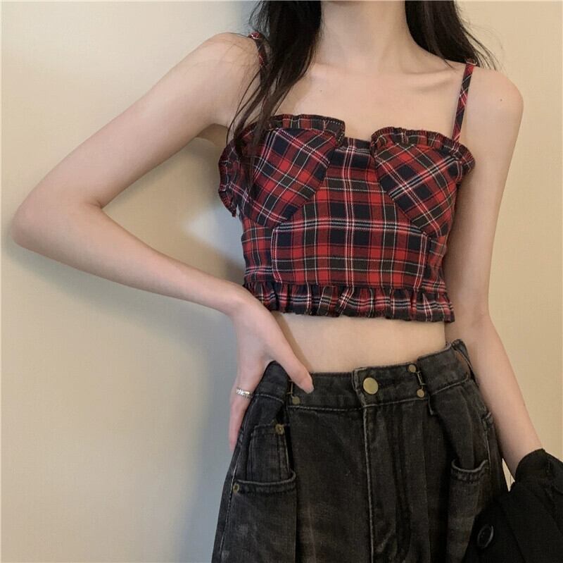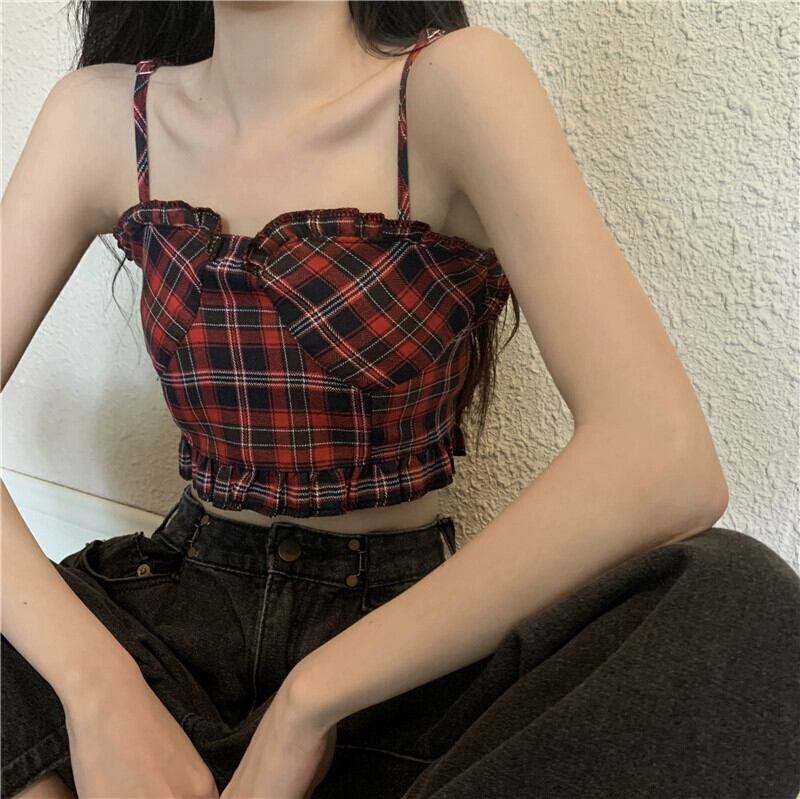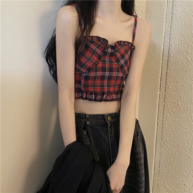 レッドチェック柄キャミソール女性の夏フレンチセンセーションスパイスガールズアウターウェアラップ胸インナーボトムチューブトップトップ サマー 夏物 7460078272278847 | framboise21