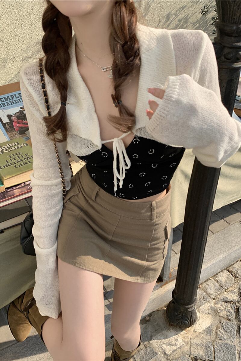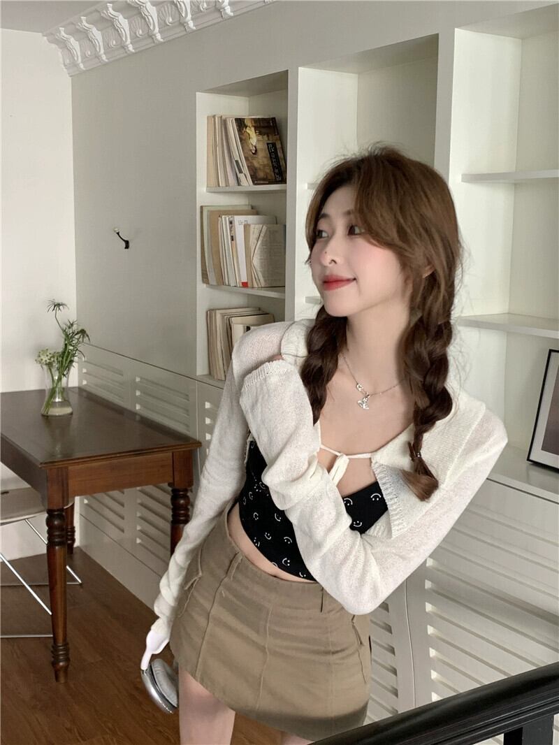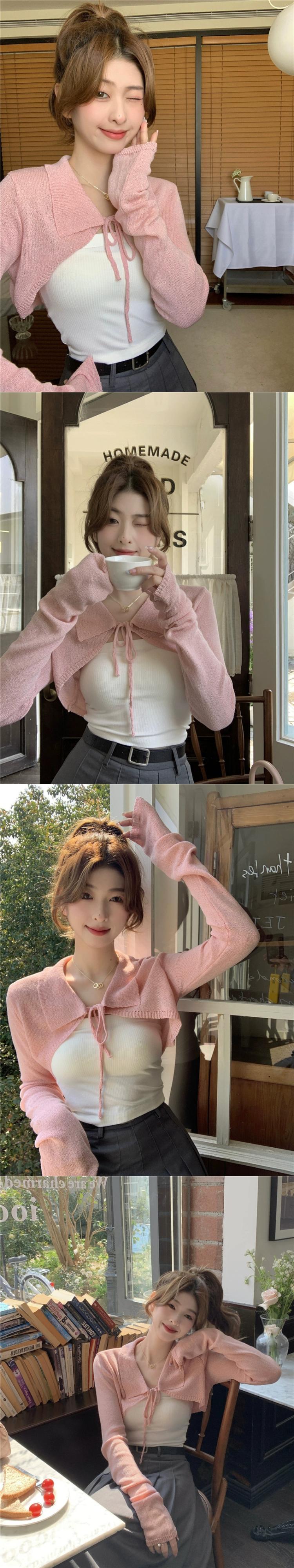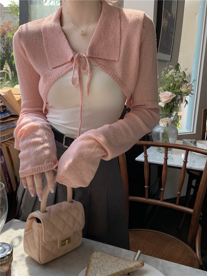 白い日焼け止め小さなカーディガン女性の夏、サスペンダーと薄いニット ショール ブラウス ショート ポロカラー トップ ホワイト サマー 夏物 7460041059312366 | framboise21