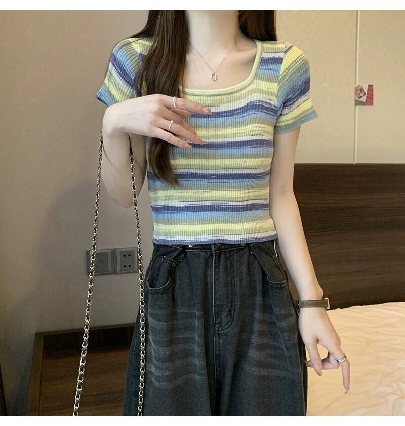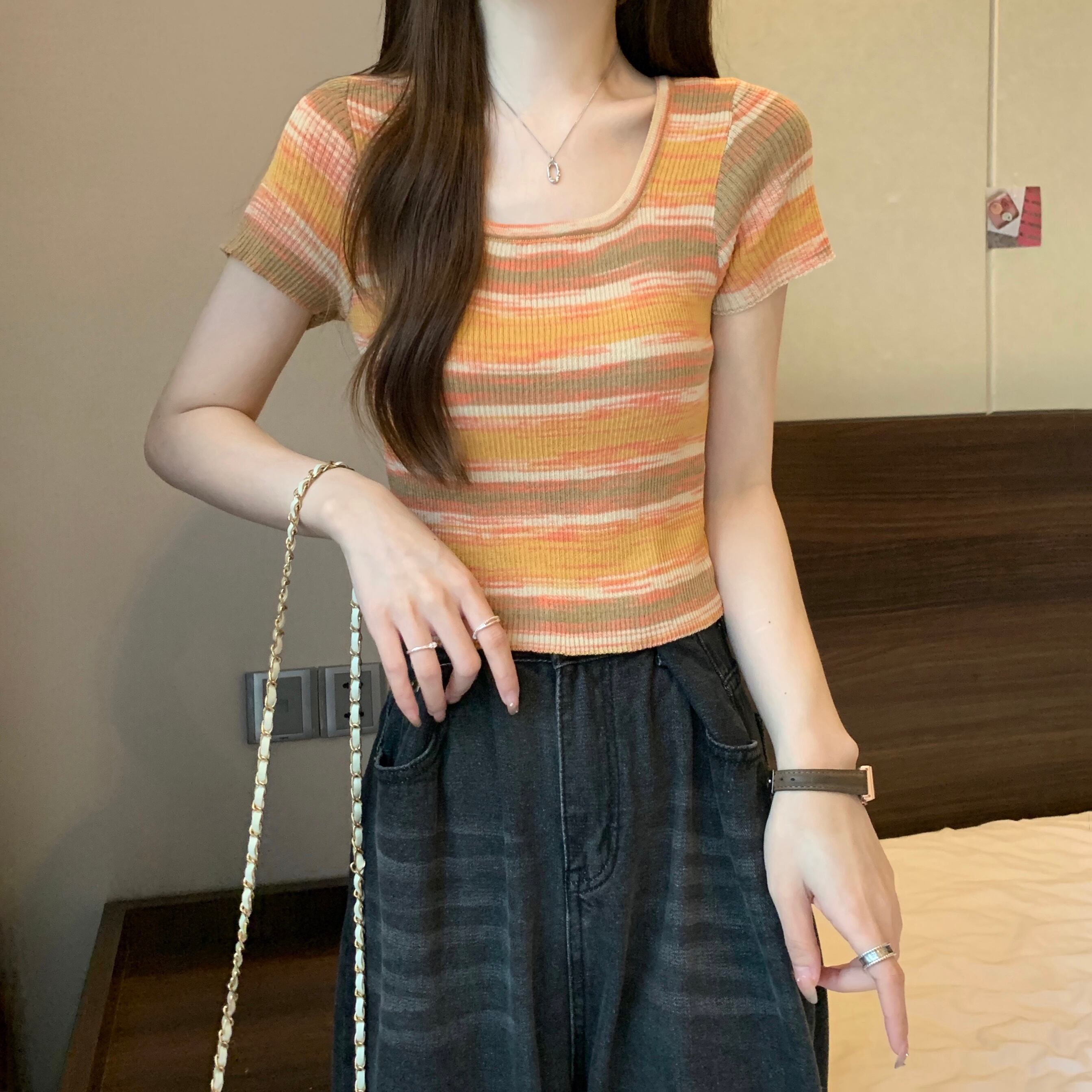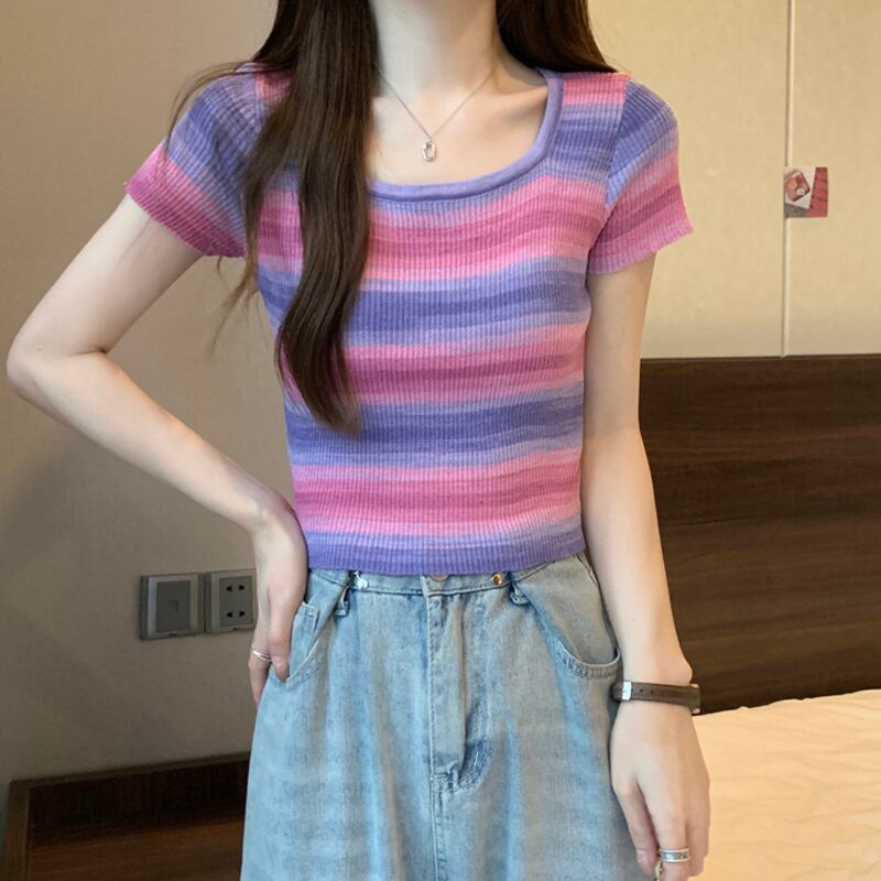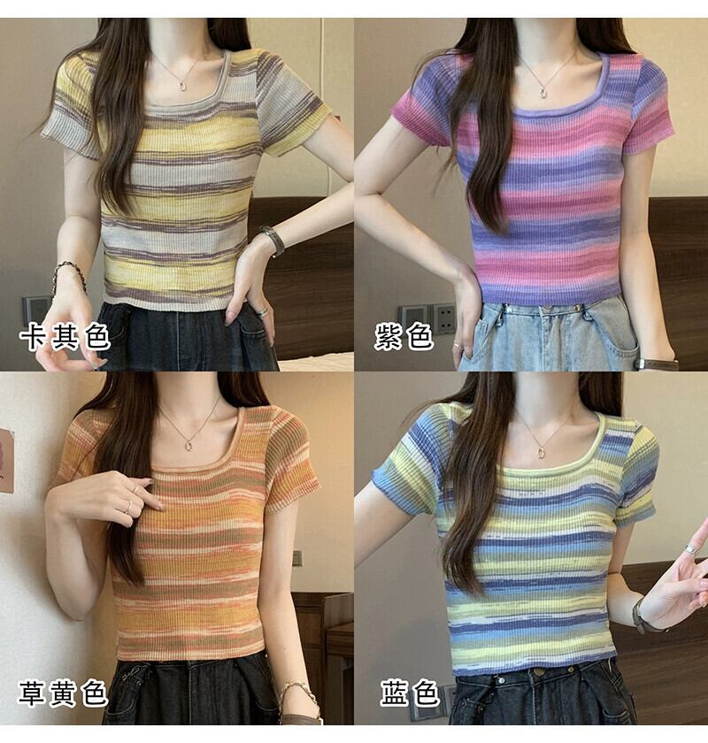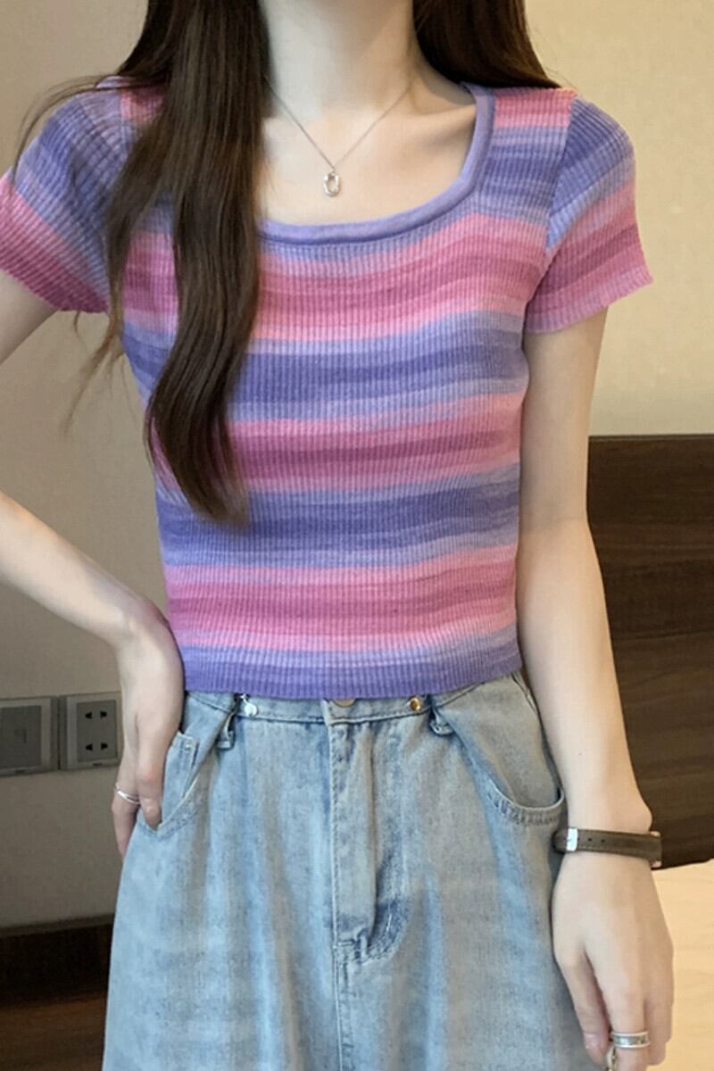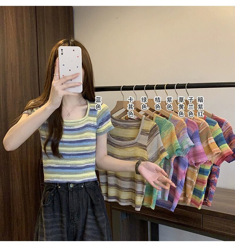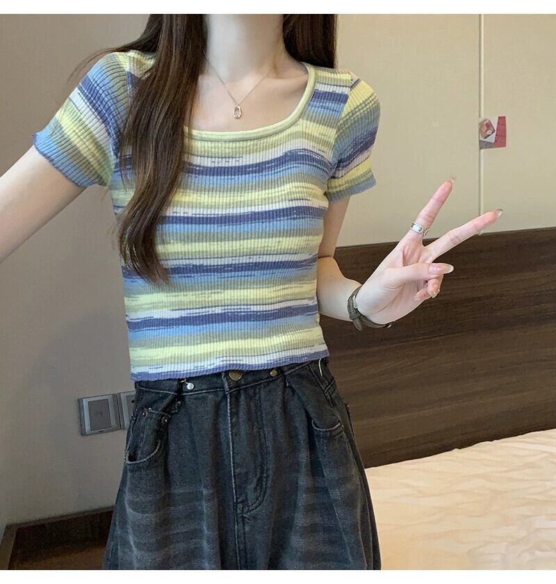 アイスシルクニットストライプTシャツレディース2023年夏新デザイン自己修養感覚とEignスタイルショートスクエアカラー半袖トップ サマー 夏物 スクウェア 7460029730178229 | framboise21