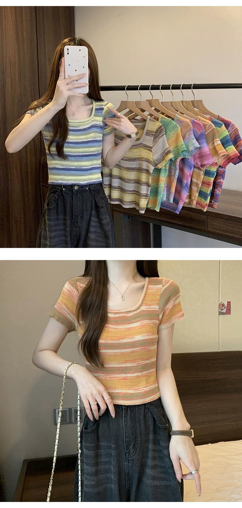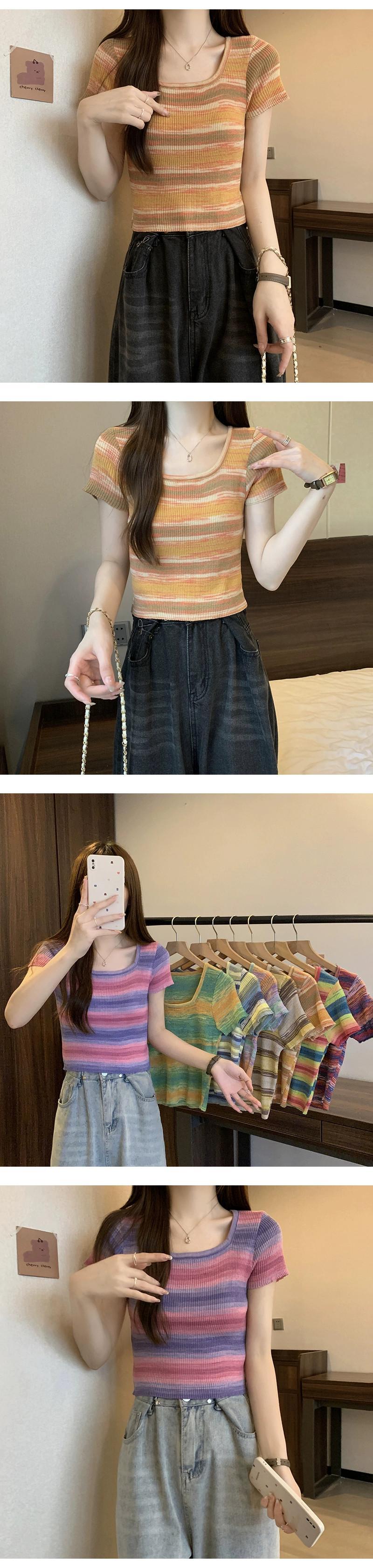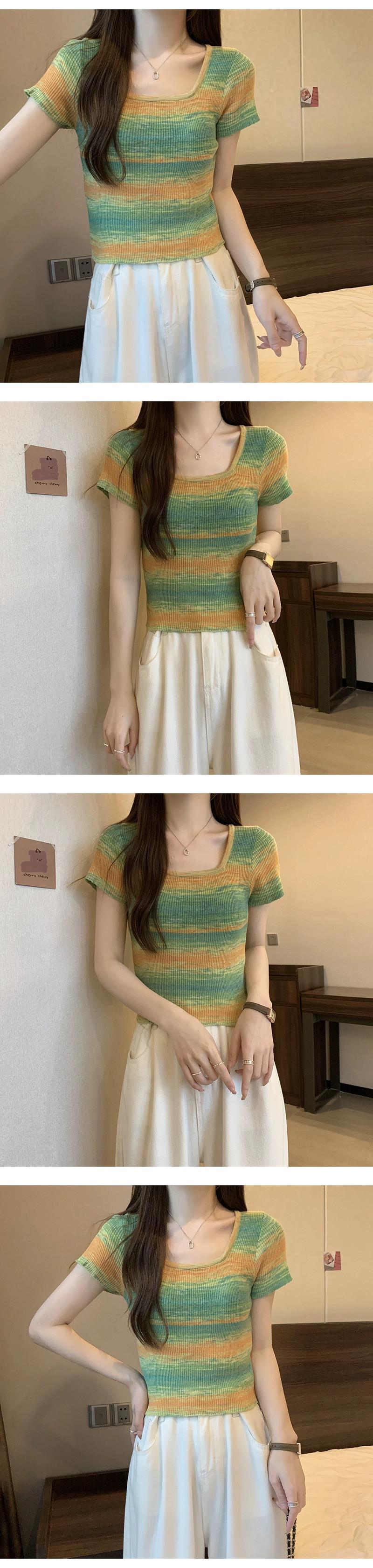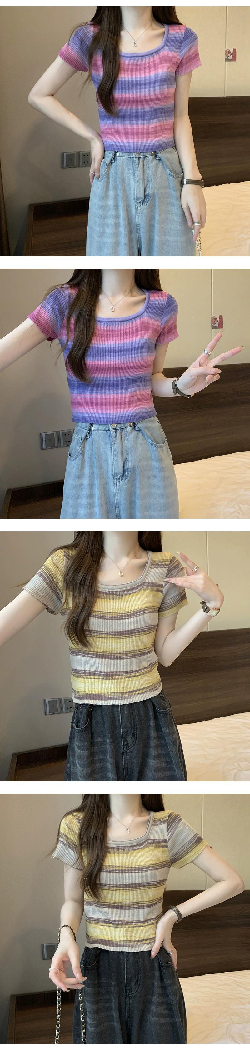 アイスシルクニットストライプTシャツレディース2023年夏新デザイン自己修養感覚とEignスタイルショートスクエアカラー半袖トップ サマー 夏物 スクウェア 7460029730178229 | framboise21