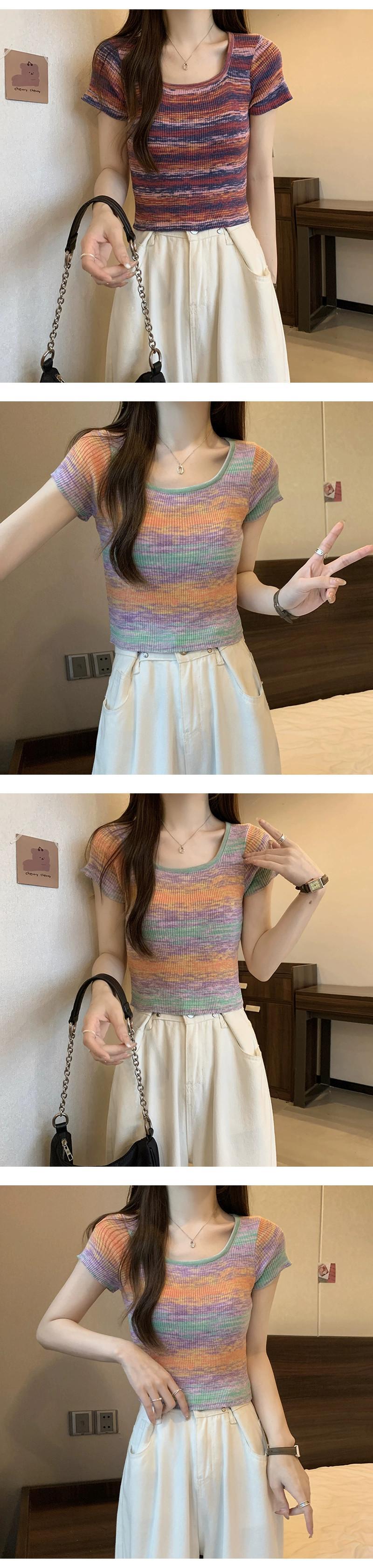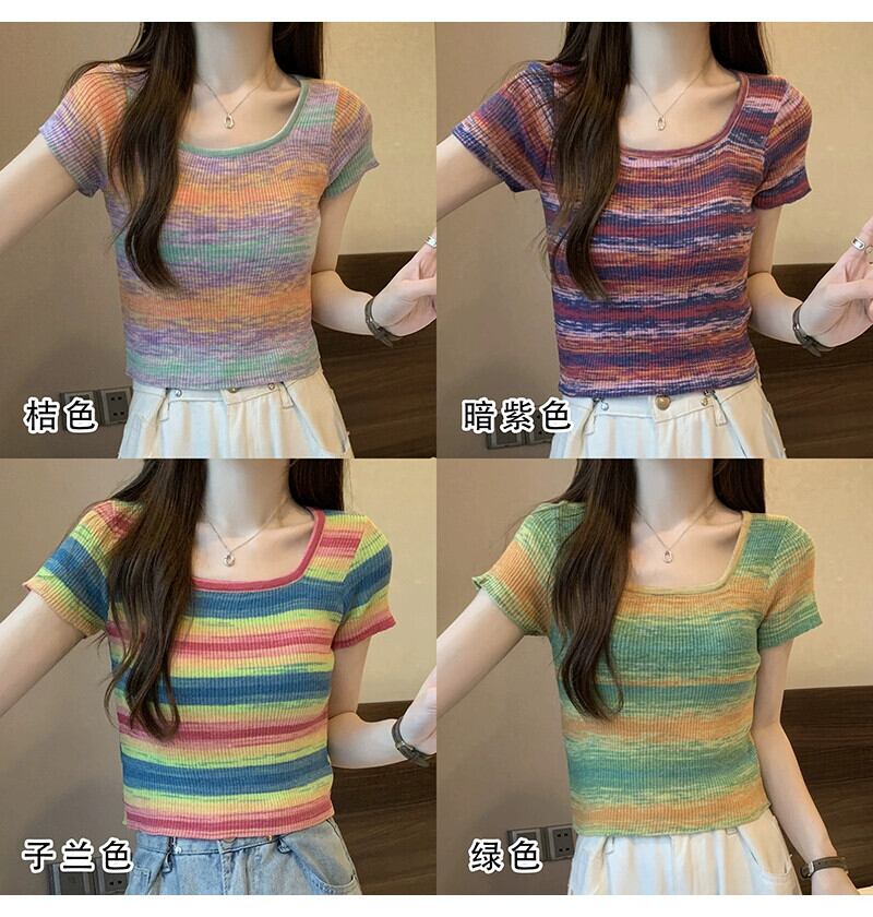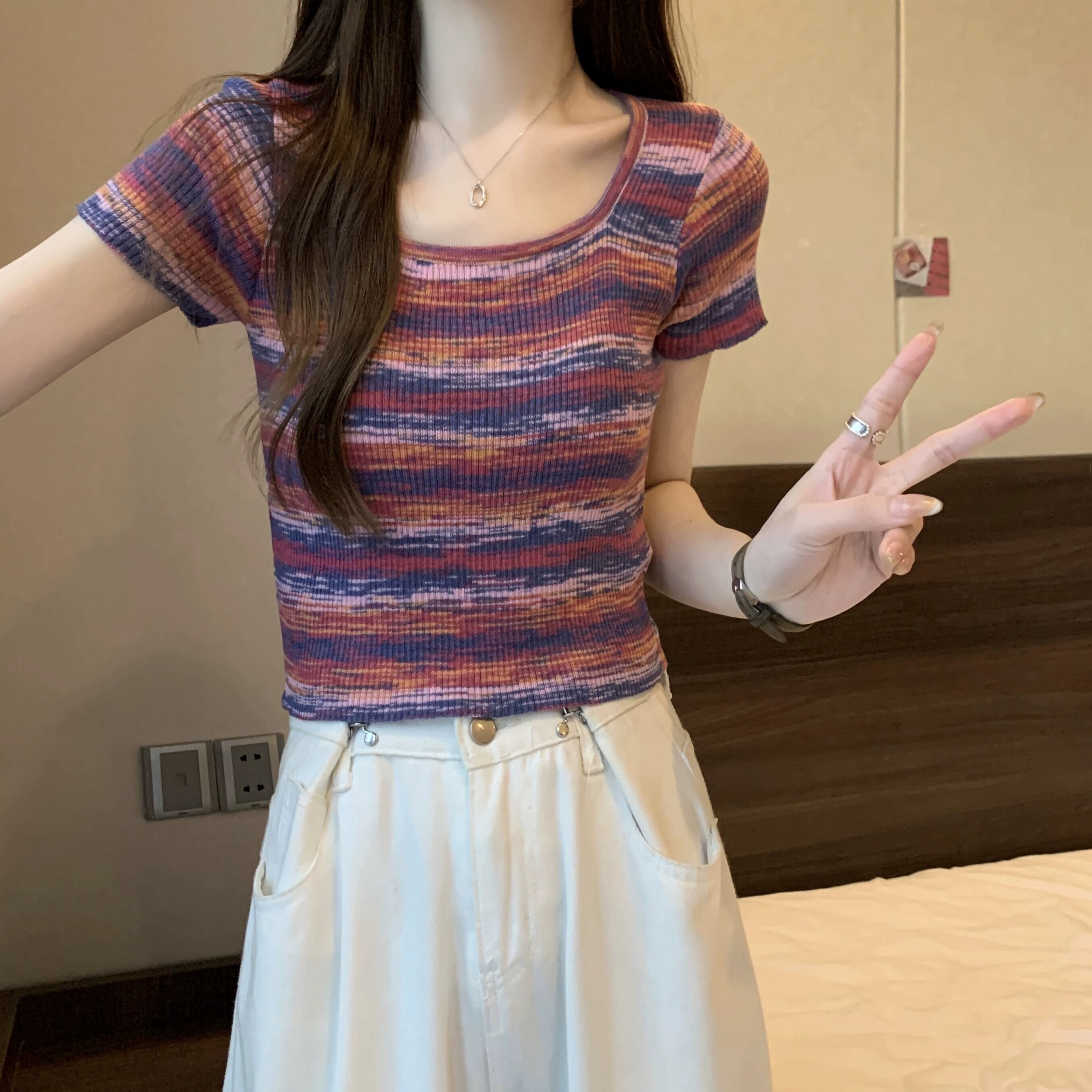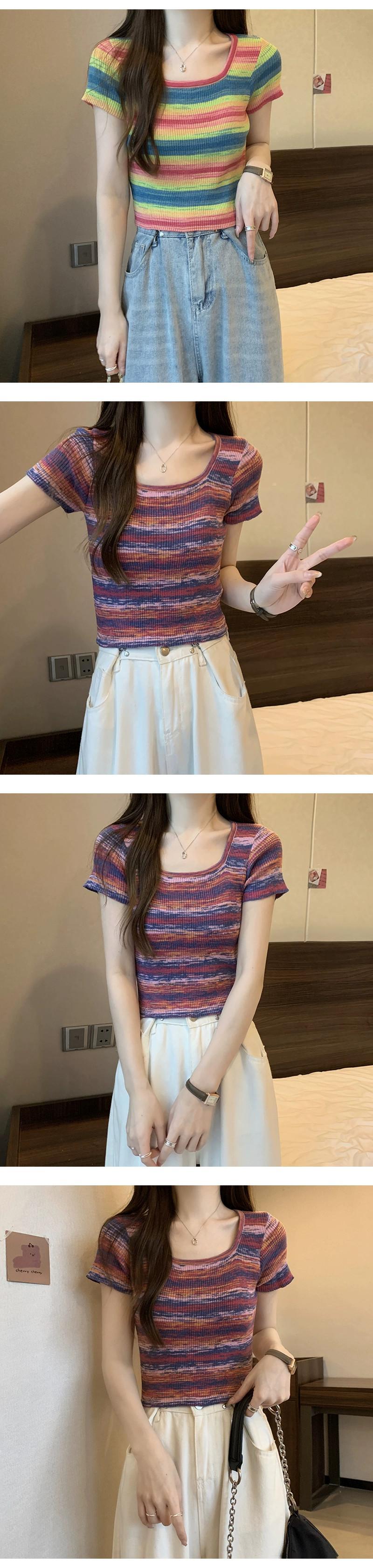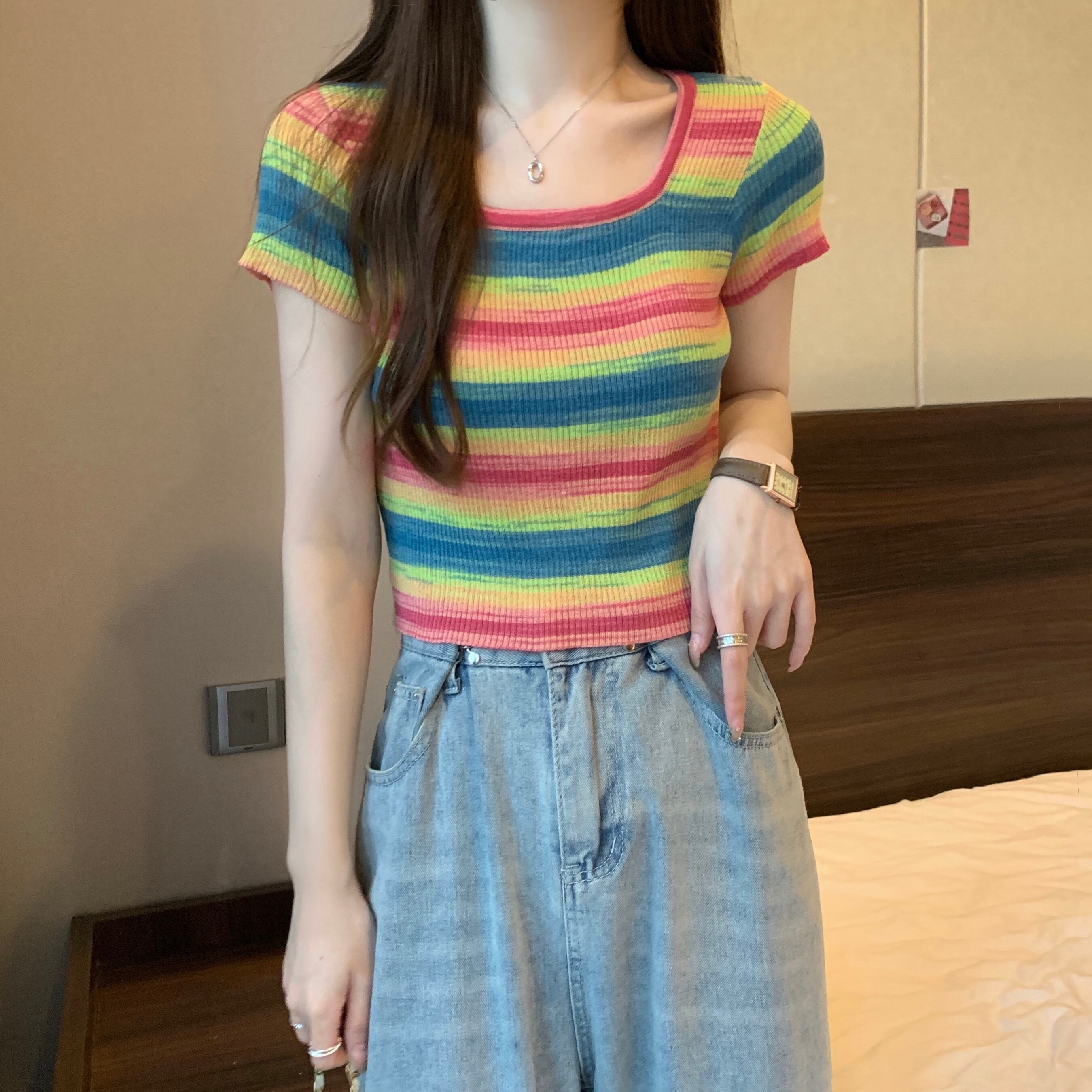 アイスシルクニットストライプTシャツレディース2023年夏新デザイン自己修養感覚とEignスタイルショートスクエアカラー半袖トップ サマー 夏物 スクウェア 7460029730178229 | framboise21