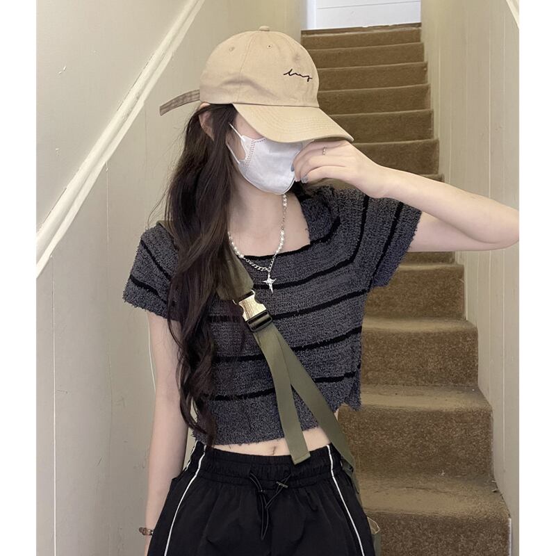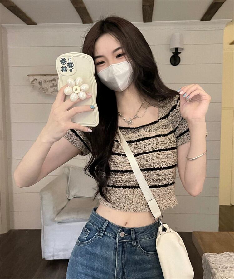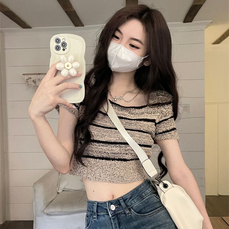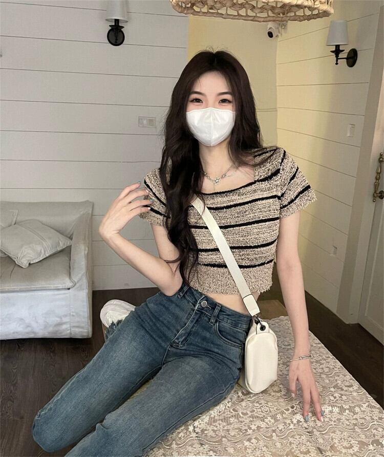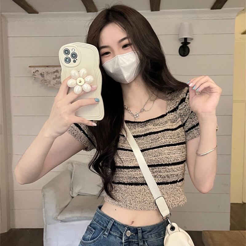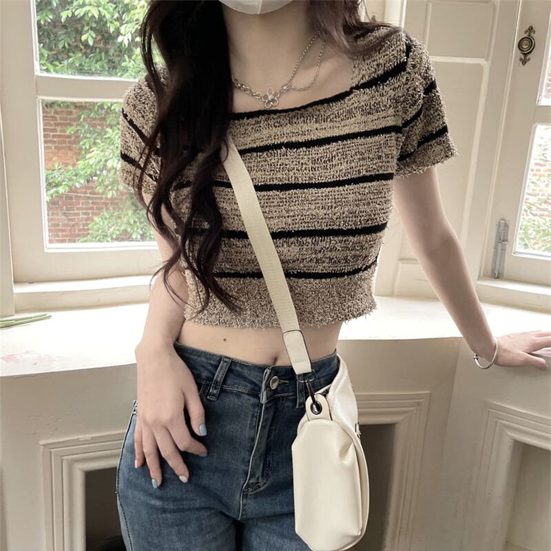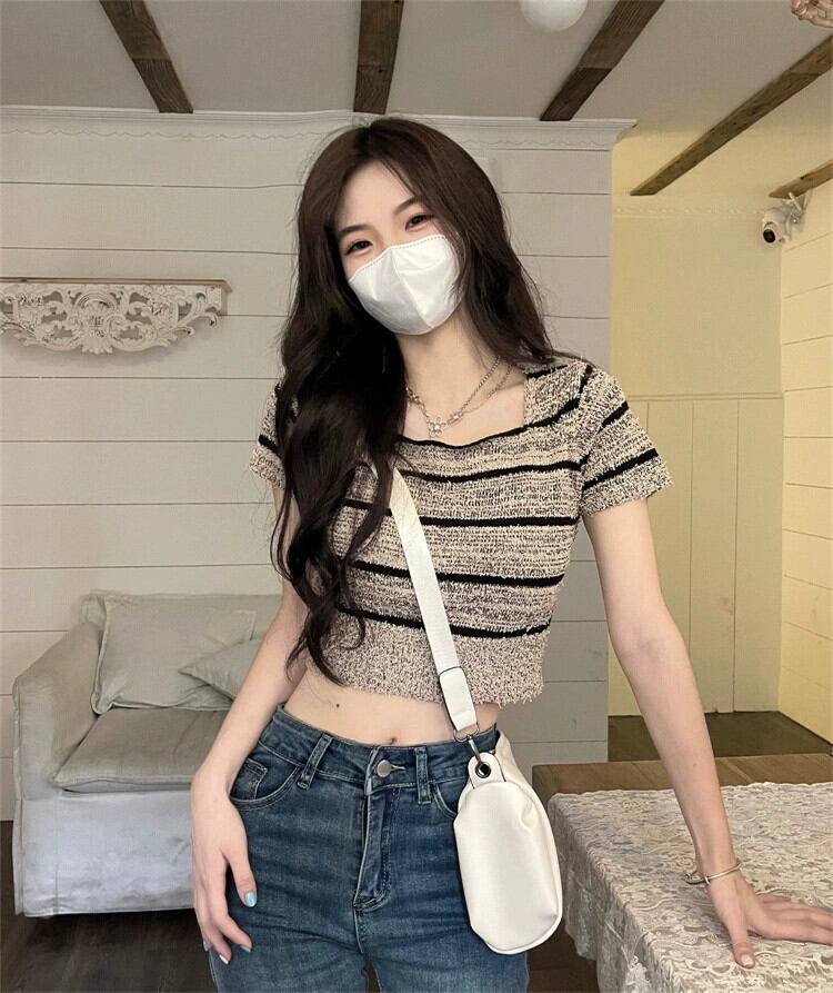 ストライプニット半袖Tシャツレディース夏フレンチデザイン自己修養の感覚と薄い短いセクションへそスクエアカラーアイスシルクトップ ショート サマー 夏物 スクウェア 7460018595652947 | framboise21