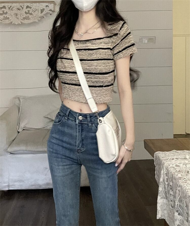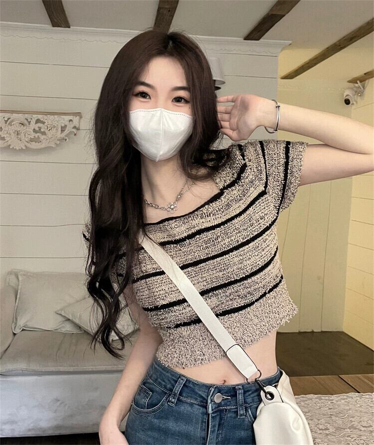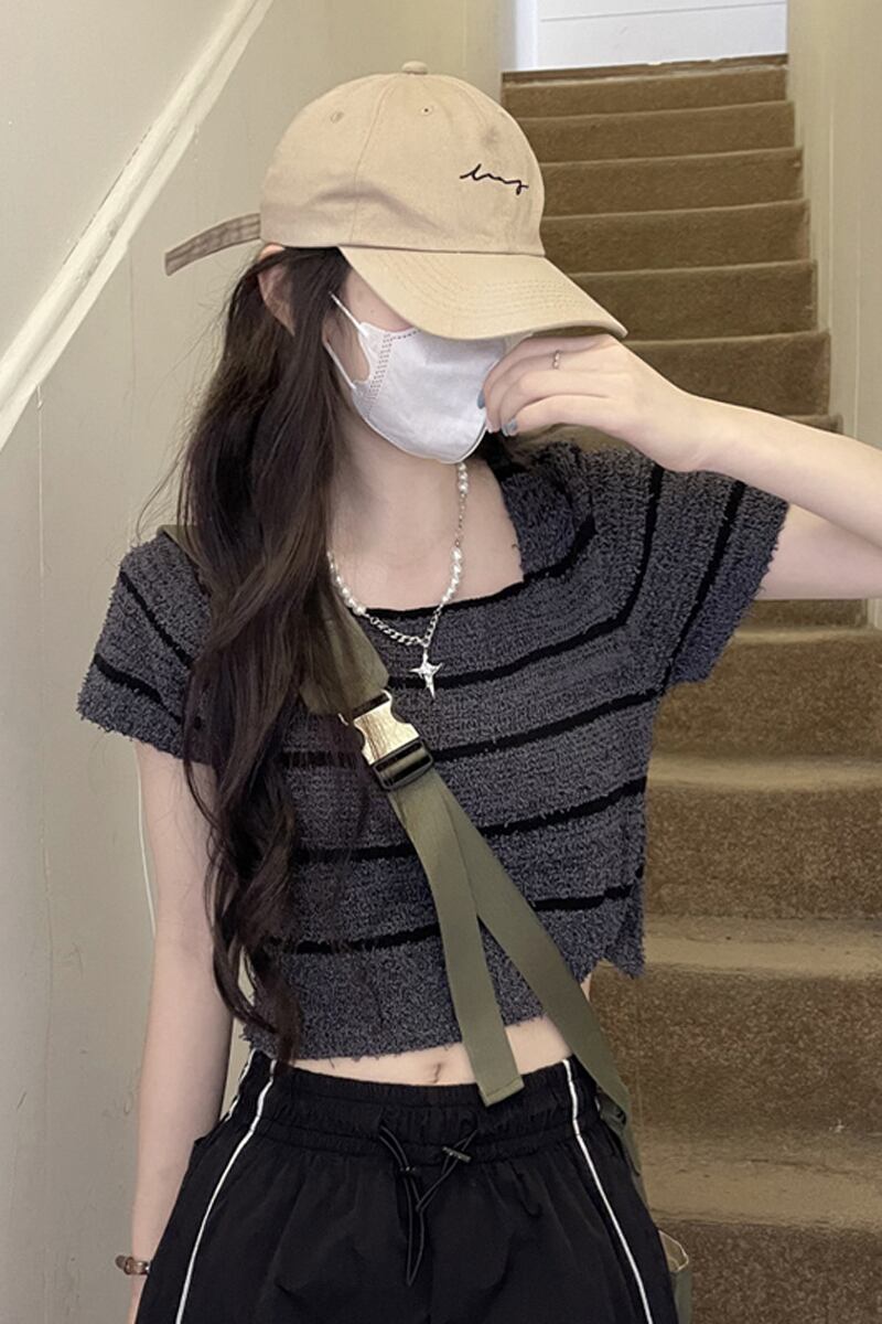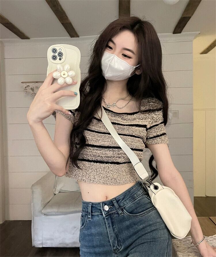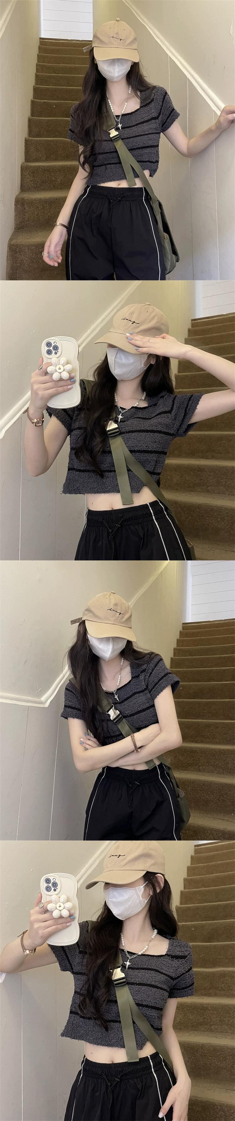 ストライプニット半袖Tシャツレディース夏フレンチデザイン自己修養の感覚と薄い短いセクションへそスクエアカラーアイスシルクトップ ショート サマー 夏物 スクウェア 7460018595652947 | framboise21