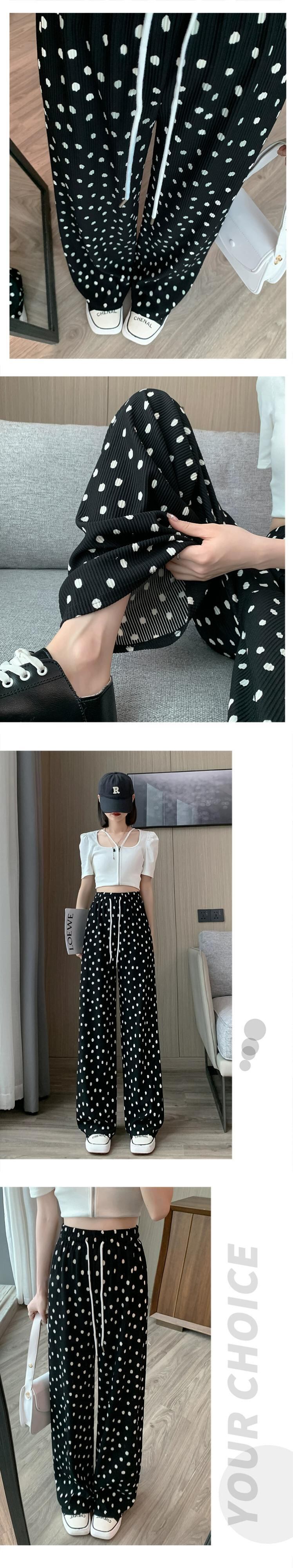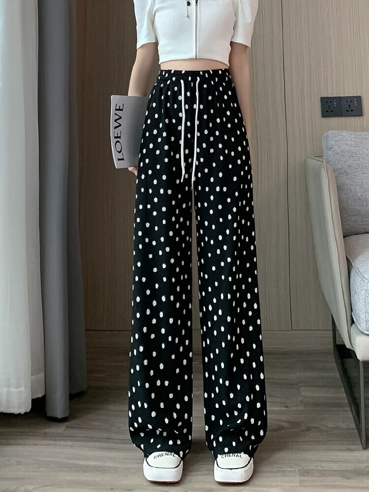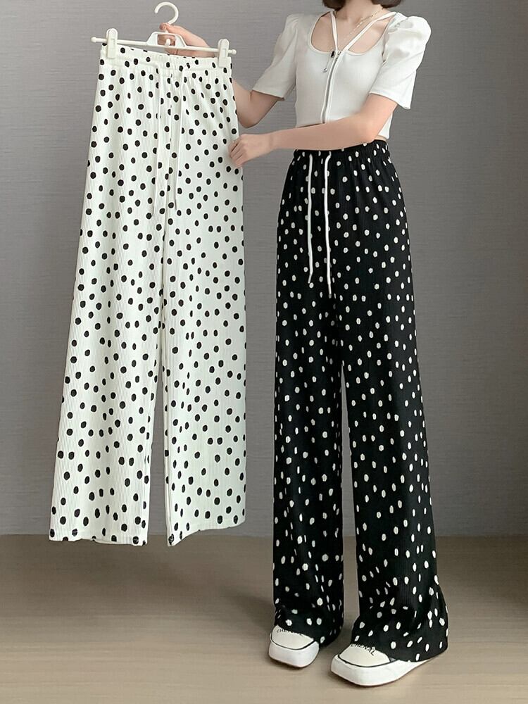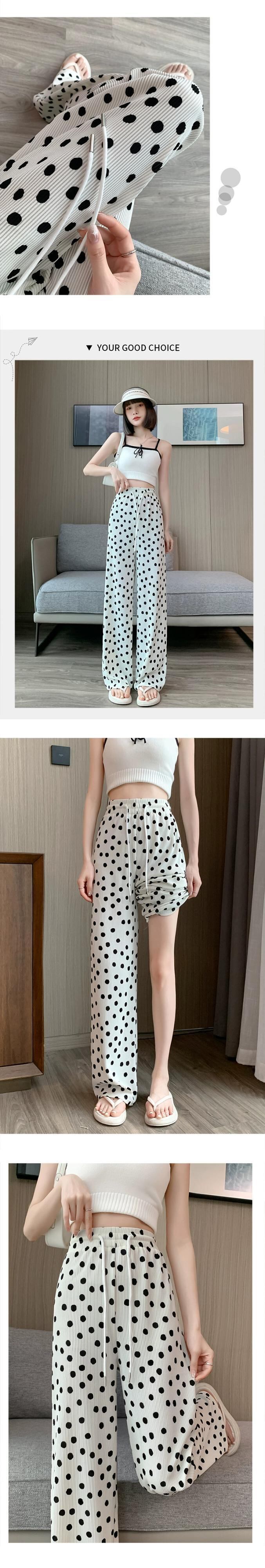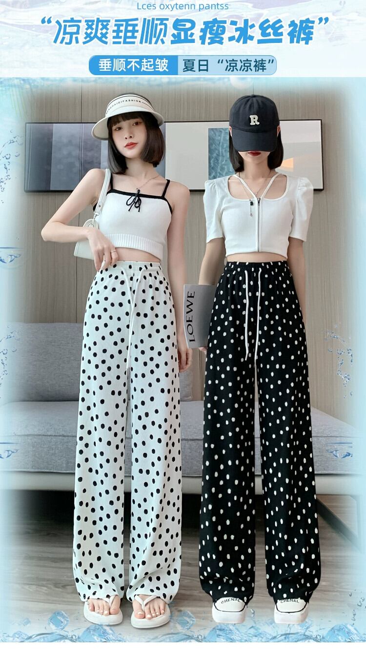 薄セクション水玉アイスシルクワイドレッグパンツ女性の夏のしわテクスチャパンツハイウエストドレープカジュアルフロアモップクールパンツ ハイウェスト サマー 夏物 7460087921195483 | framboise21