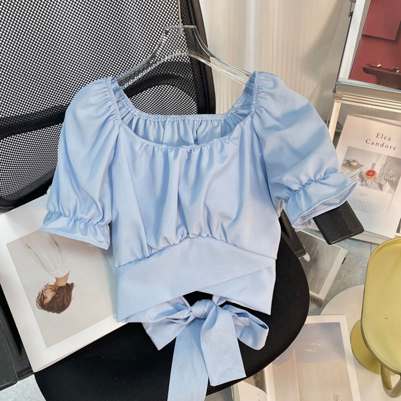 ブルーショート半袖シャツレディース夏のファッションアインスタイルデザインセンス不規則なリボンワンショルダートップ潮 サマー 夏物 7460076275579850