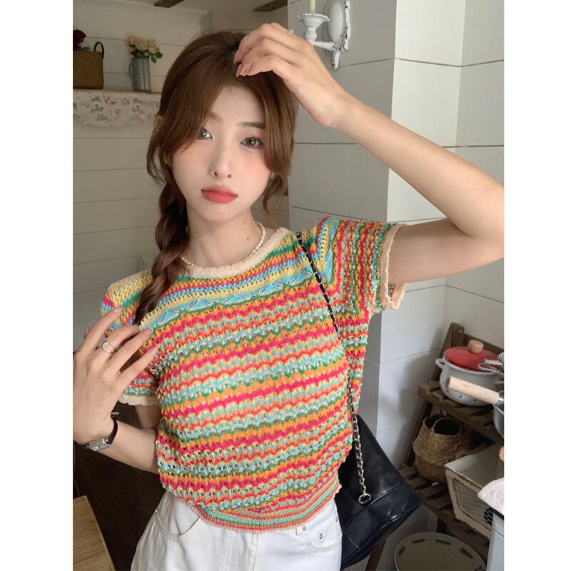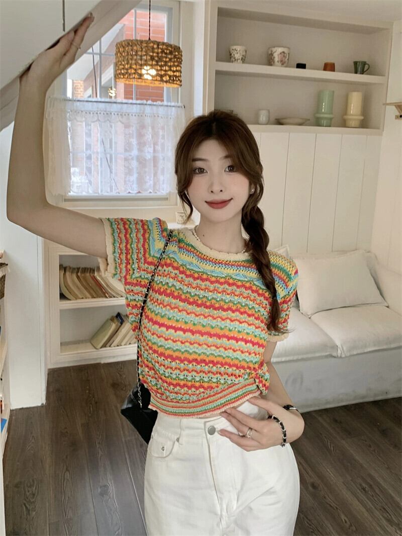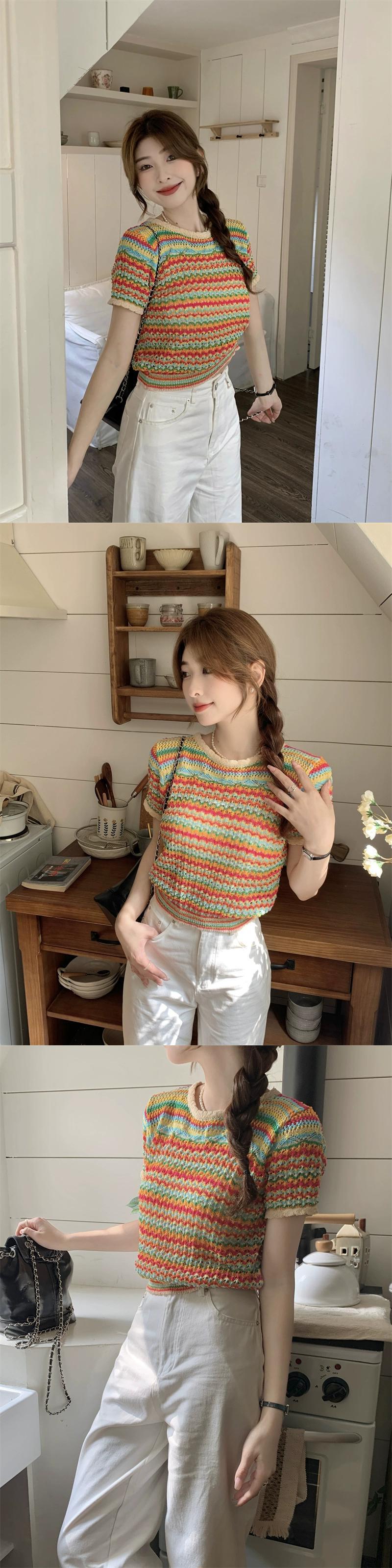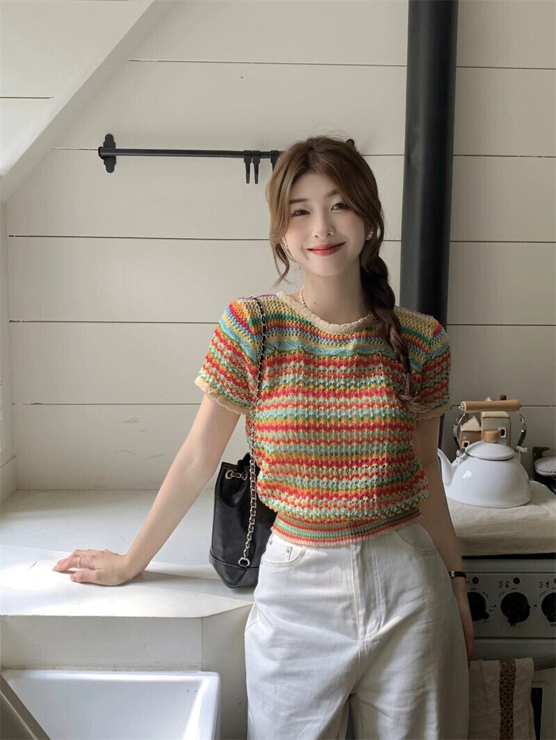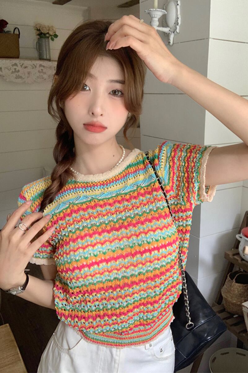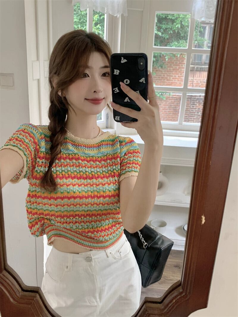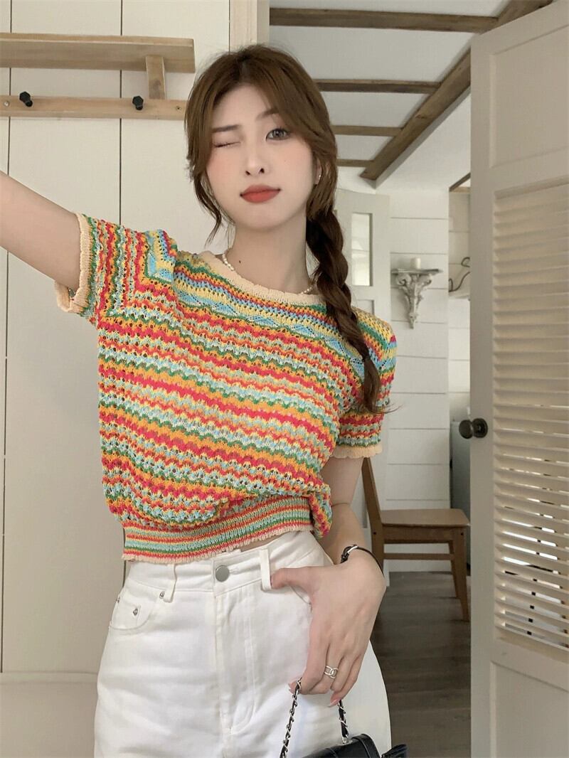 色:レインボー半袖ニットセーター,レインボーベストストラップ