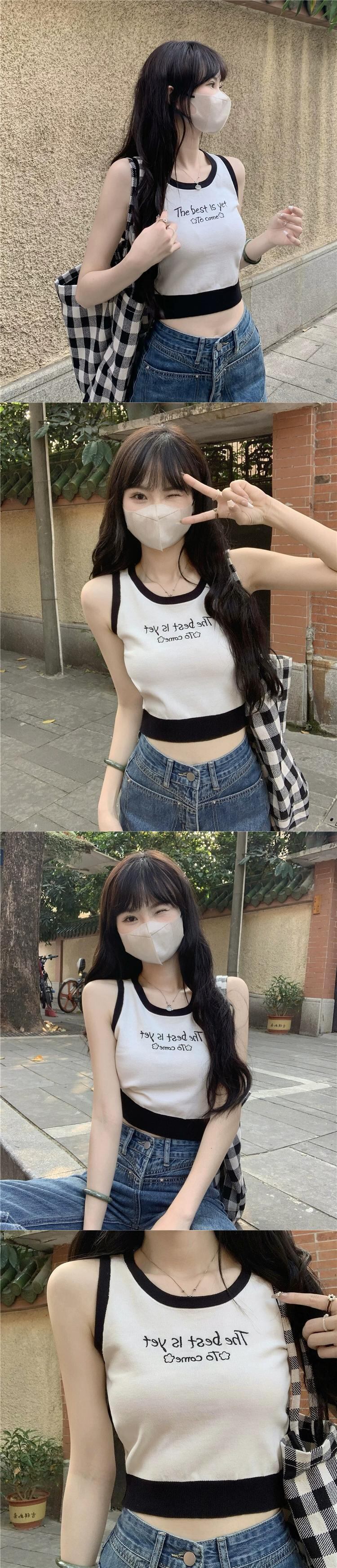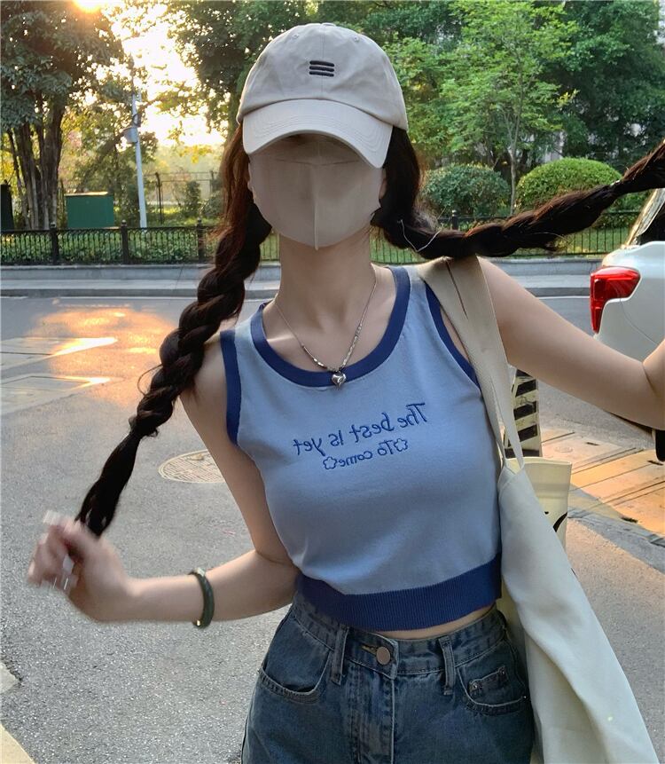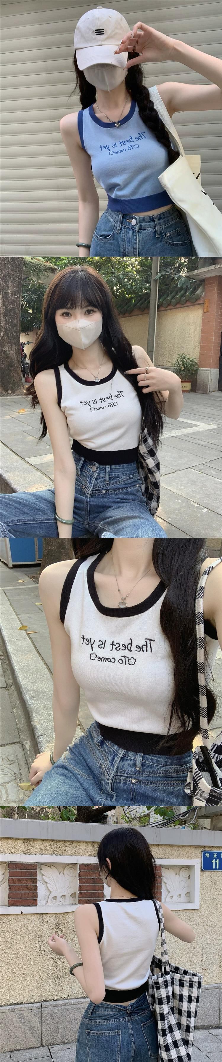 ニットスポーツキャミソールレディース夏インナーウェアデザイン自己修養感覚とアウターウェアショートノースリーブカラーコントラスト刺繍トップ 半袖 ハーフスリーブ サマー 夏物 7460057924546619 | framboise21