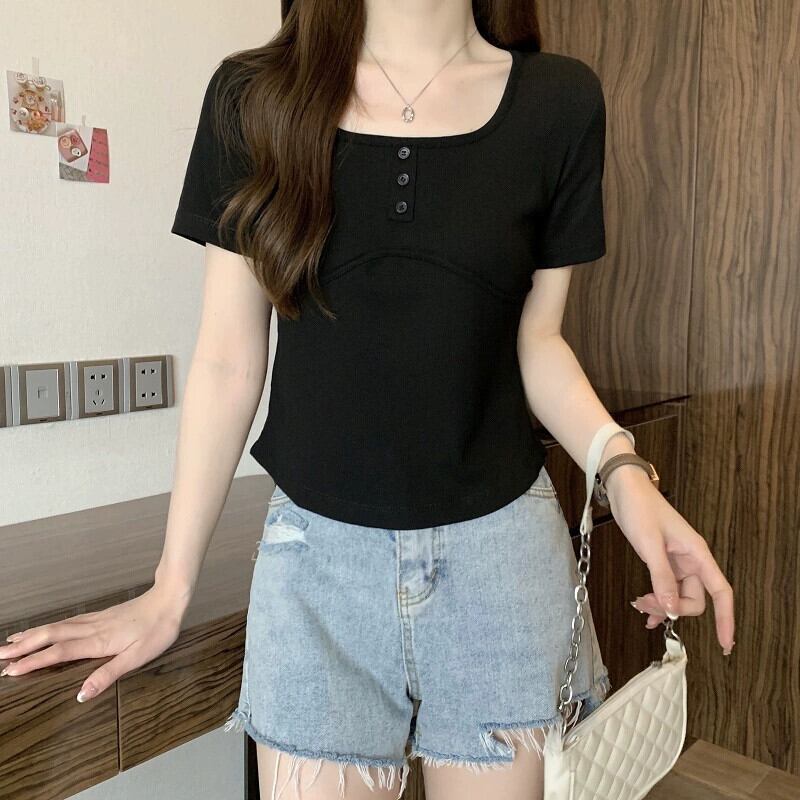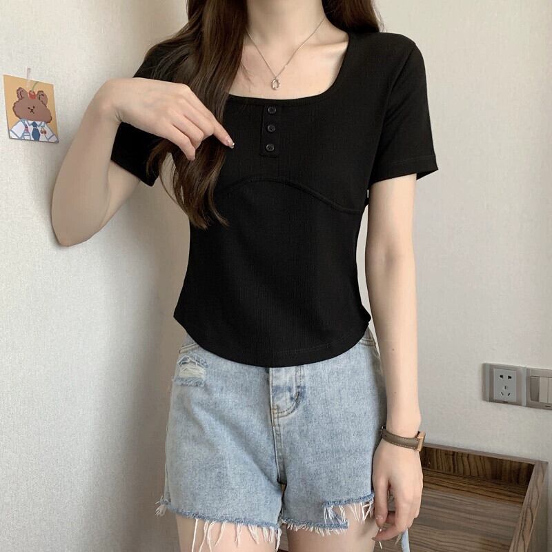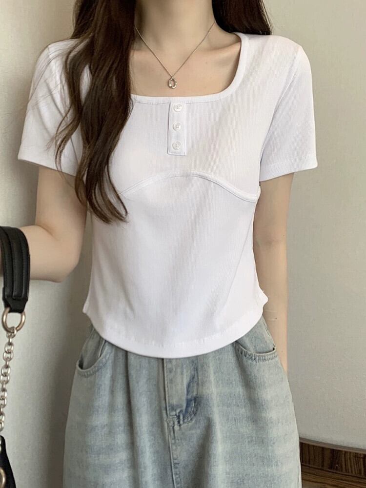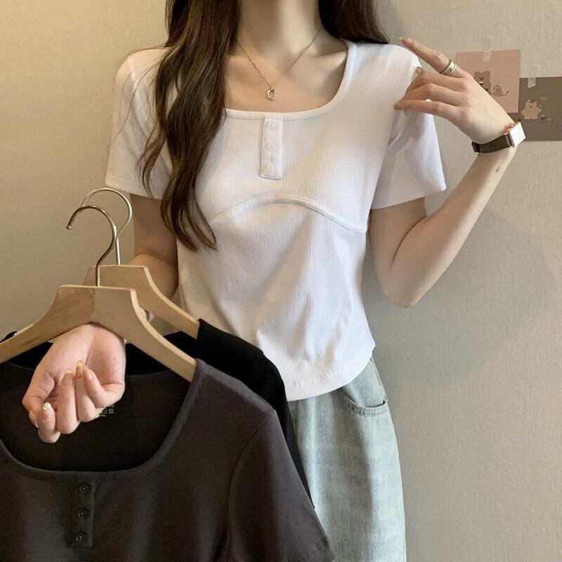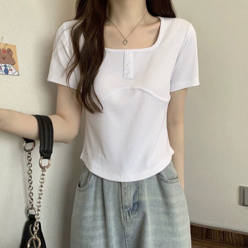 ホワイトスクエアカラー半袖Tシャツレディース夏バージョンニッチデザインスリムファッションオールマッチイレギュラーショルダートップ サマー 夏物 スクウェア 7460090316862408 | framboise21
