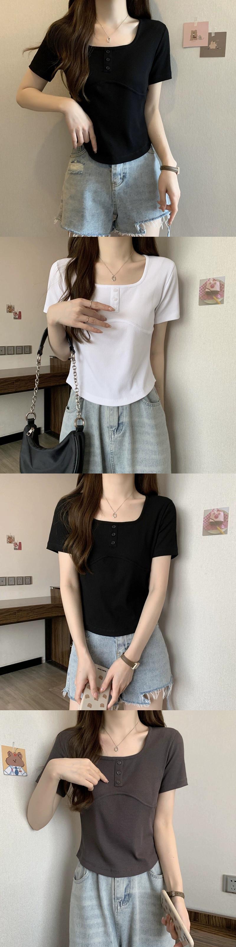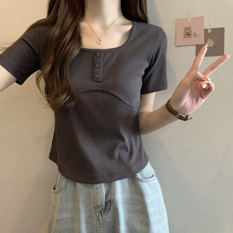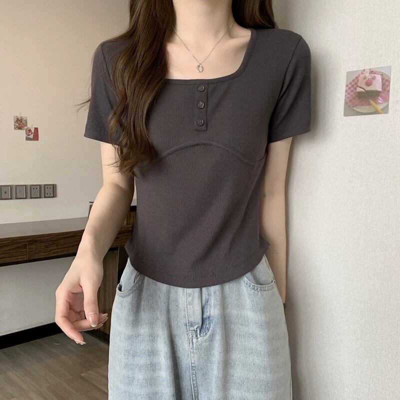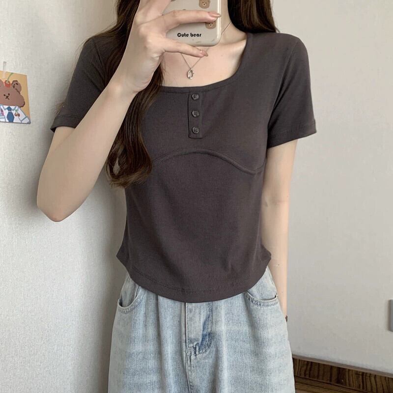 ホワイトスクエアカラー半袖Tシャツレディース夏バージョンニッチデザインスリムファッションオールマッチイレギュラーショルダートップ サマー 夏物 スクウェア 7460090316862408 | framboise21