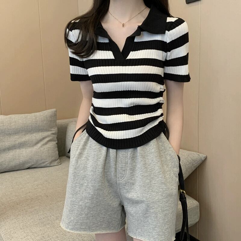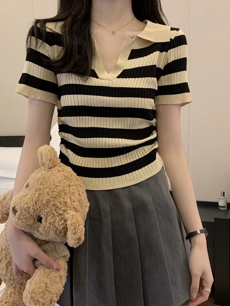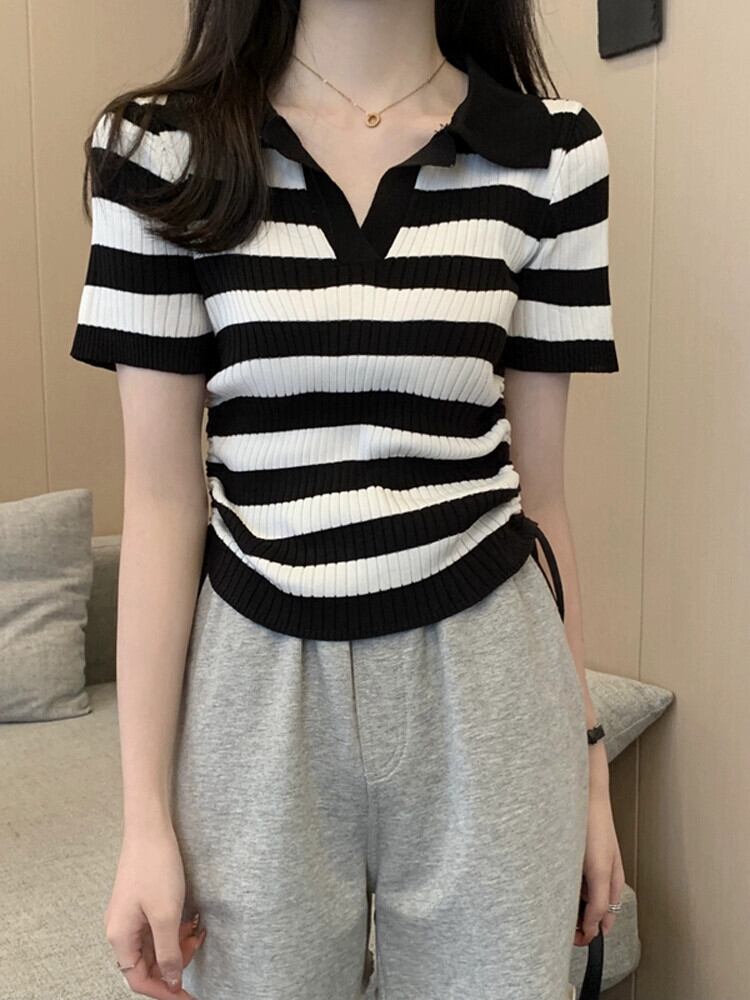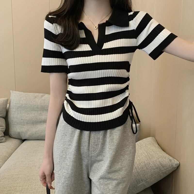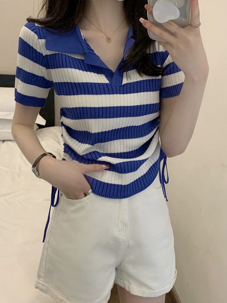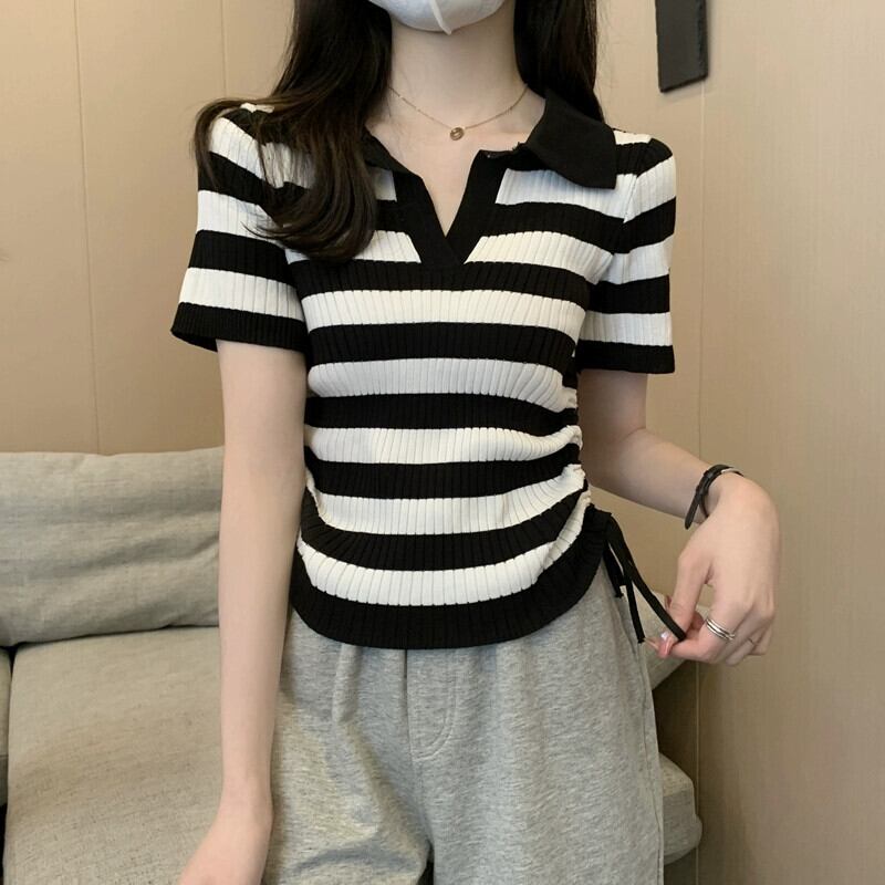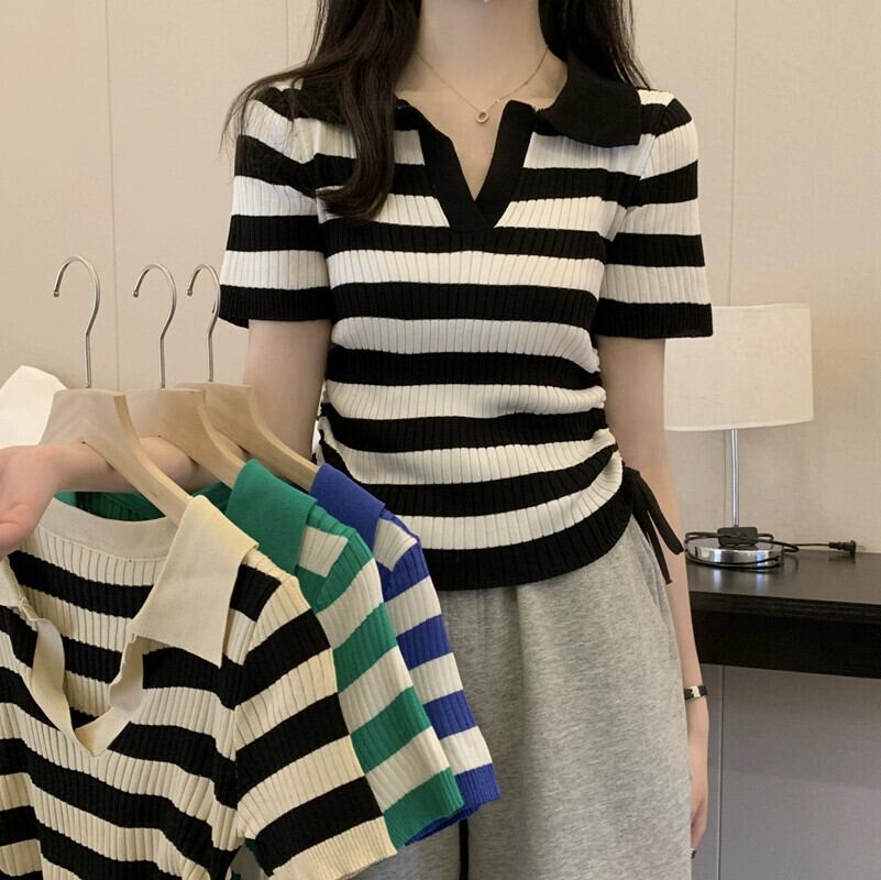 ポロカラーストライプ半袖Tシャツレディース夏のファッションデザイン自己修養の感覚ショートドローストリングVネックニットトップ サマー 夏物 7460044221019569 | framboise21