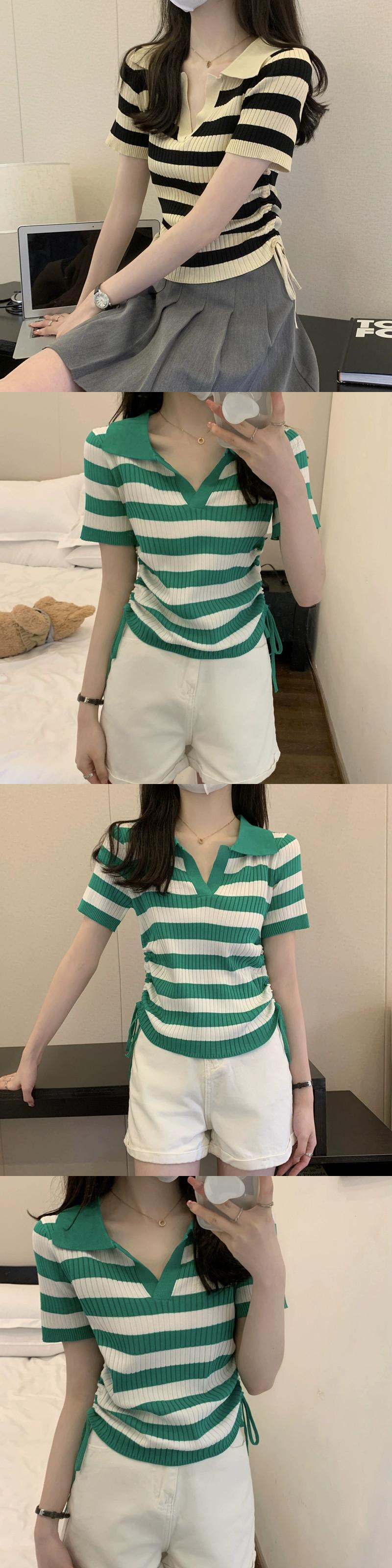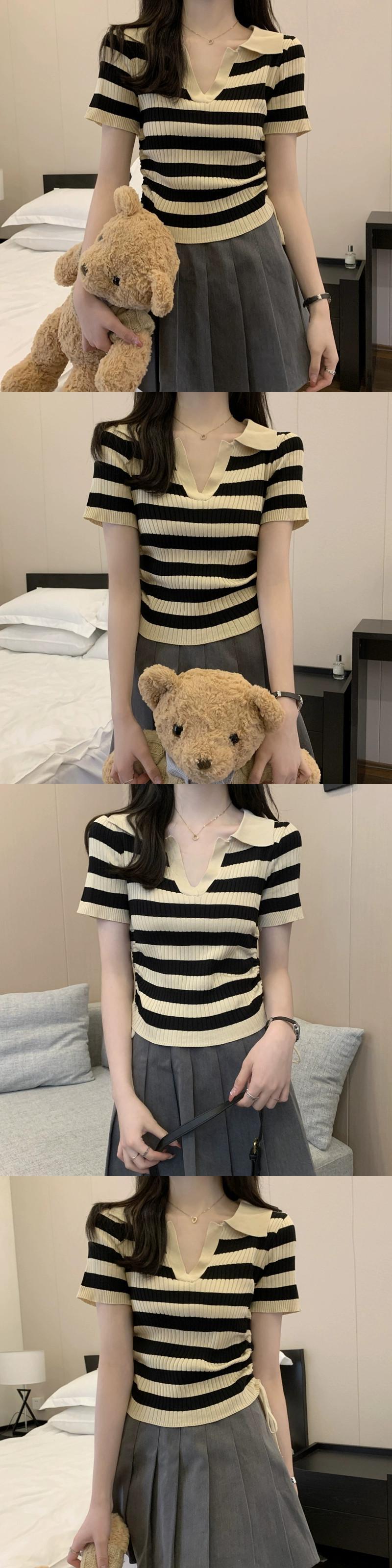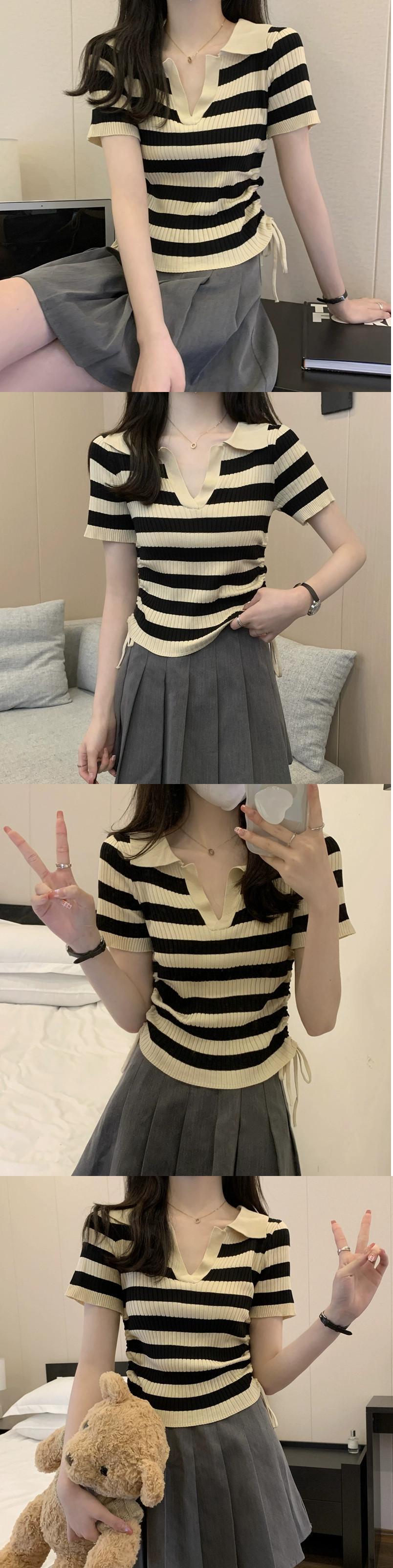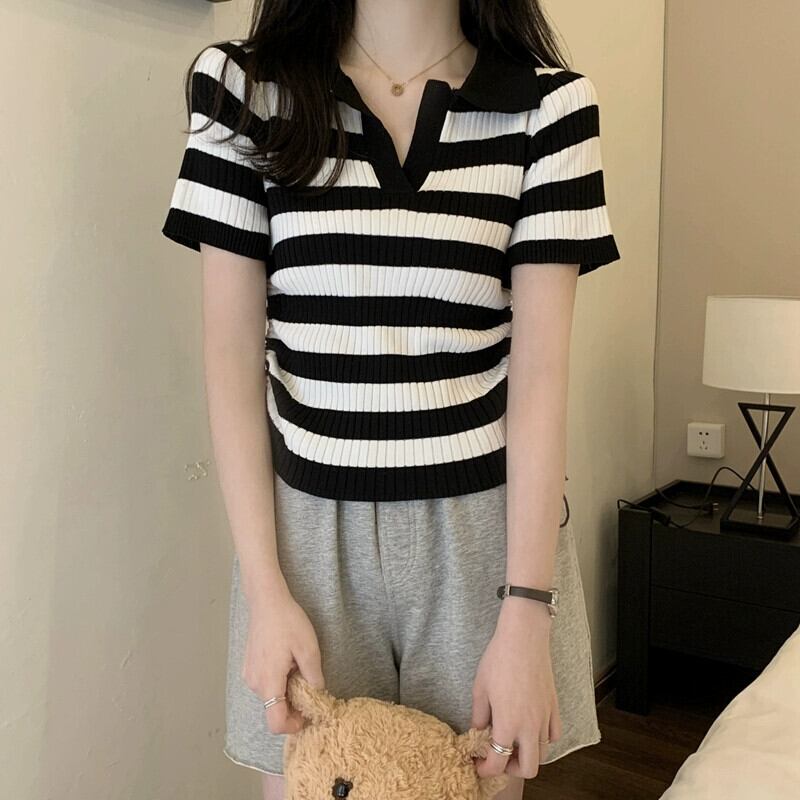 ポロカラーストライプ半袖Tシャツレディース夏のファッションデザイン自己修養の感覚ショートドローストリングVネックニットトップ サマー 夏物 7460044221019569 | framboise21