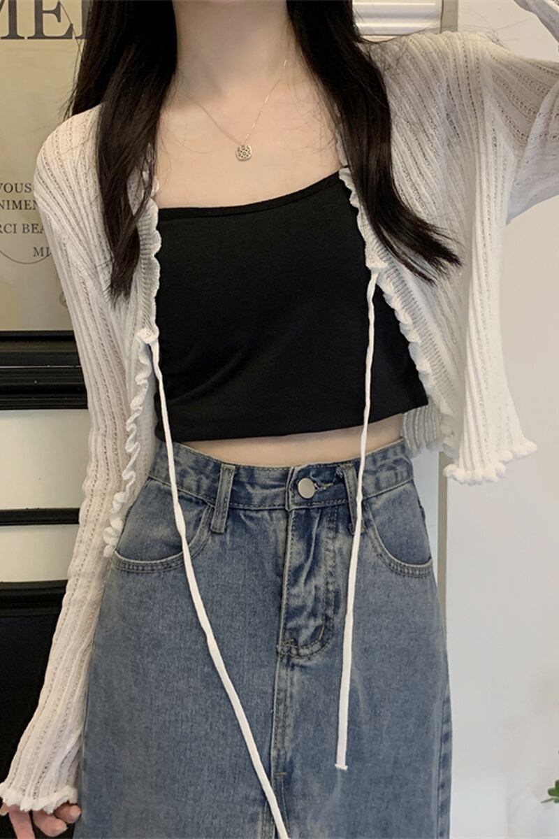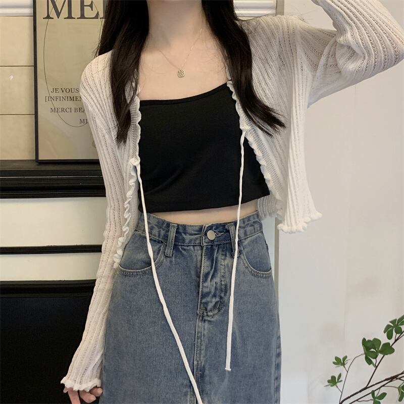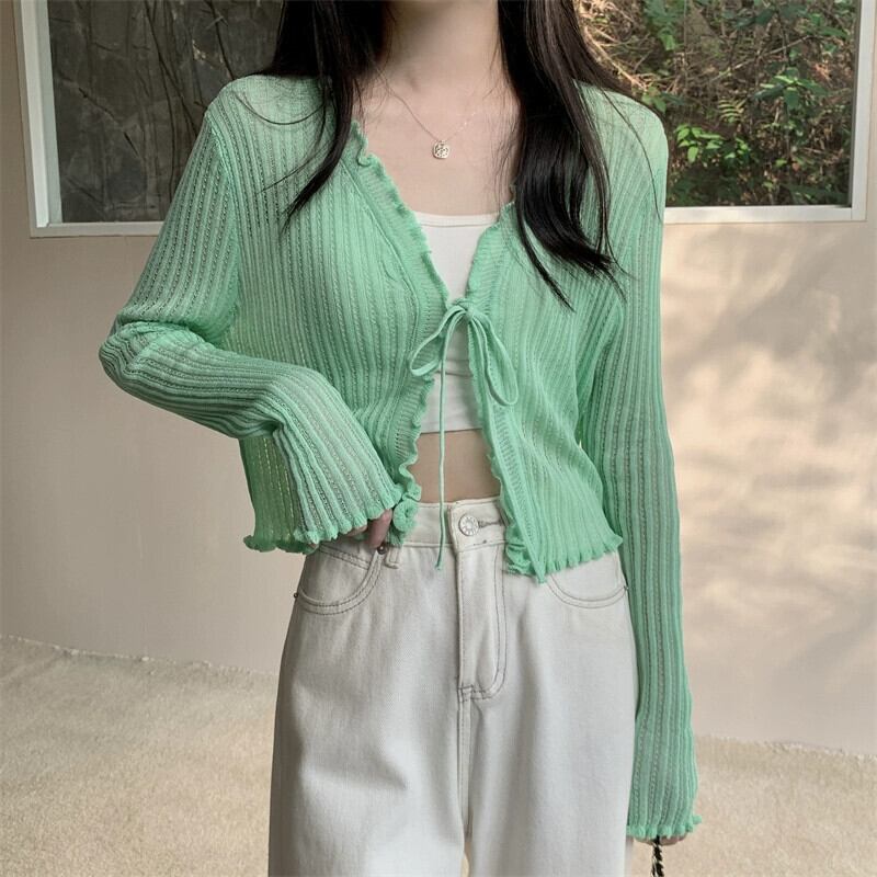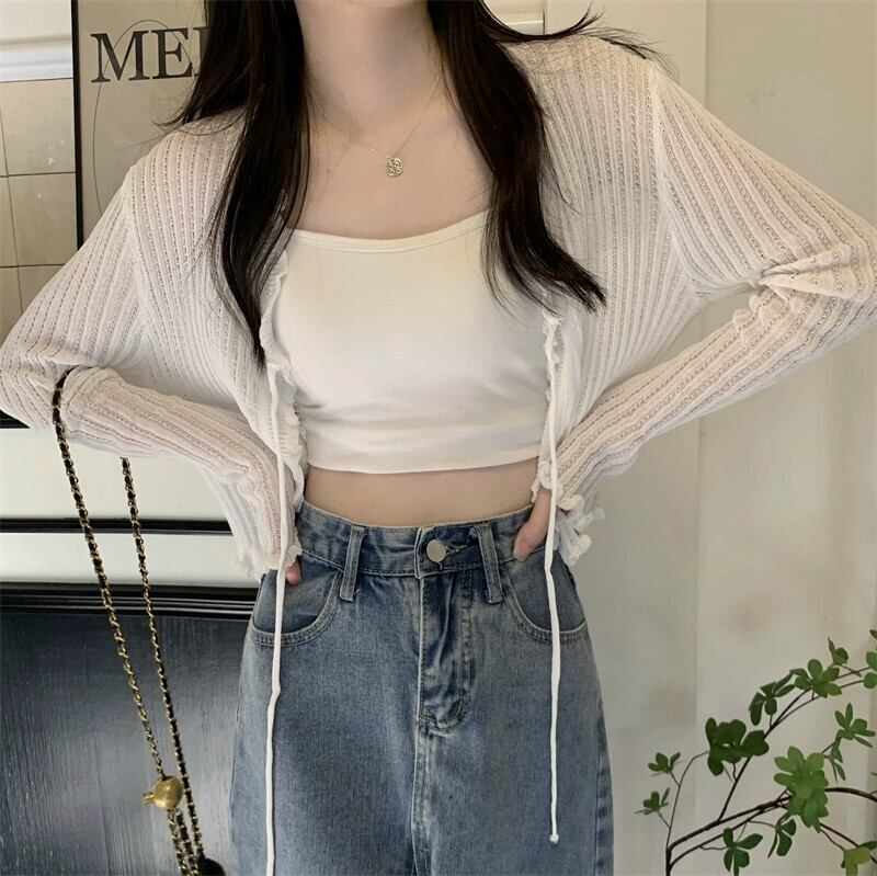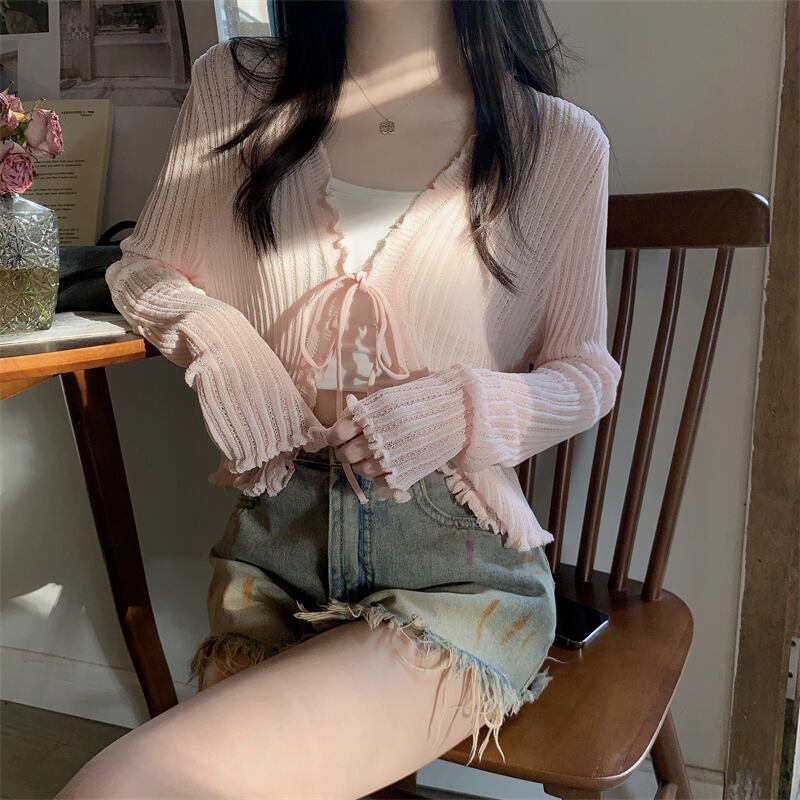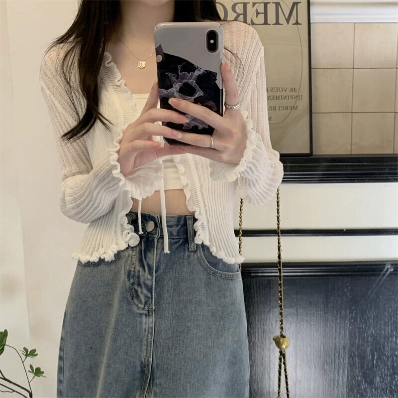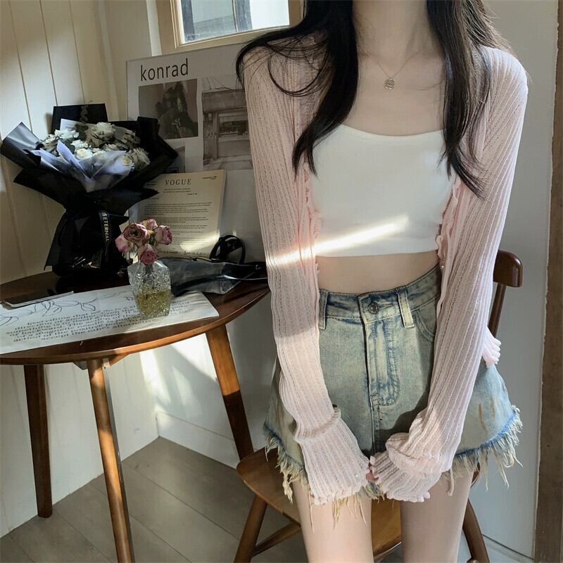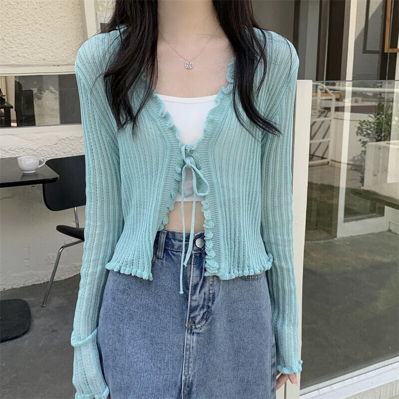 アイスシルク日焼け止めカーディガン女性の夏のアウターは、木の耳付きの薄いニットショールブラウスを着て、サスペンダー付きの短い小さなコートを着ています ショート サマー 夏物 7460085905263058 | framboise21