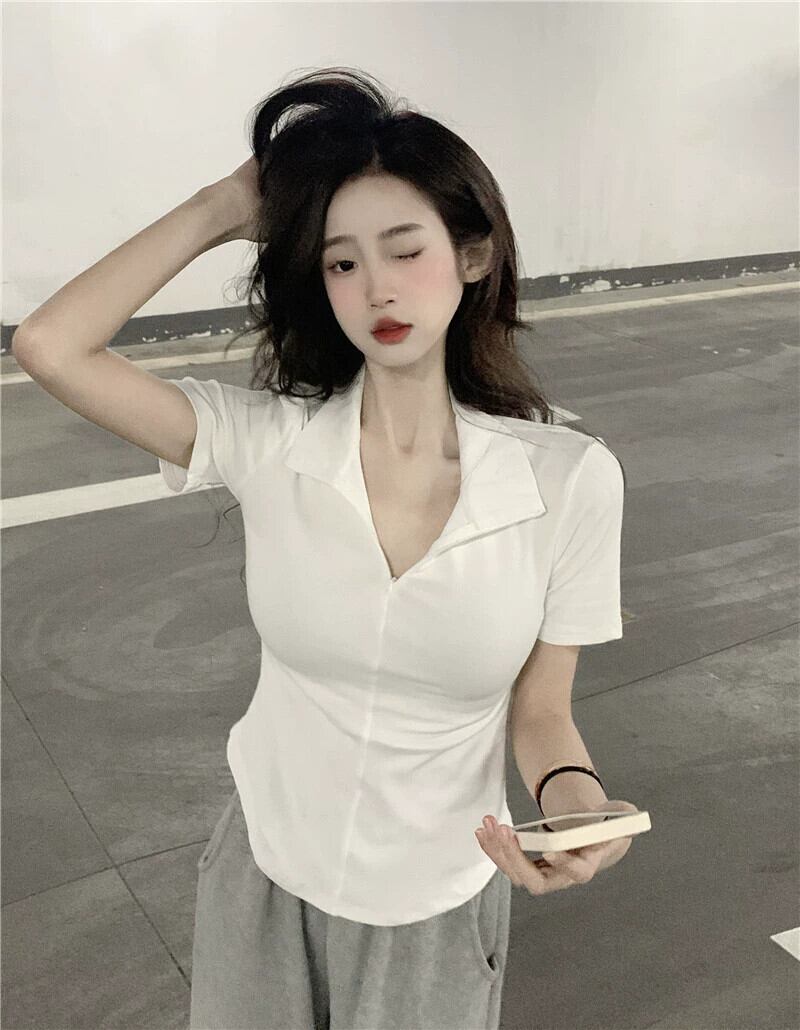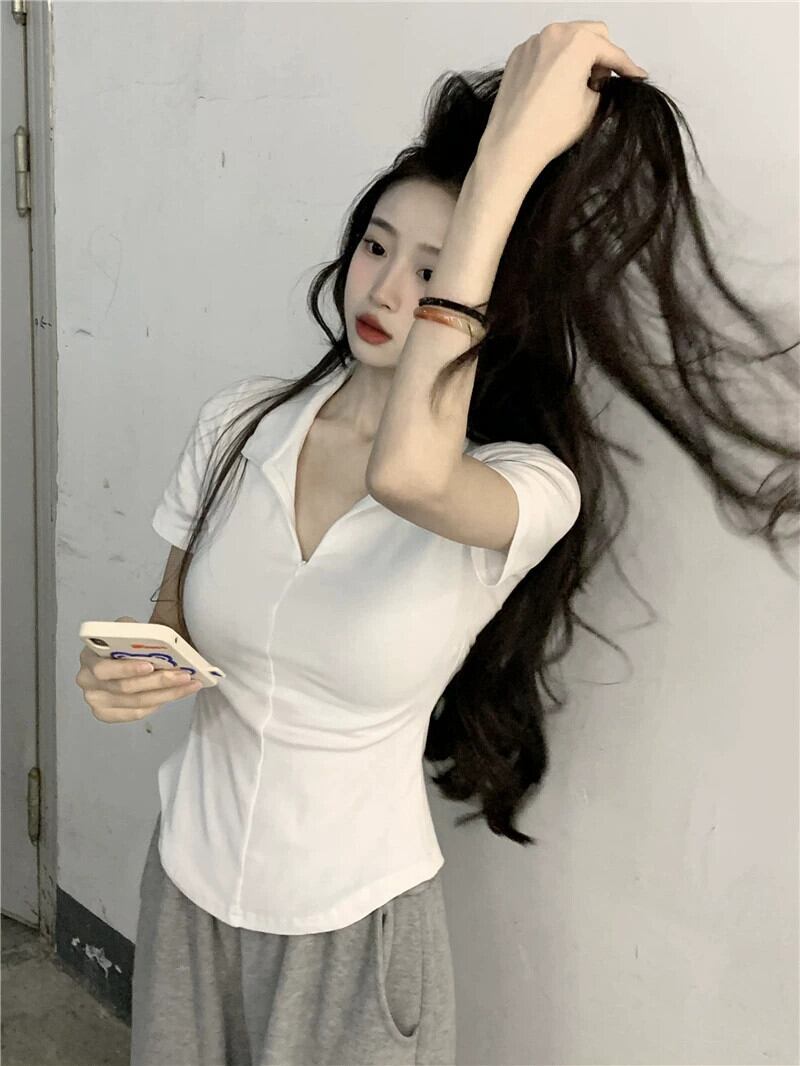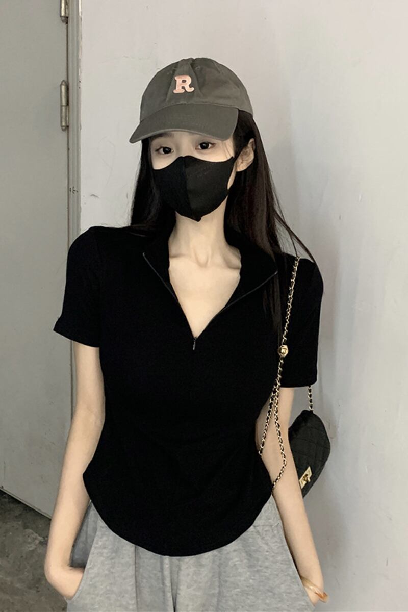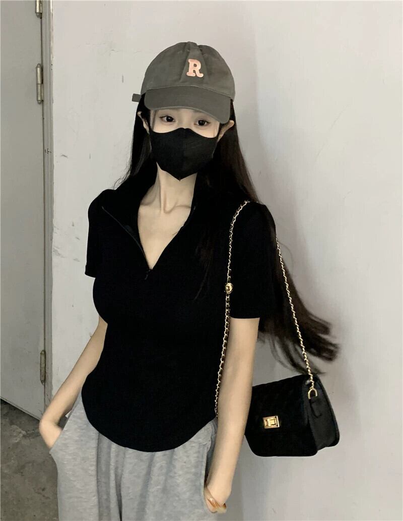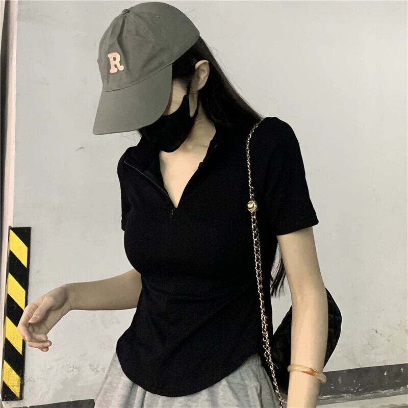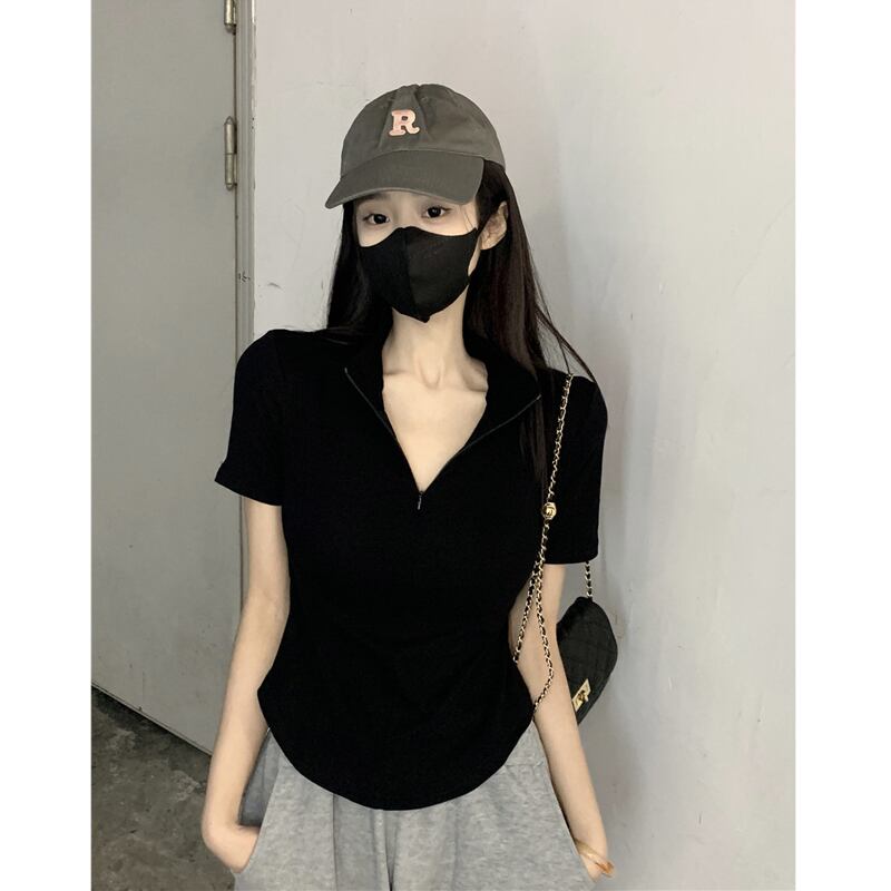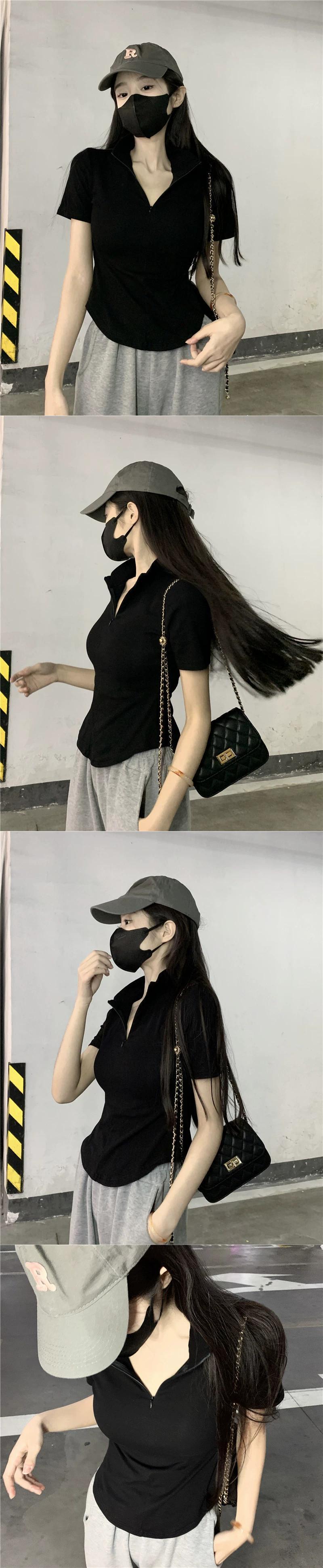 黒の V ネック半袖 T シャツの女性の夏のデザイン自己修養の感覚痩身不規則な裾ショート ポロカラー トップ潮 ブラック サマー 夏物 Vネック Tシャツ 7460060946671325 | framboise21