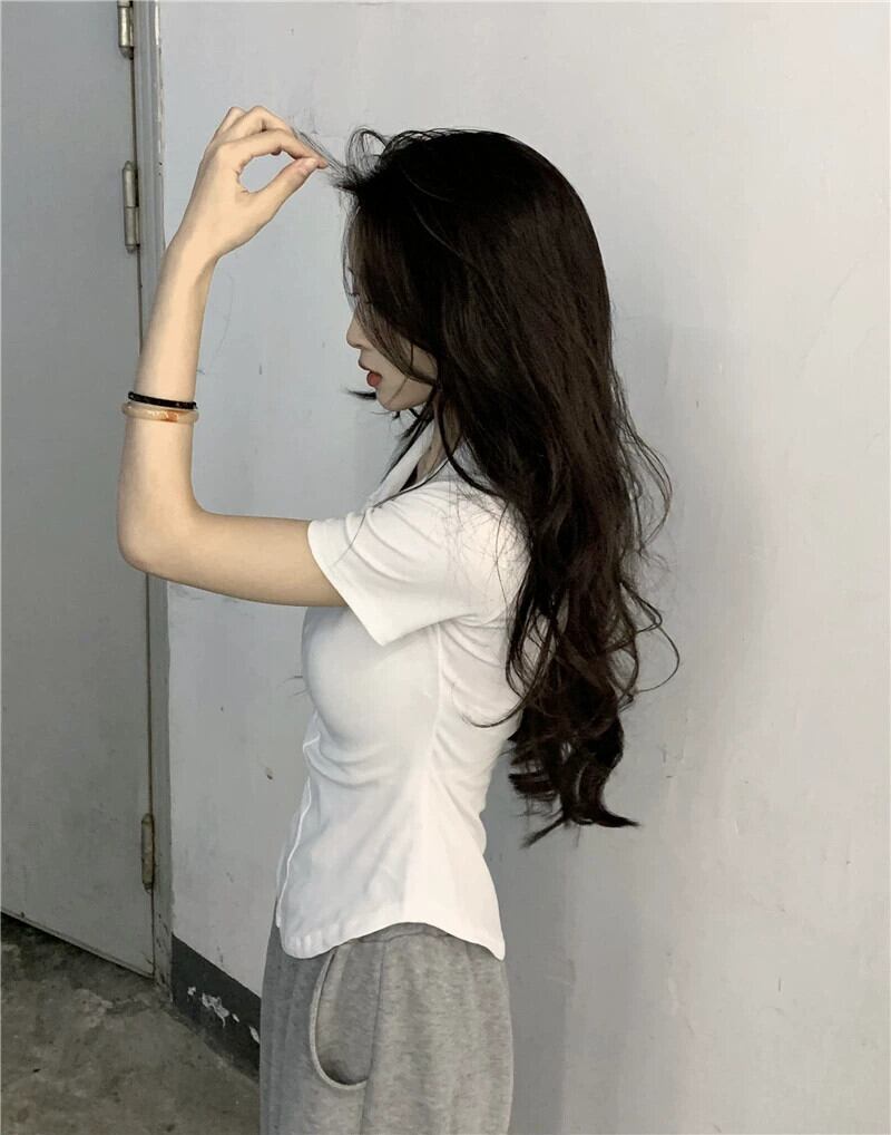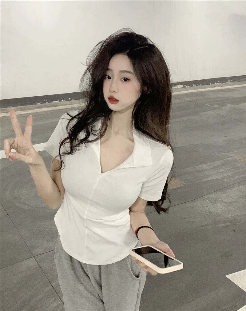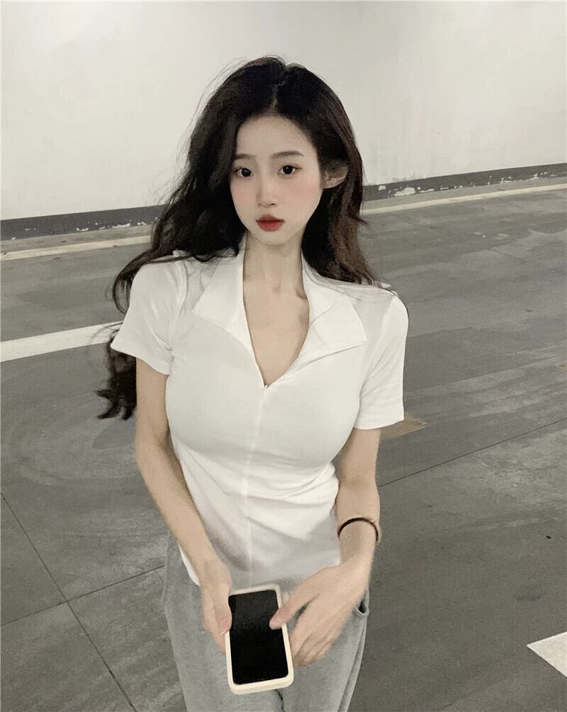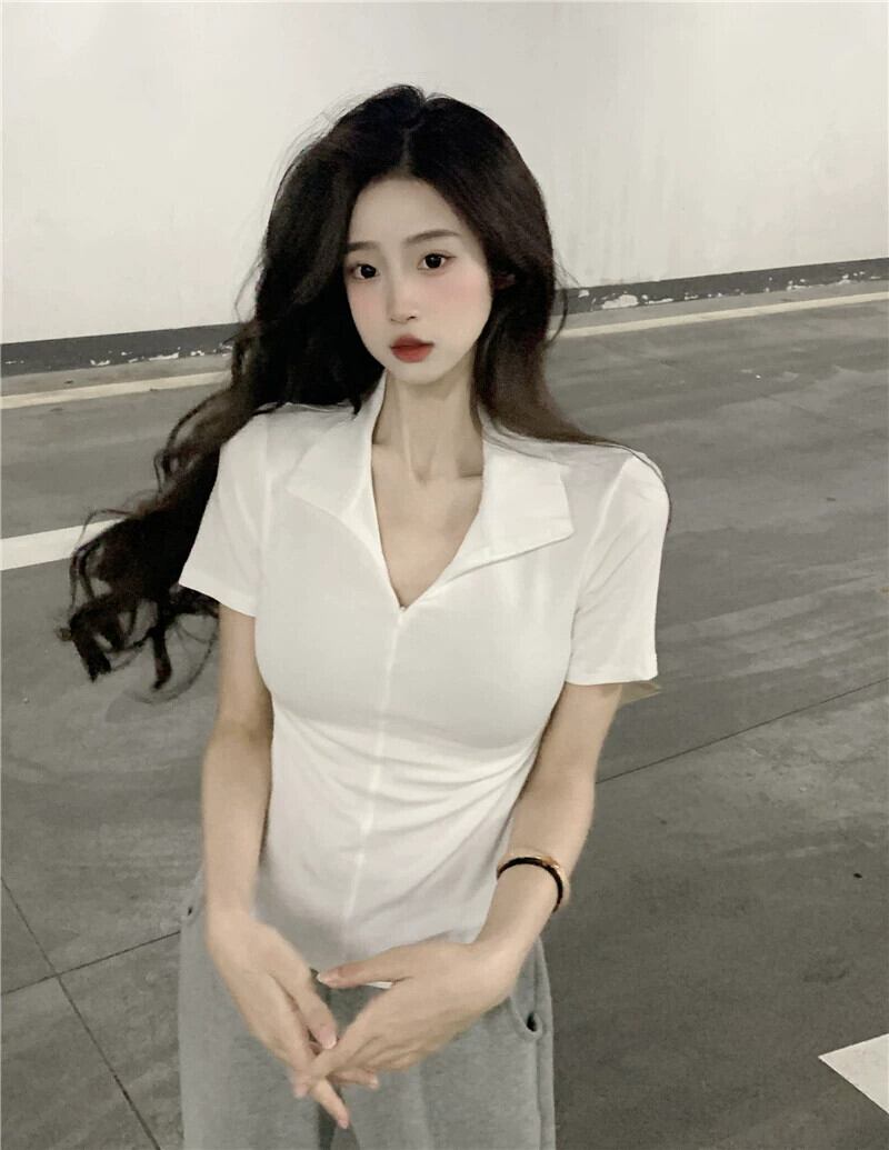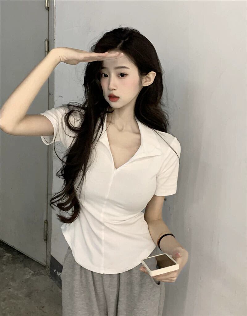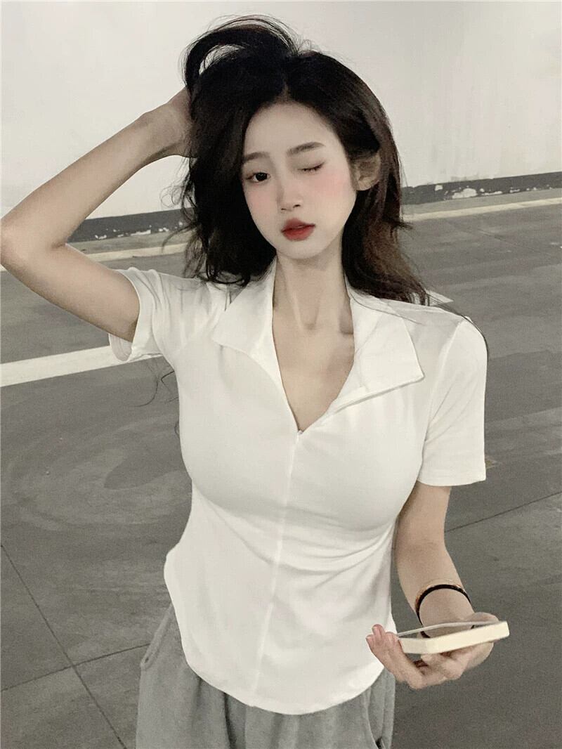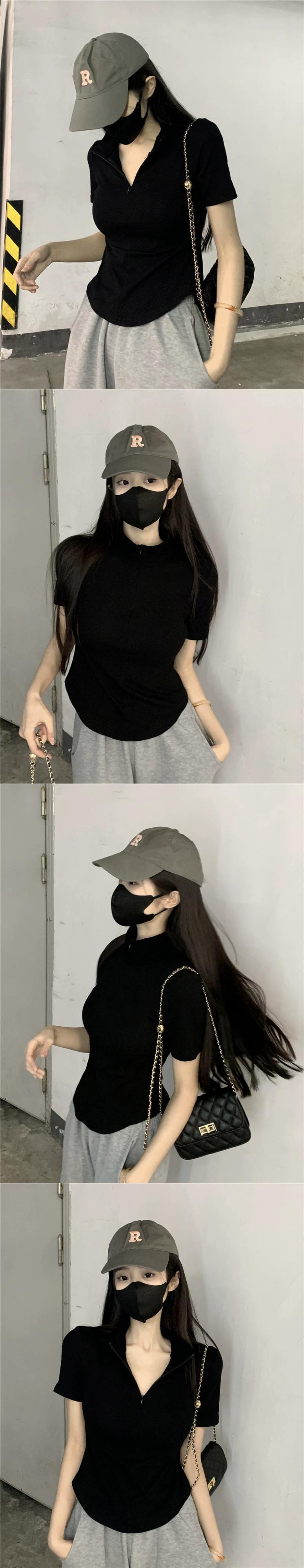 黒の V ネック半袖 T シャツの女性の夏のデザイン自己修養の感覚痩身不規則な裾ショート ポロカラー トップ潮 ブラック サマー 夏物 Vネック Tシャツ 7460060946671325 | framboise21
