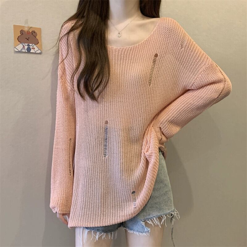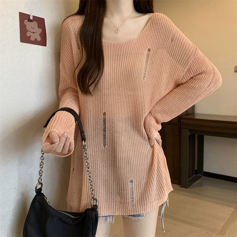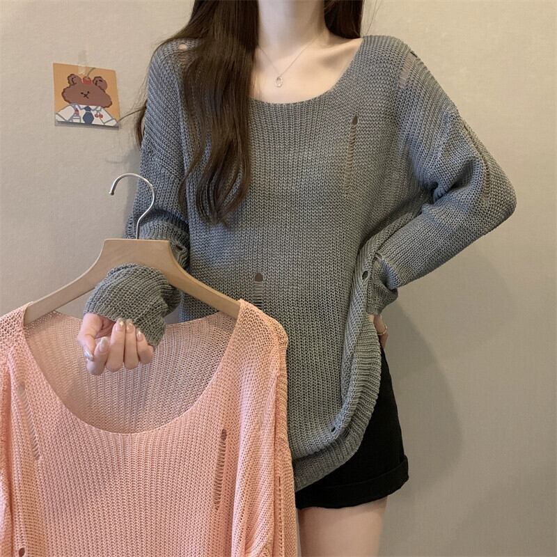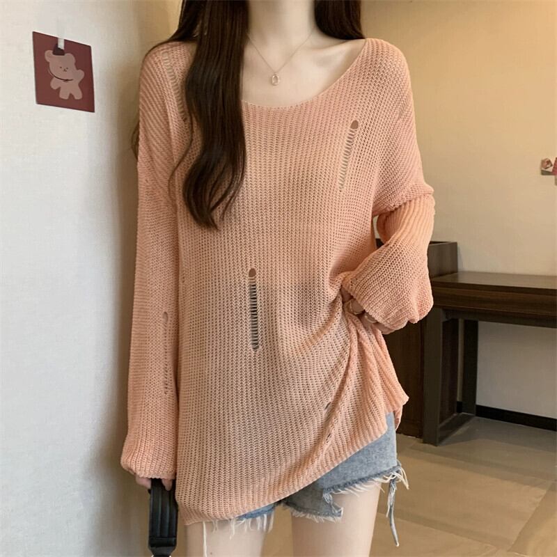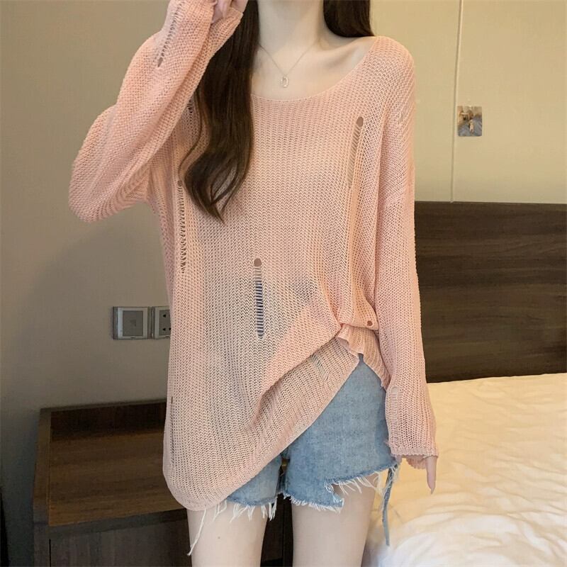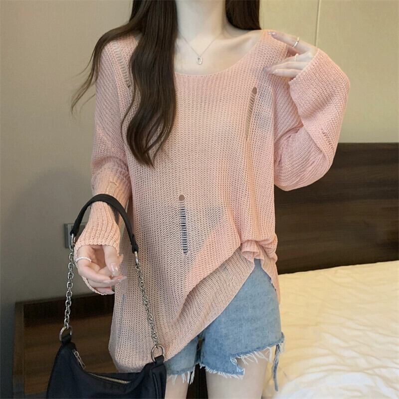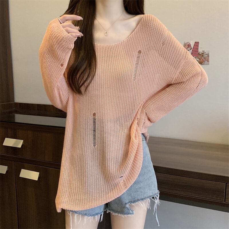 薄いセクションの穴の日焼け止めブラウス、中空ニットセーター付きの女性の夏用サスペンダー、ゆったりとした汎用性の高いミッドレングスのラウンドネックトップ サマー 夏物 Oネック 7460090573269217 | framboise21