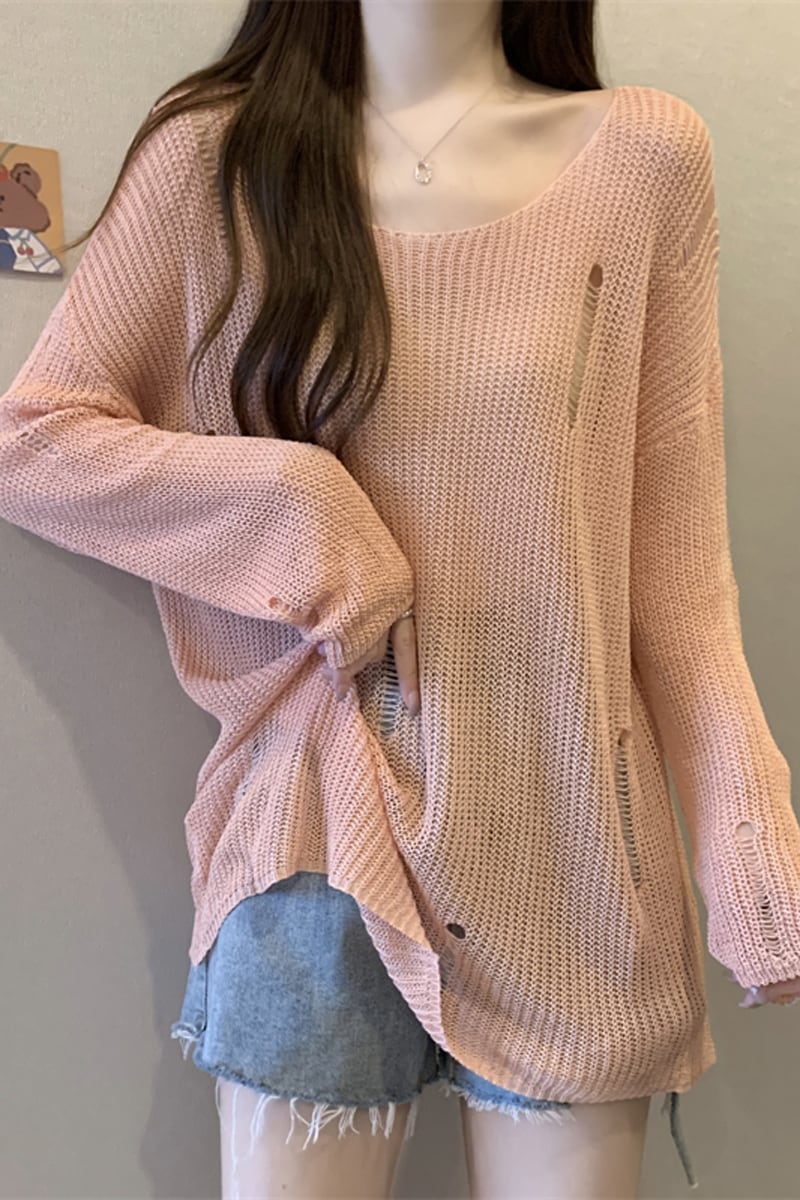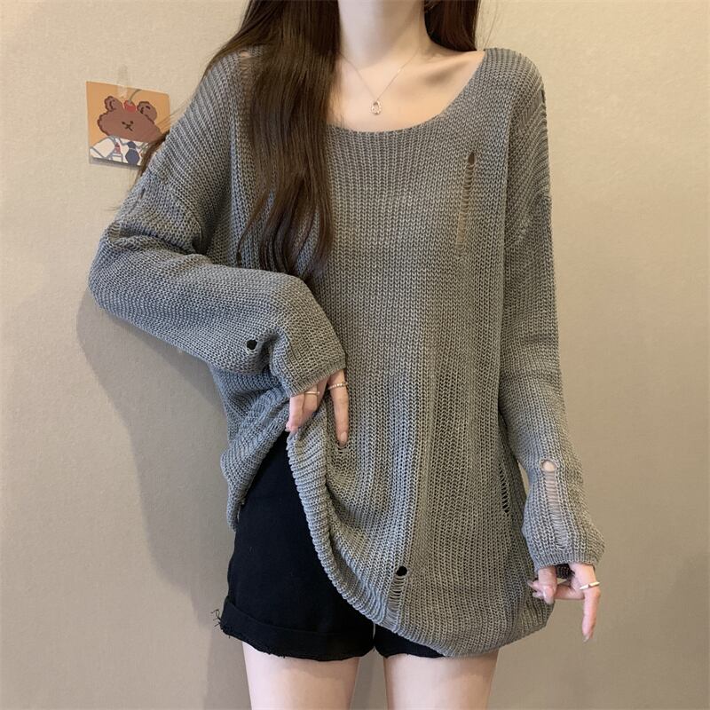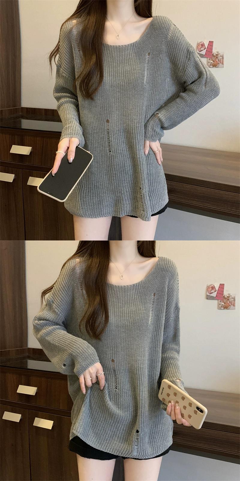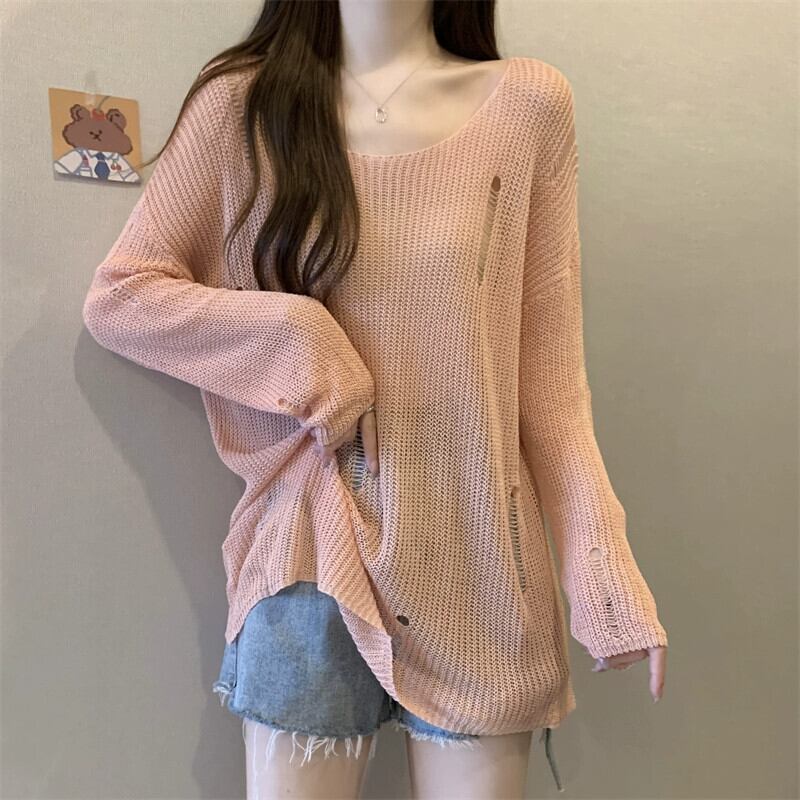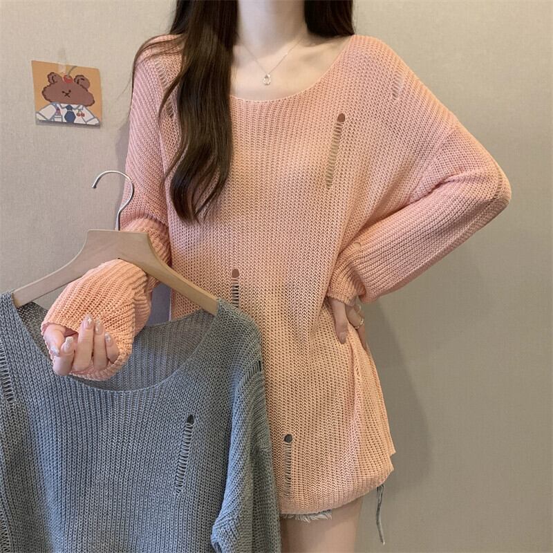 薄いセクションの穴の日焼け止めブラウス、中空ニットセーター付きの女性の夏用サスペンダー、ゆったりとした汎用性の高いミッドレングスのラウンドネックトップ サマー 夏物 Oネック 7460090573269217 | framboise21