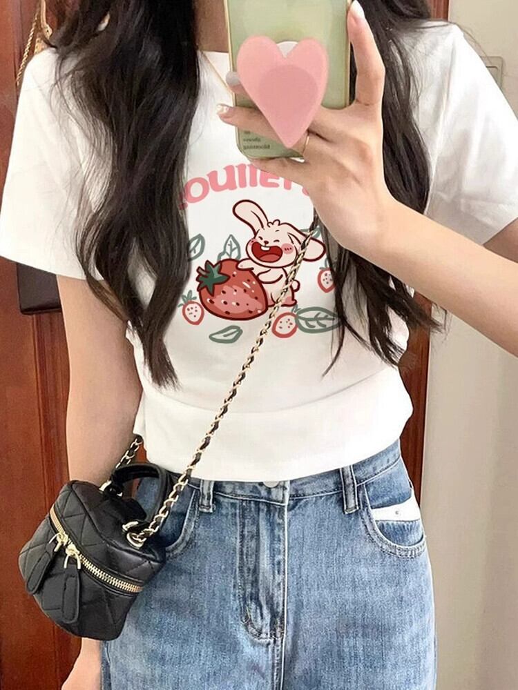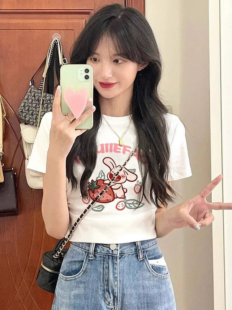 ホワイトコットン半袖Tシャツレディース夏のファッションスリムデザイン漫画プリント小さなシャツハイウエストショートトップ ハイウェスト サマー 夏物 7460028806310035 | framboise21