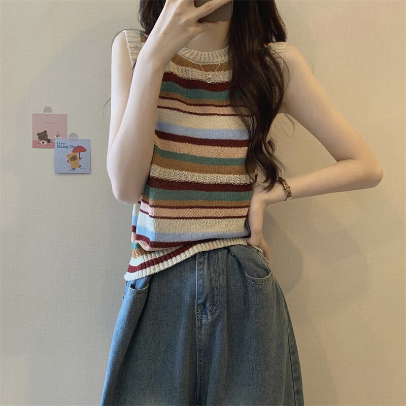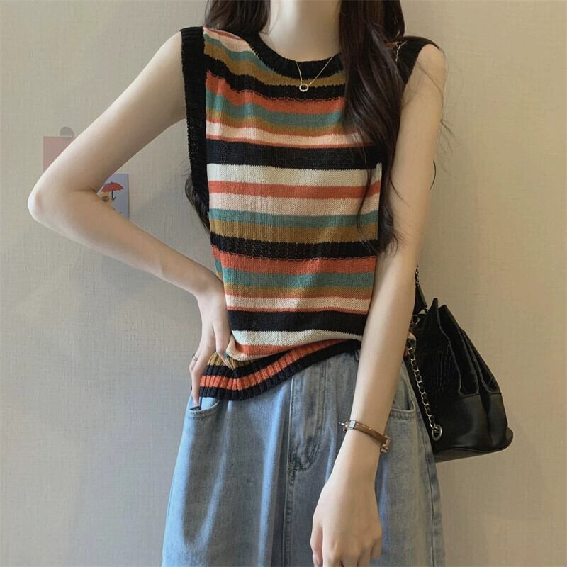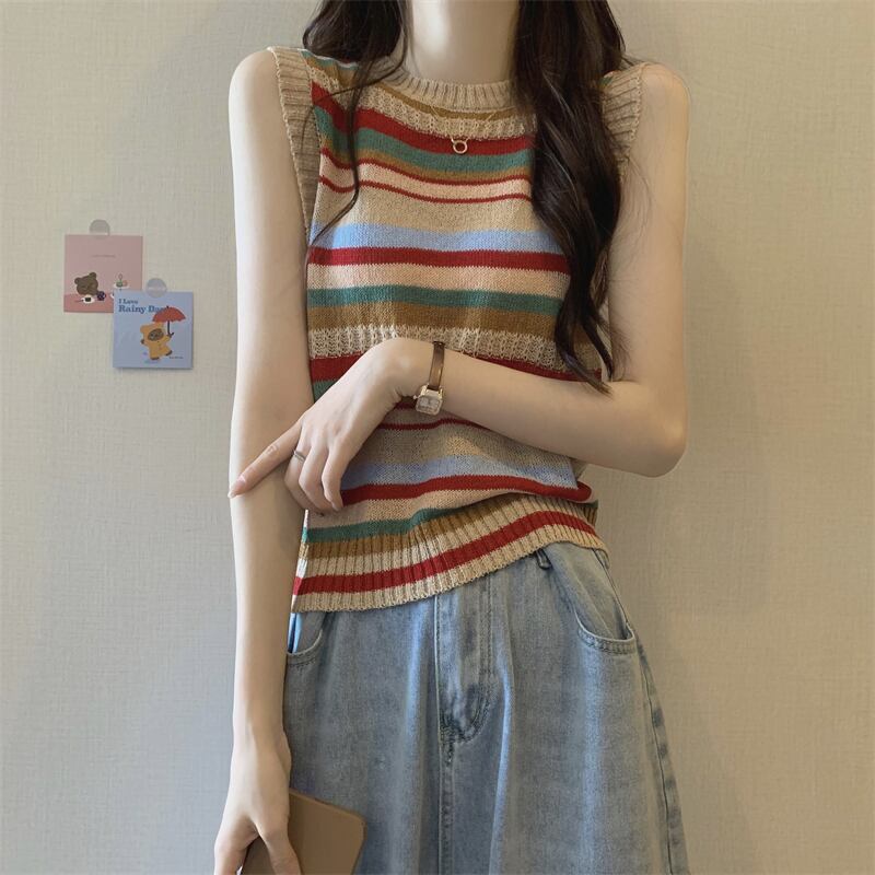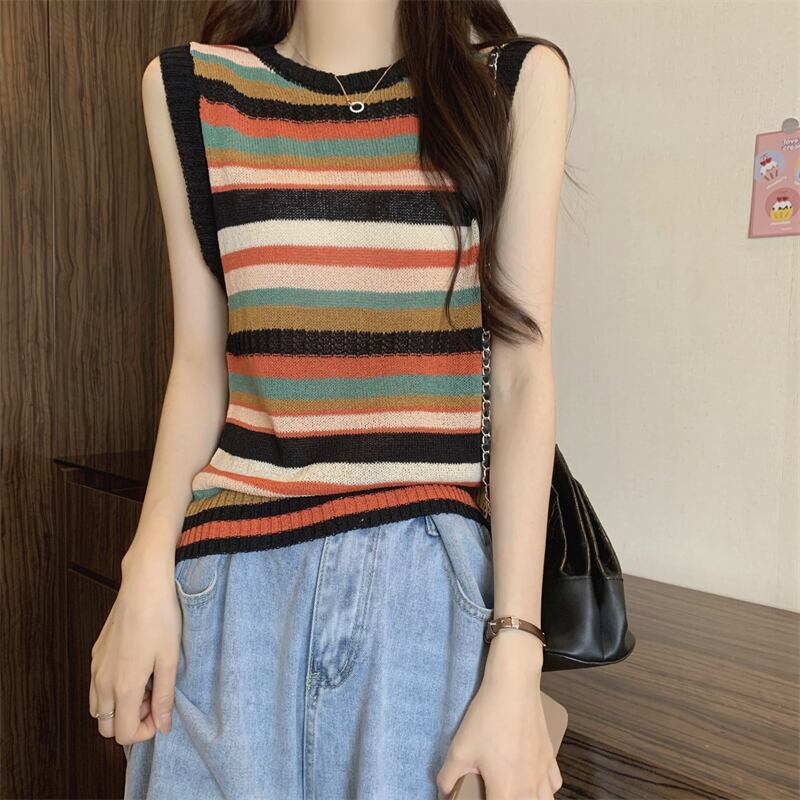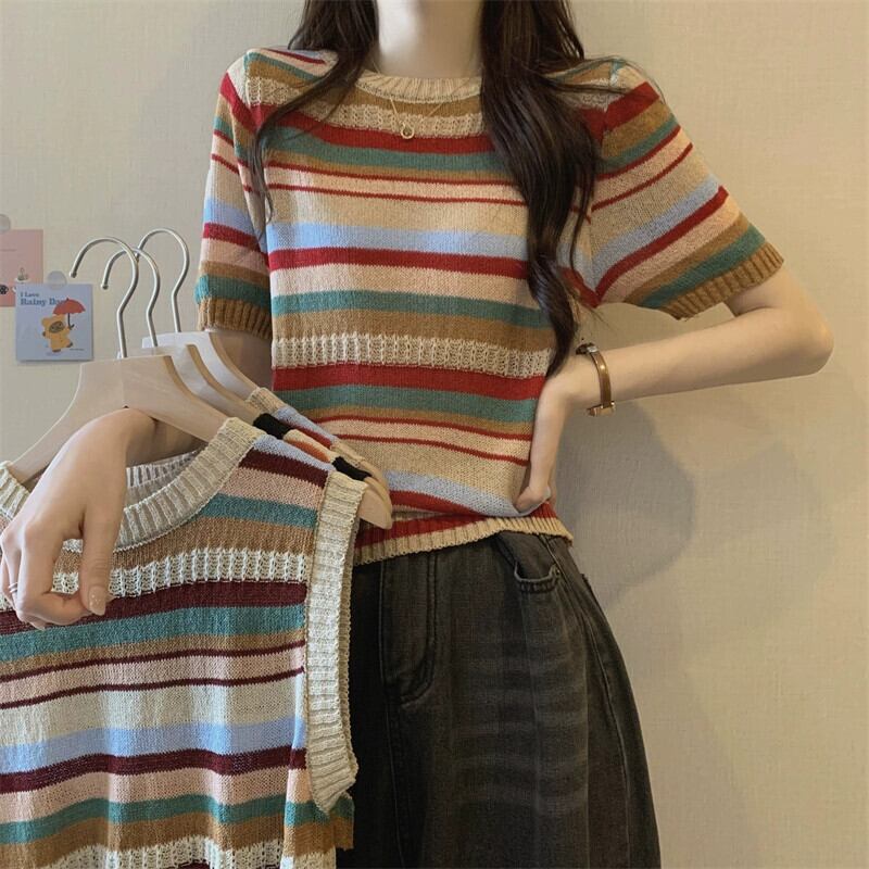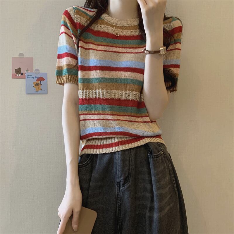 レインボーストライプアイスシルクニット半袖Tシャツレディース夏フレンチレトロデザインセンス薄肉ショートラウンドネックトップ サマー 夏物 Oネック 7460072100911543 | framboise21