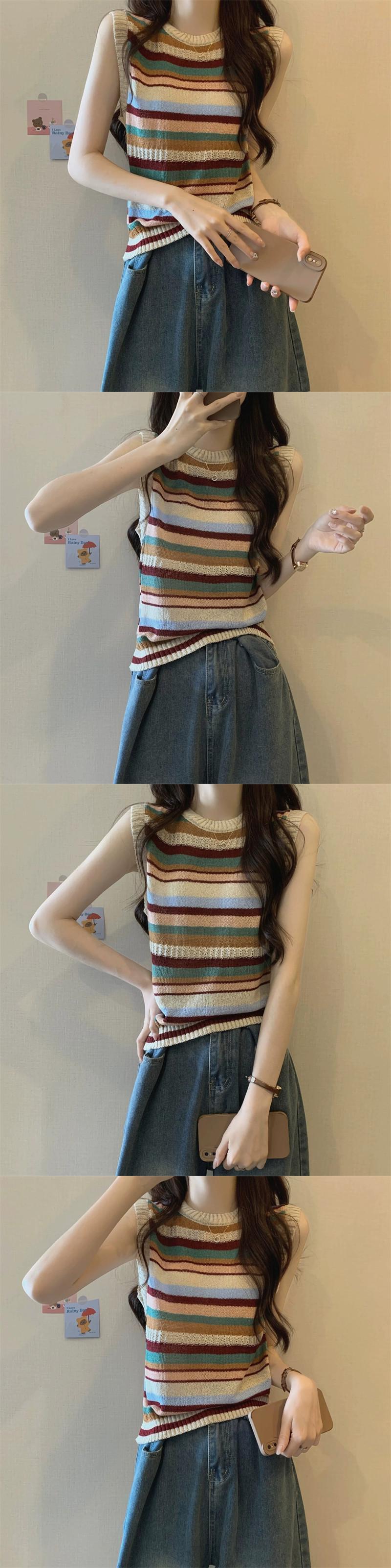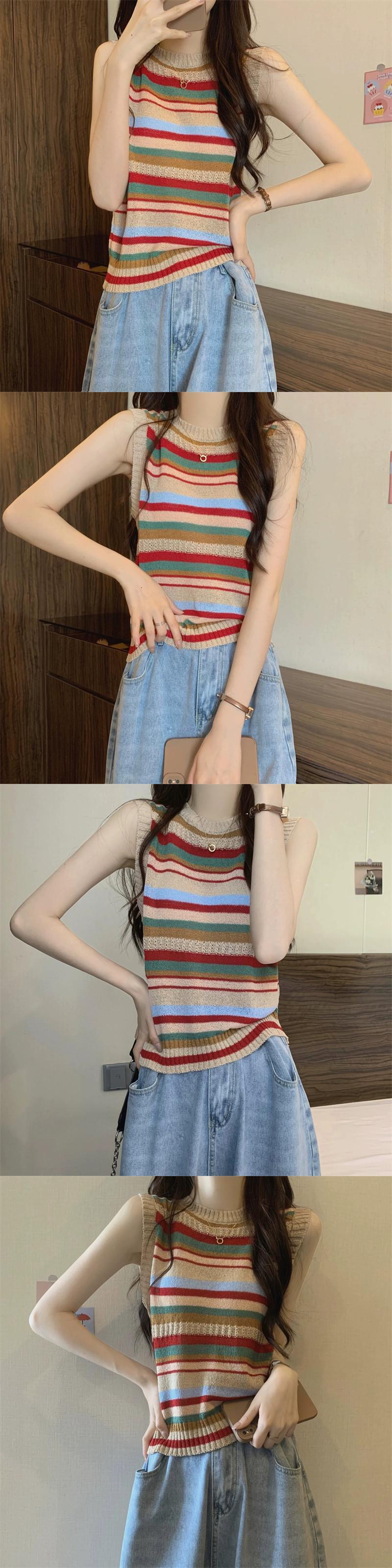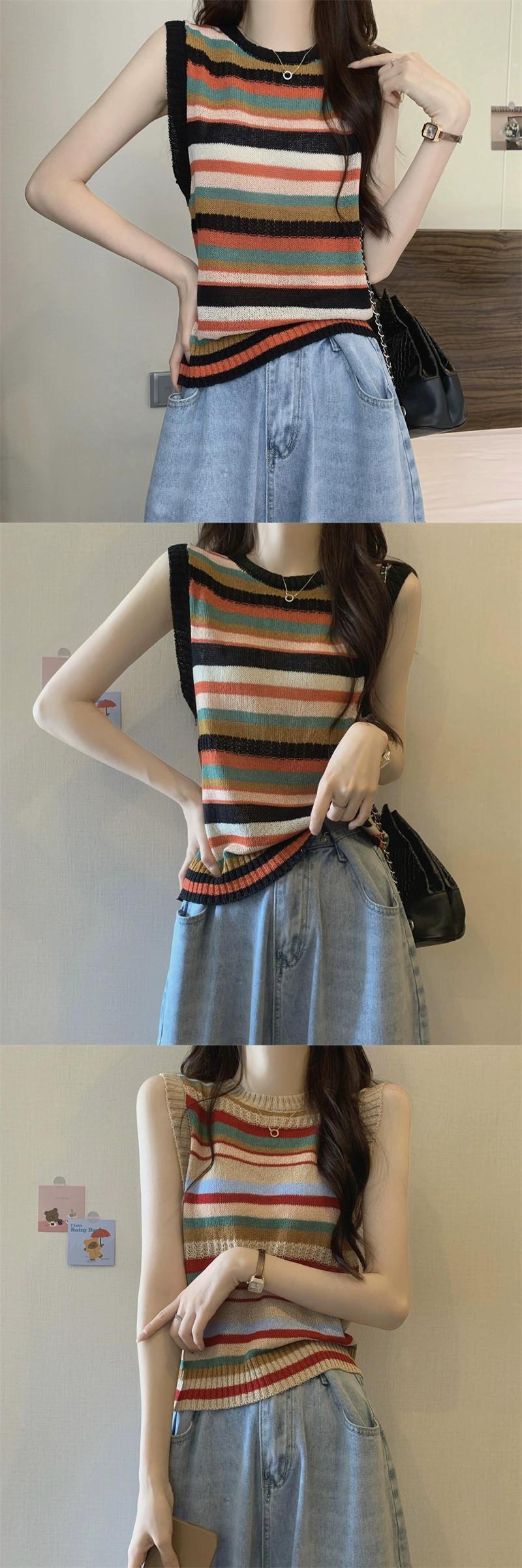 レインボーストライプアイスシルクニット半袖Tシャツレディース夏フレンチレトロデザインセンス薄肉ショートラウンドネックトップ サマー 夏物 Oネック 7460072100911543 | framboise21