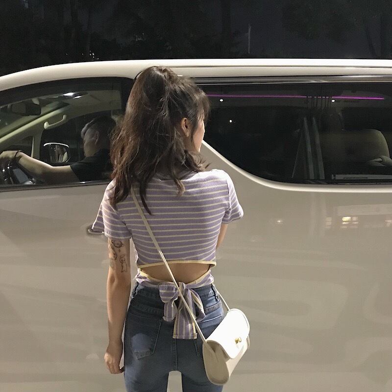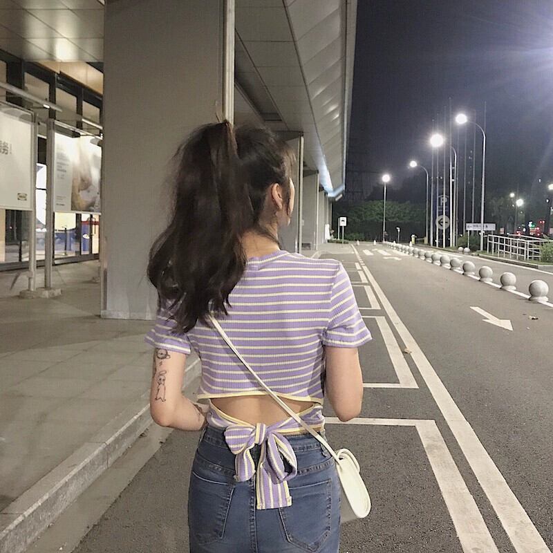 ストライプショルダー半袖Tシャツレディース夏のファッションデザイン自己修養の感覚ショートネクタイバックレスボウトップ潮 リボン サマー 夏物 7460084908042076 | framboise21