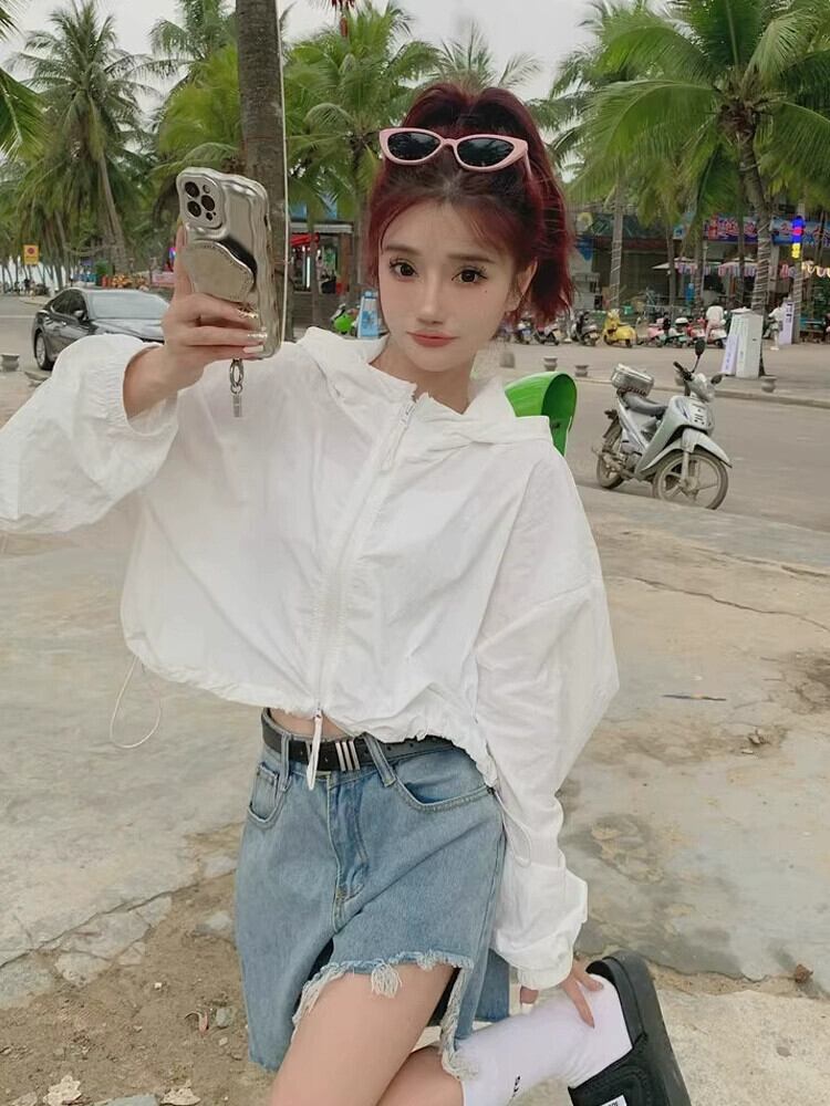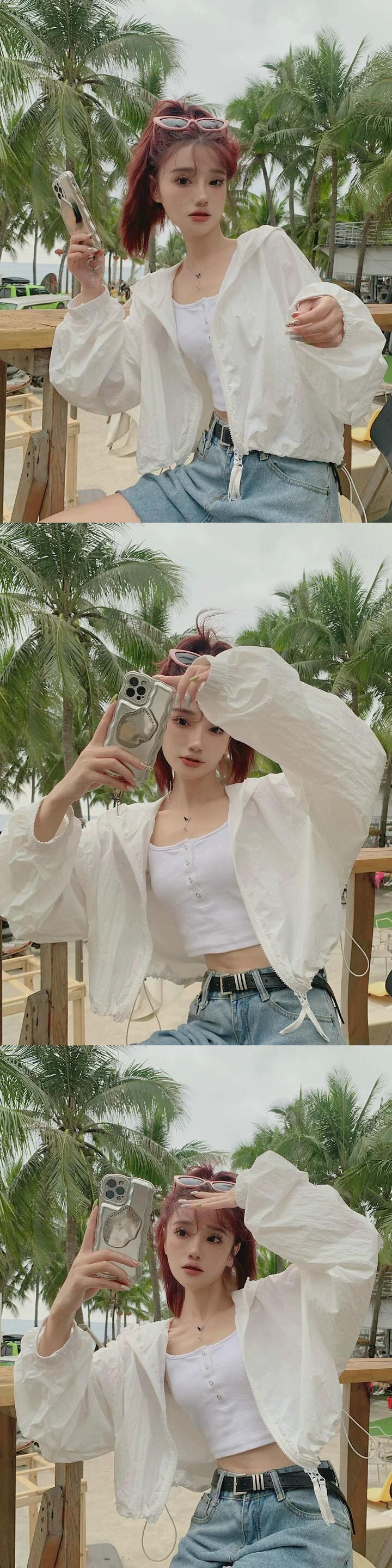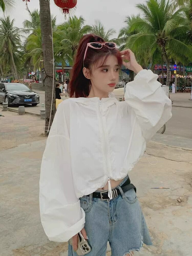 軽くて通気性のある日焼け防止服の女性の夏の 2023 新しいファッションルーズアウター巾着ショートフード付きジャケット白 ホワイト サマー 夏物 7460031255443184 | framboise21