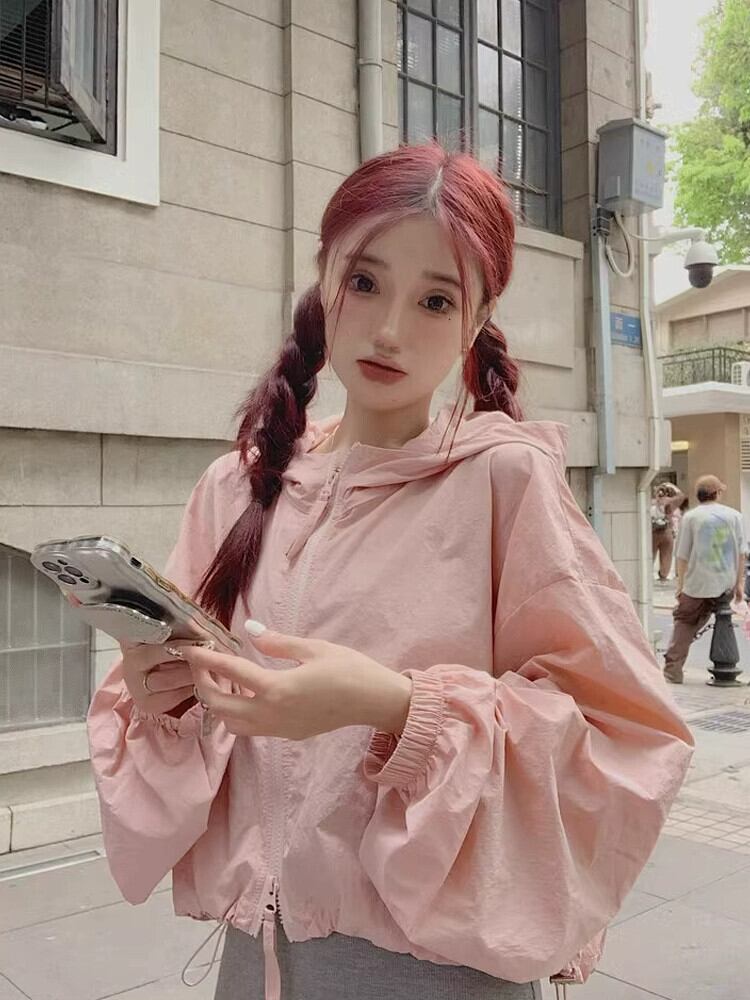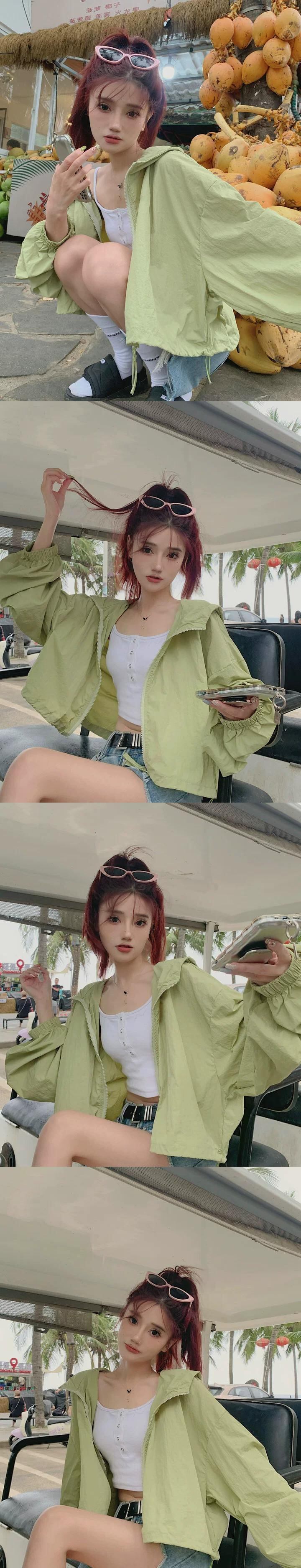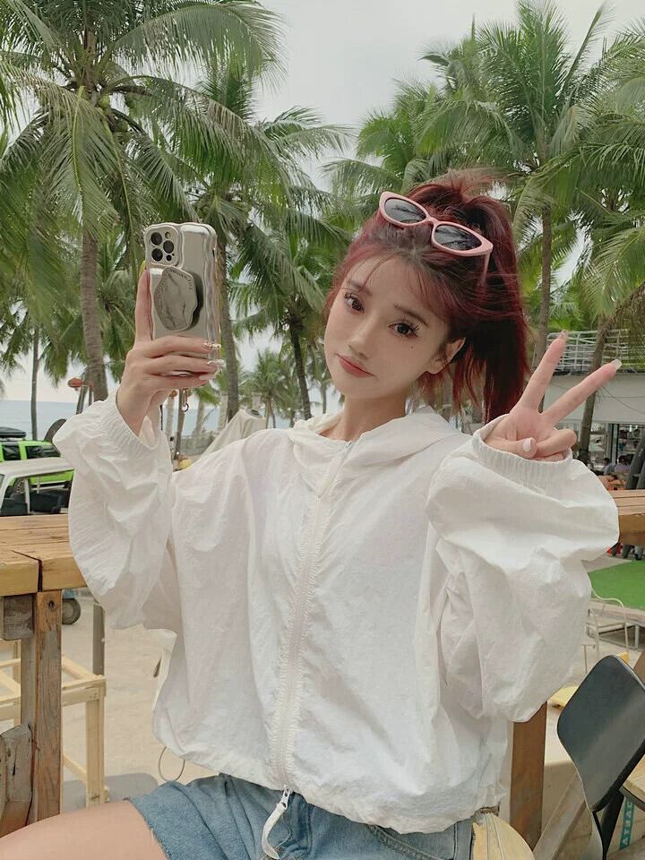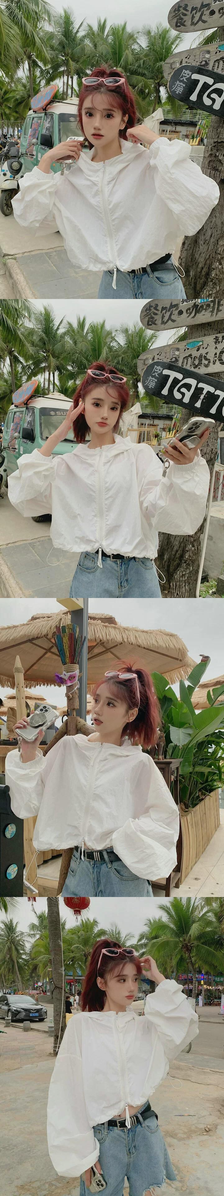 軽くて通気性のある日焼け防止服の女性の夏の 2023 新しいファッションルーズアウター巾着ショートフード付きジャケット白 ホワイト サマー 夏物 7460031255443184 | framboise21