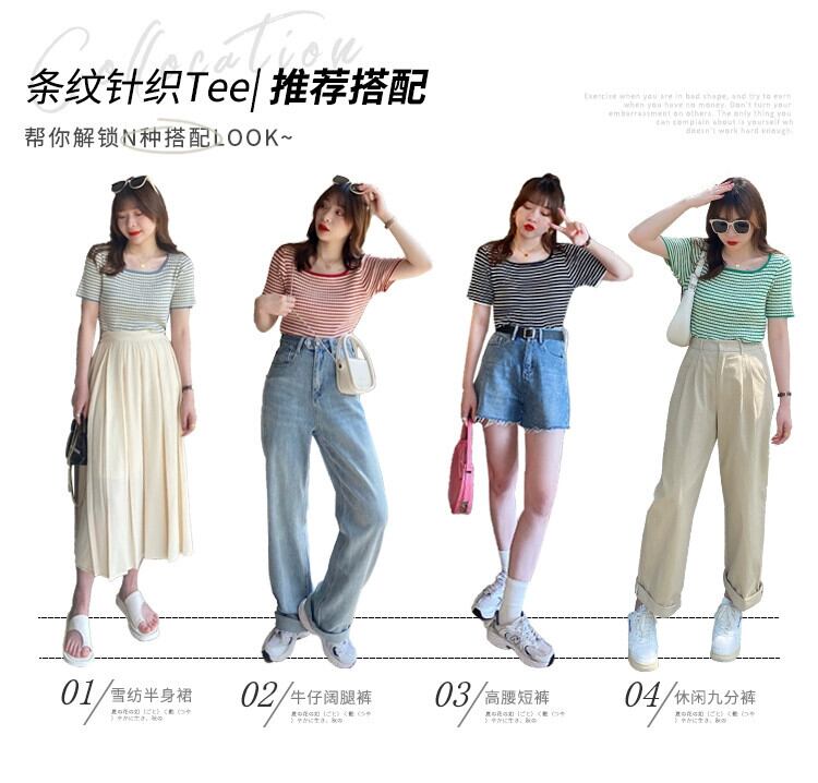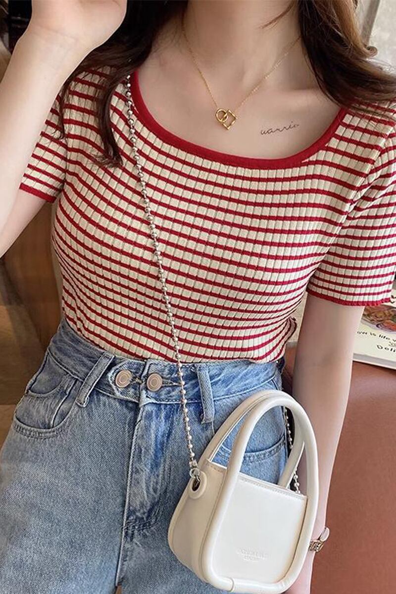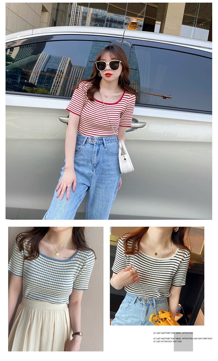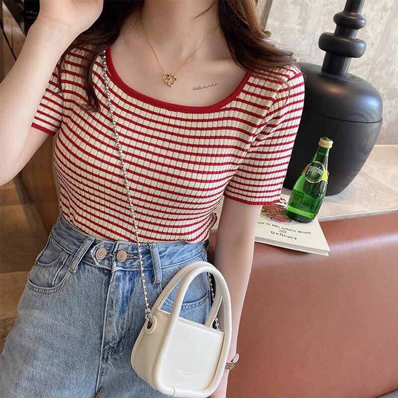 赤い縞模様の半袖ニットセーター女性の2023年夏新しいデザインの自己修養の感覚と痩身アイスシルクスクエアカラートップ レッド サマー 夏物 ストライプ スクウェア 7460073687479710 | framboise21