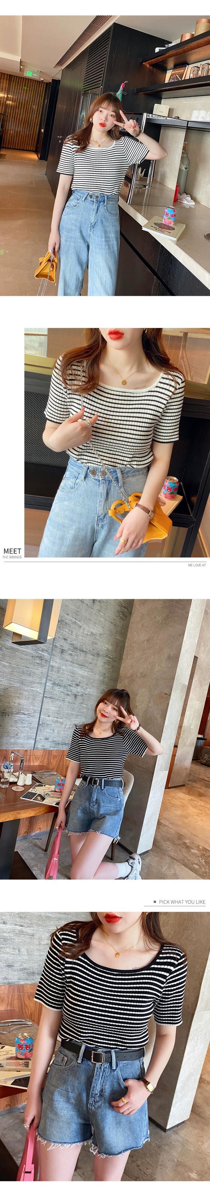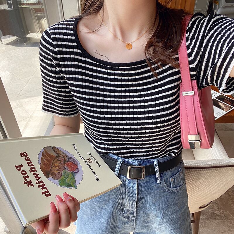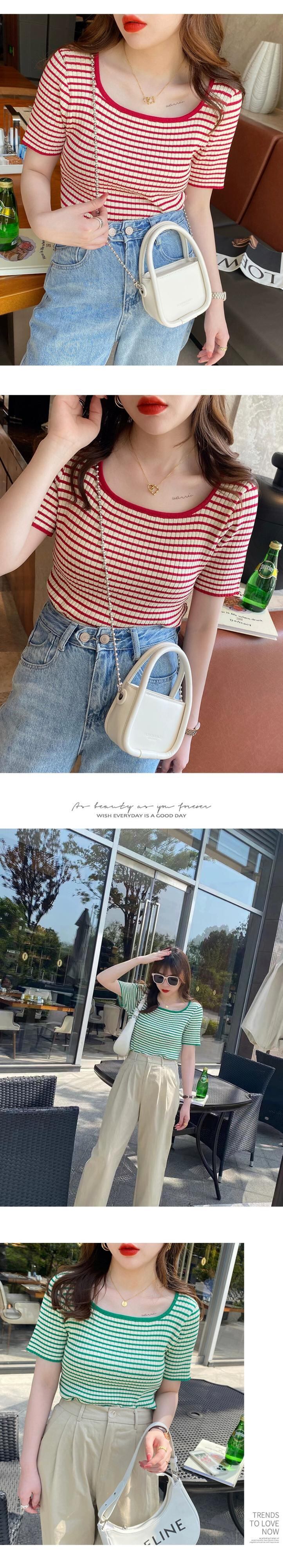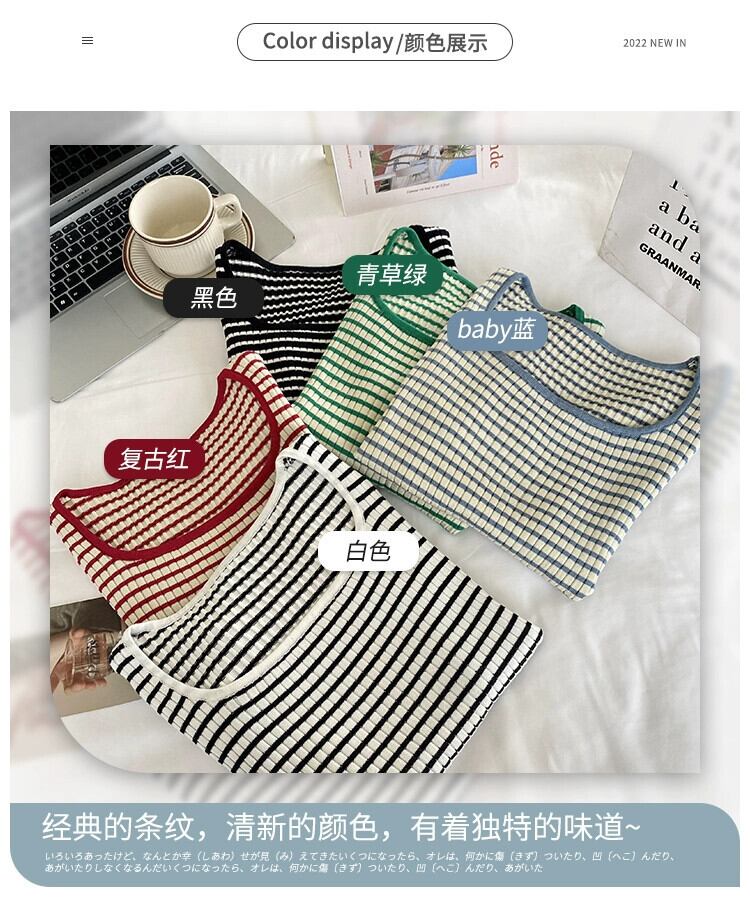 赤い縞模様の半袖ニットセーター女性の2023年夏新しいデザインの自己修養の感覚と痩身アイスシルクスクエアカラートップ レッド サマー 夏物 ストライプ スクウェア 7460073687479710 | framboise21