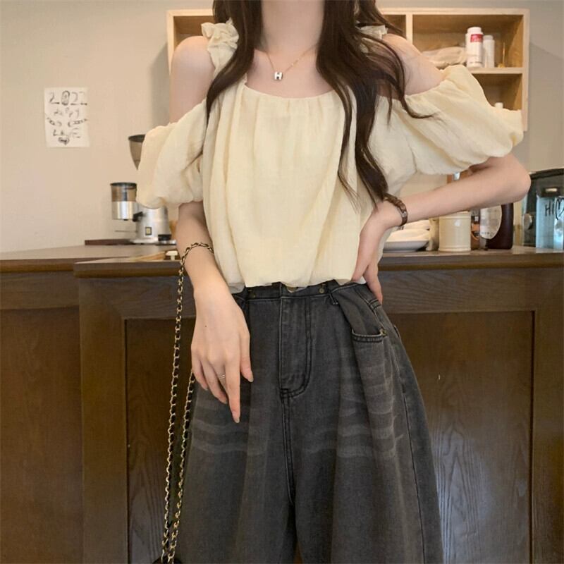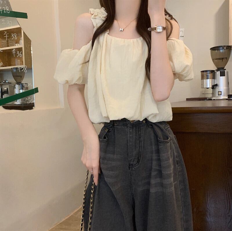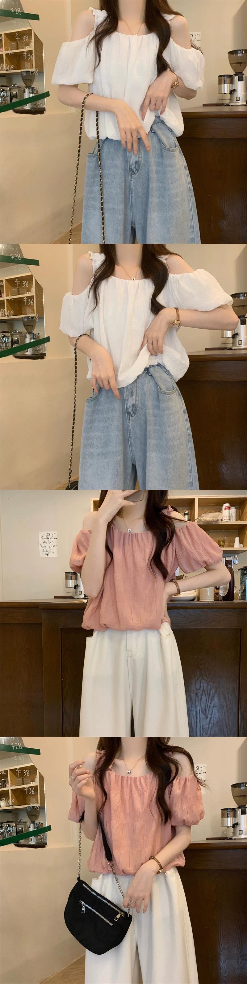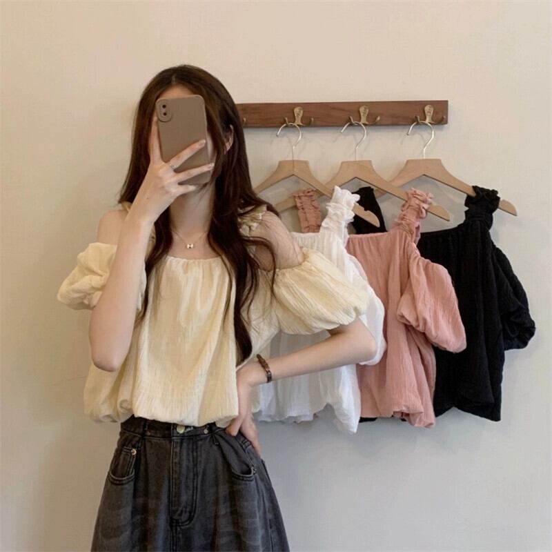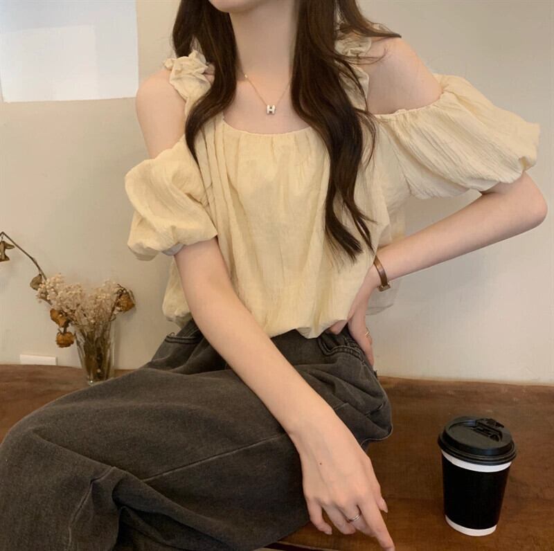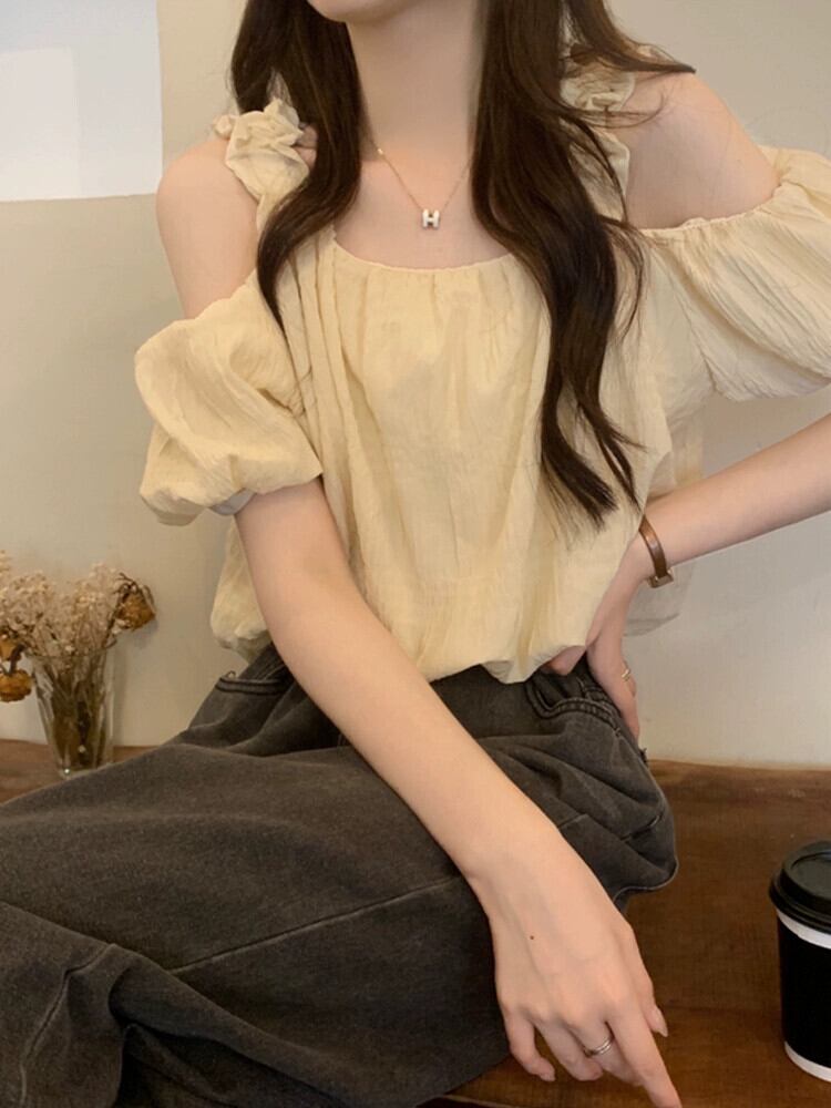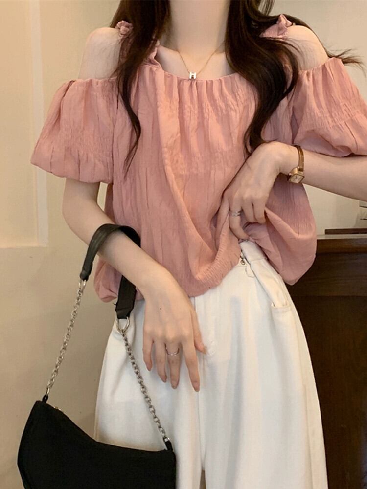 ピンクのスクエアカラーバブル半袖シャツの女性の 2023 夏の新しいデザインセンスルーズシックなショートストラップレストップ サマー 夏物 スクウェア 7460011894671224 | framboise21
