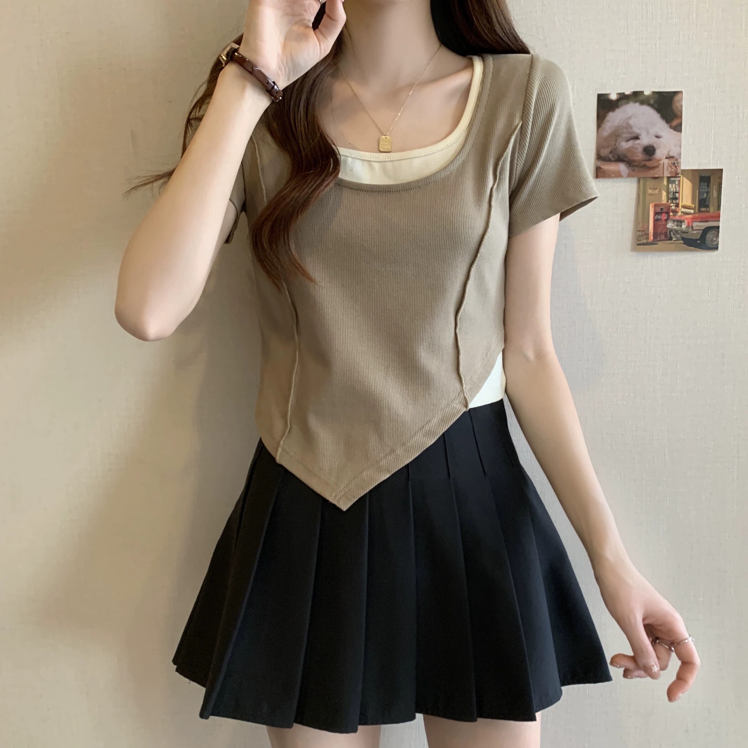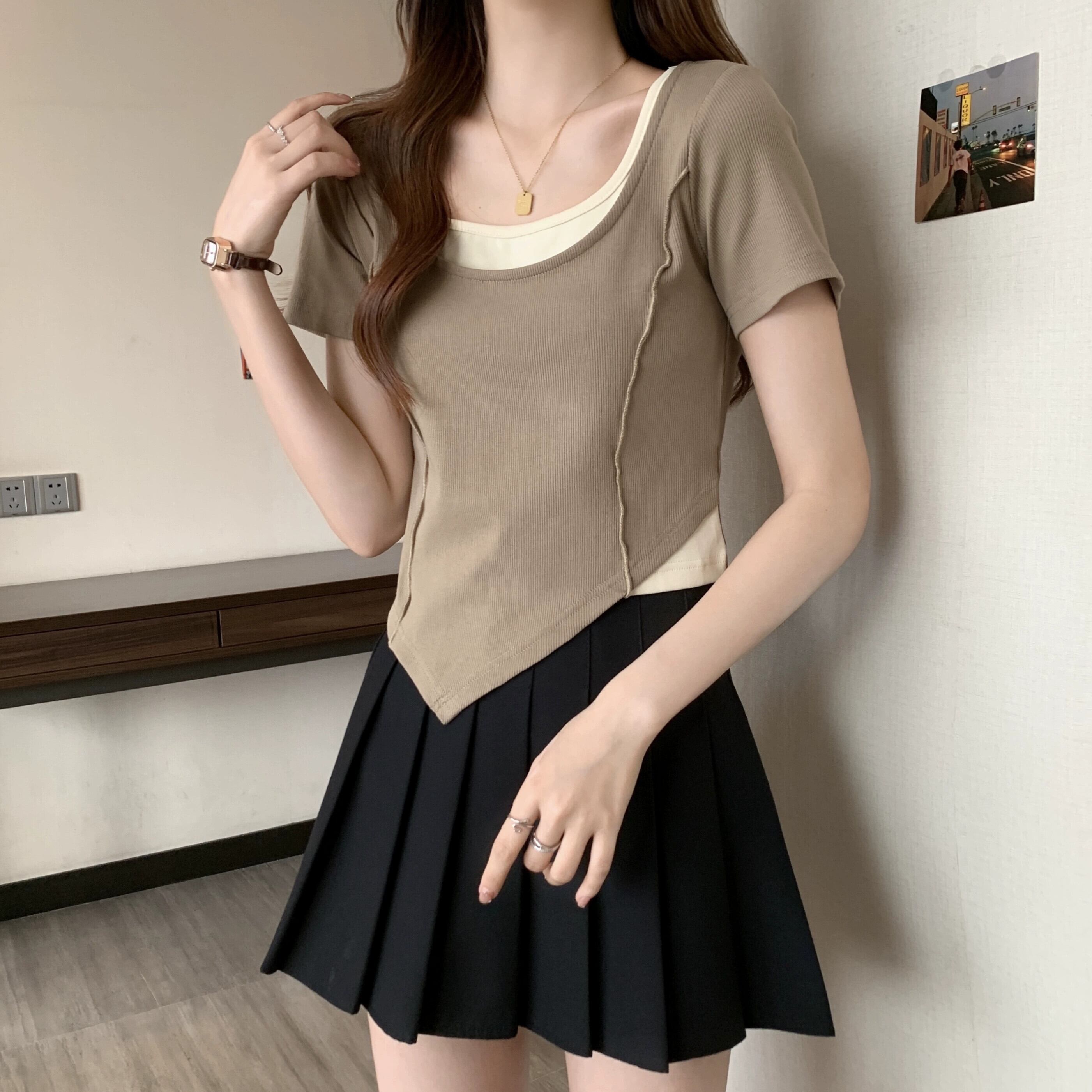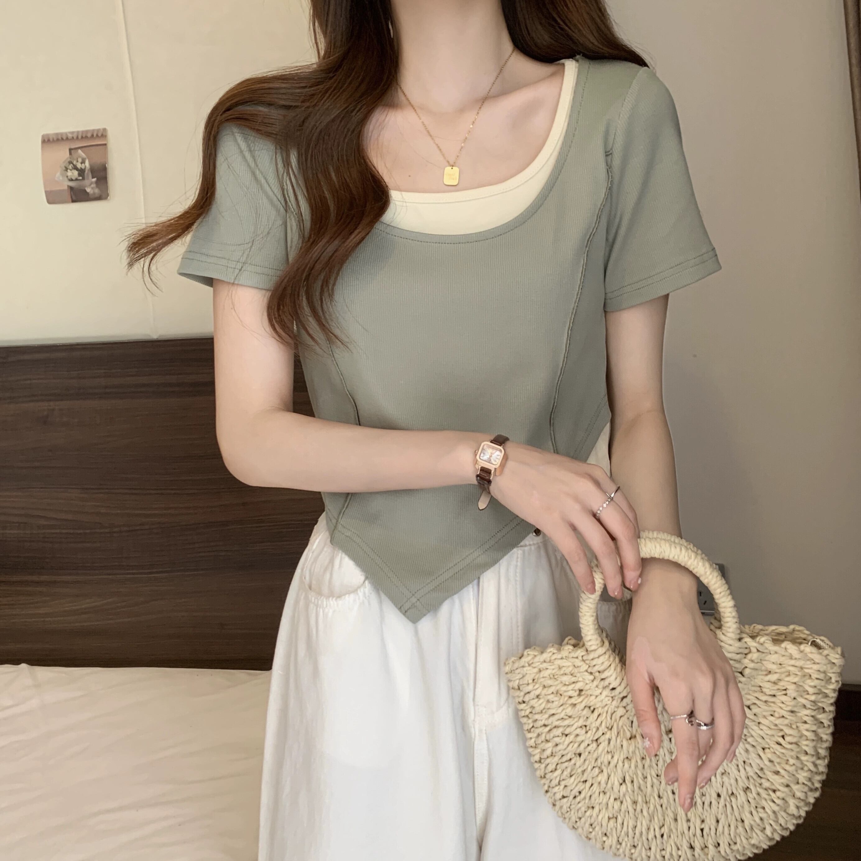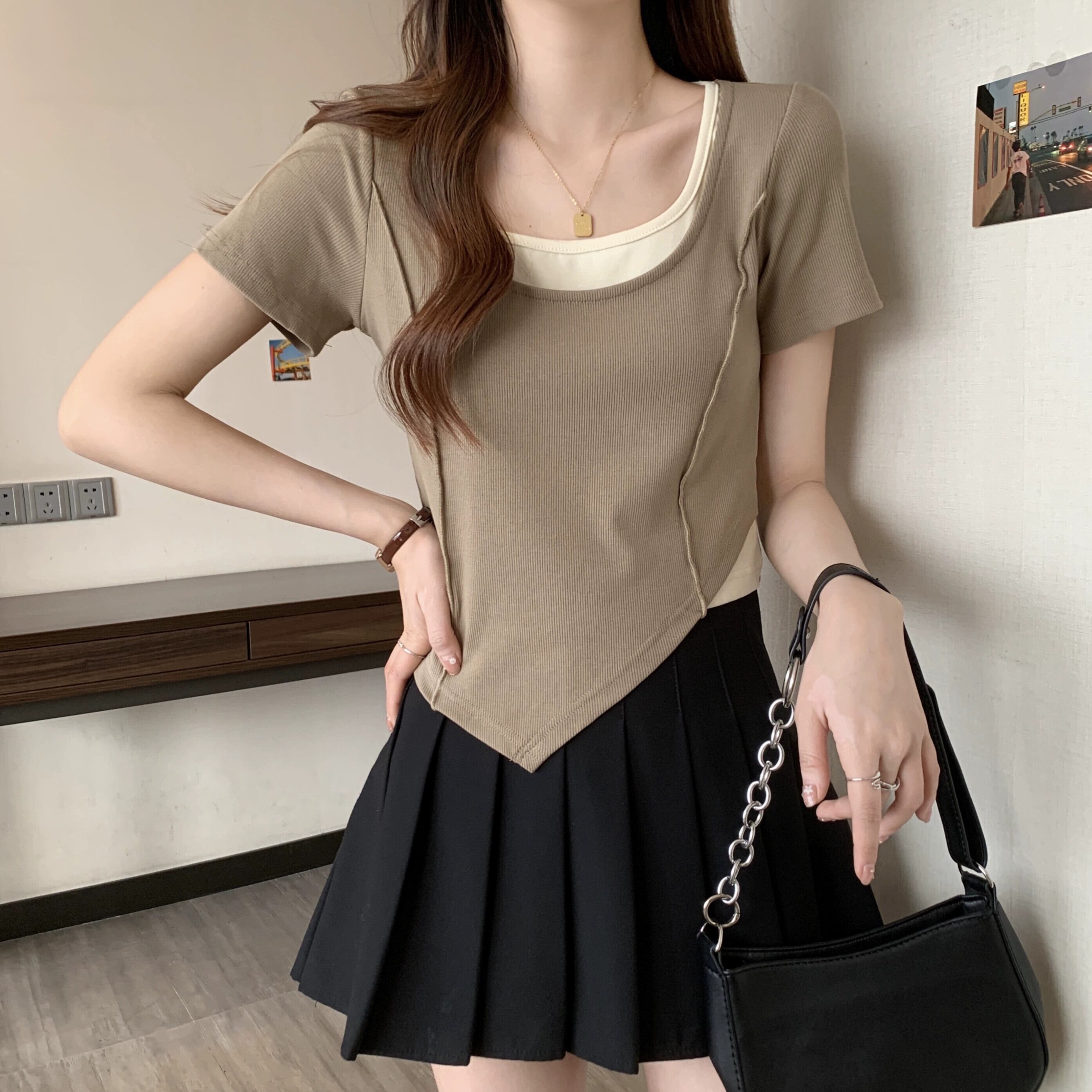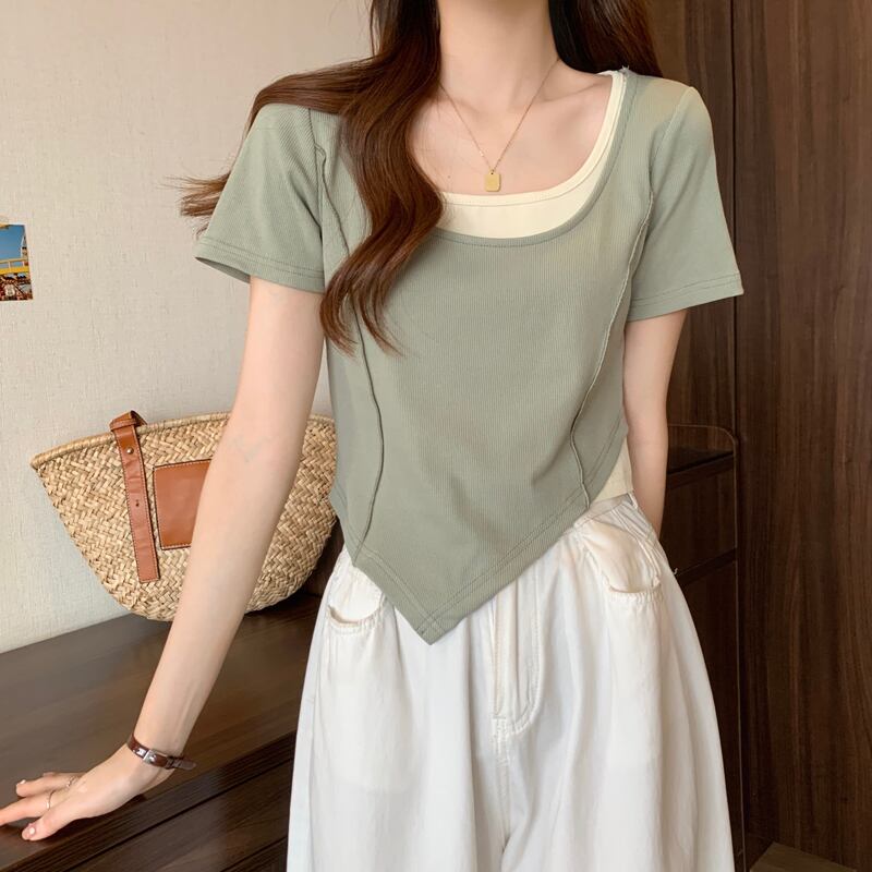 イレギュラーヘム半袖Tシャツレディース夏のファッションデザイン自己修養の感覚ショートスプライシングフェイクツーピースラウンドネックトップ サマー 夏物 Oネック 746004139831090 | framboise21