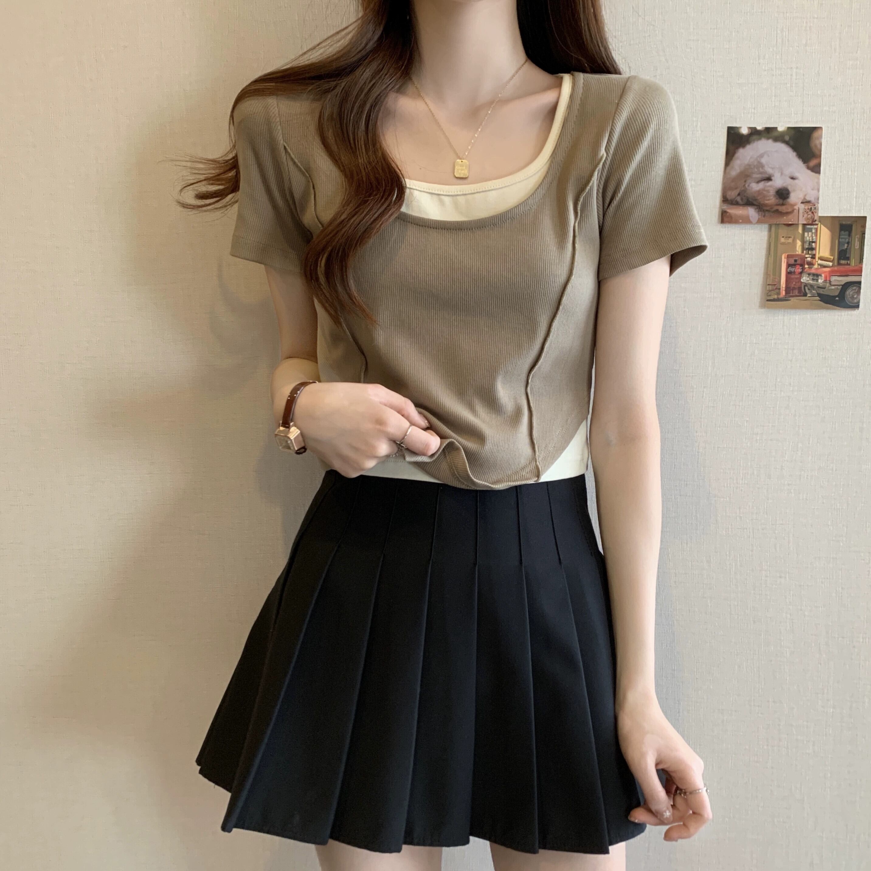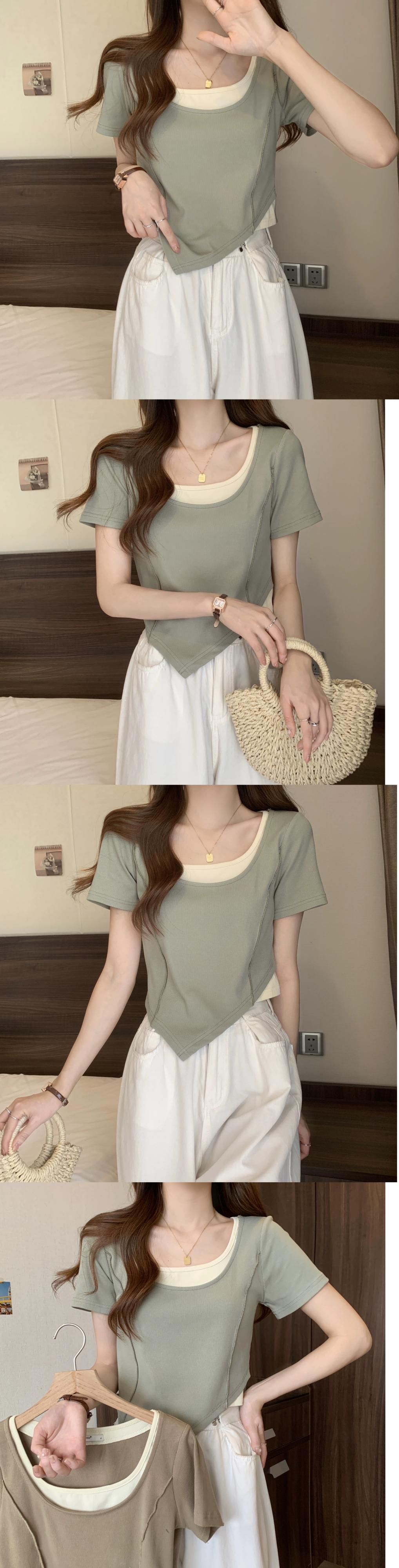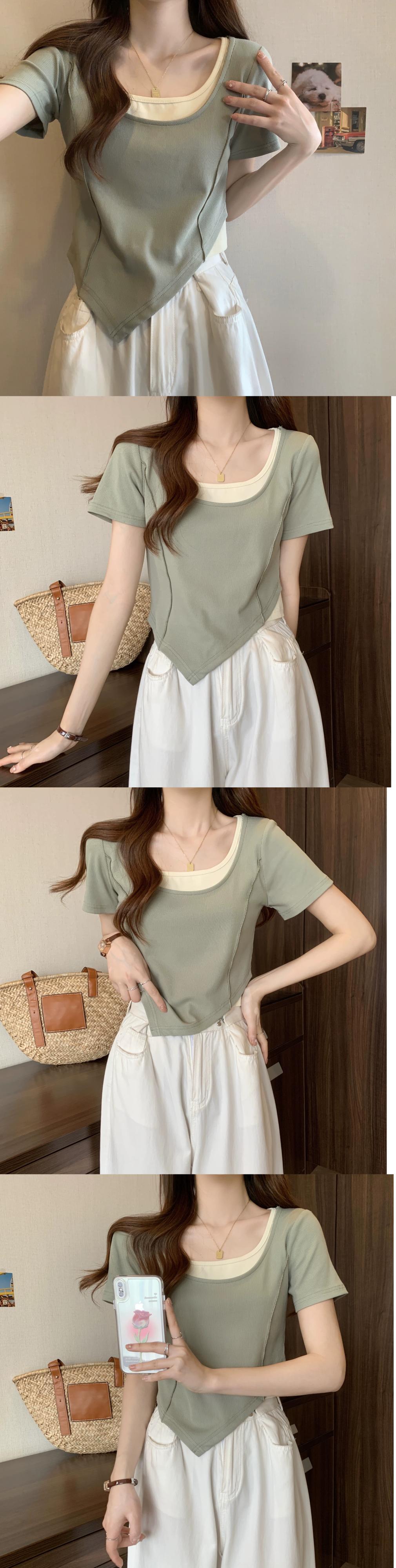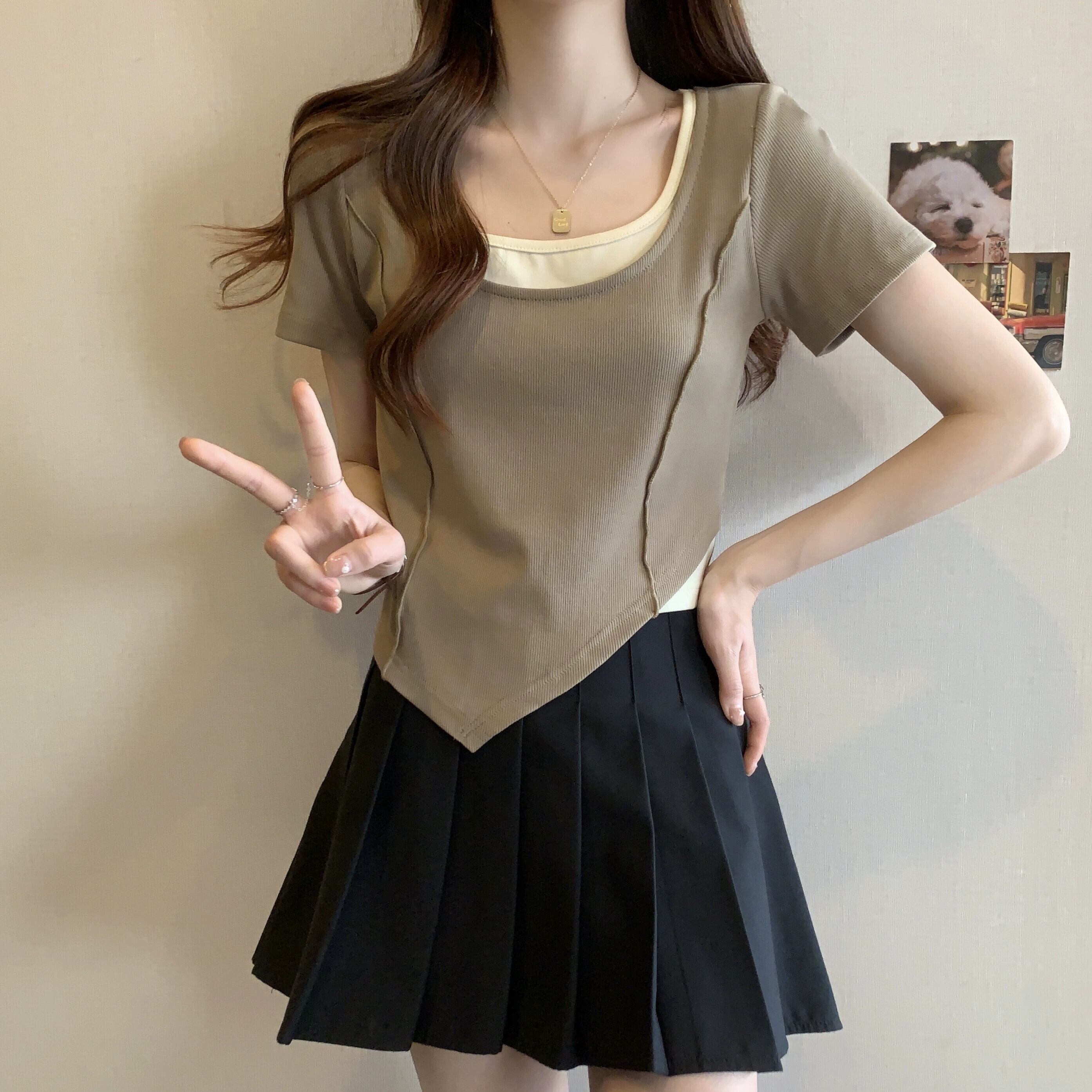 イレギュラーヘム半袖Tシャツレディース夏のファッションデザイン自己修養の感覚ショートスプライシングフェイクツーピースラウンドネックトップ サマー 夏物 Oネック 746004139831090 | framboise21