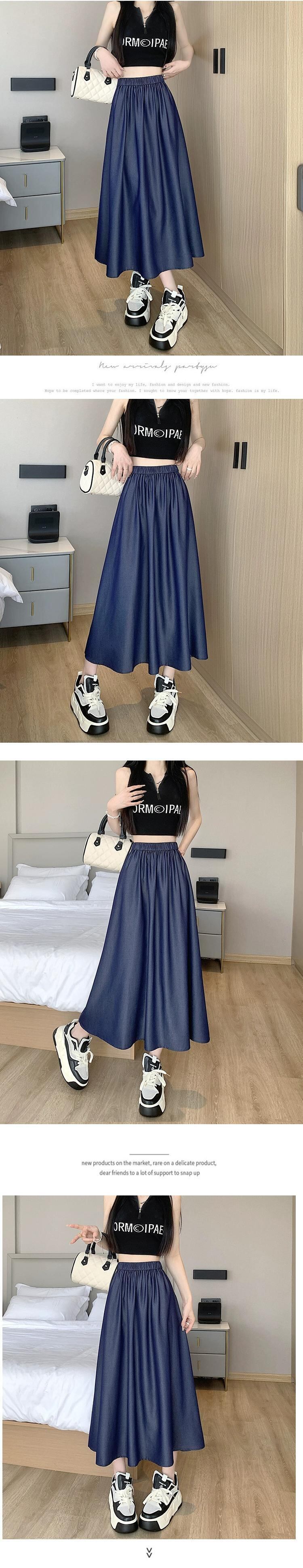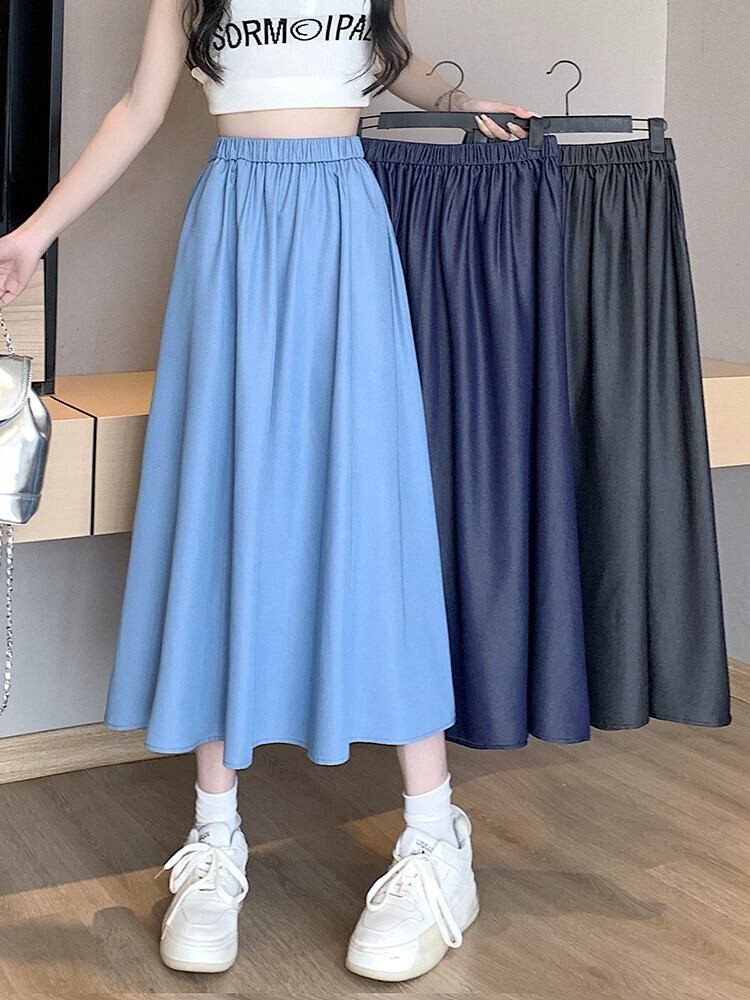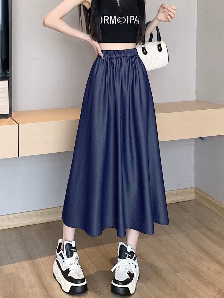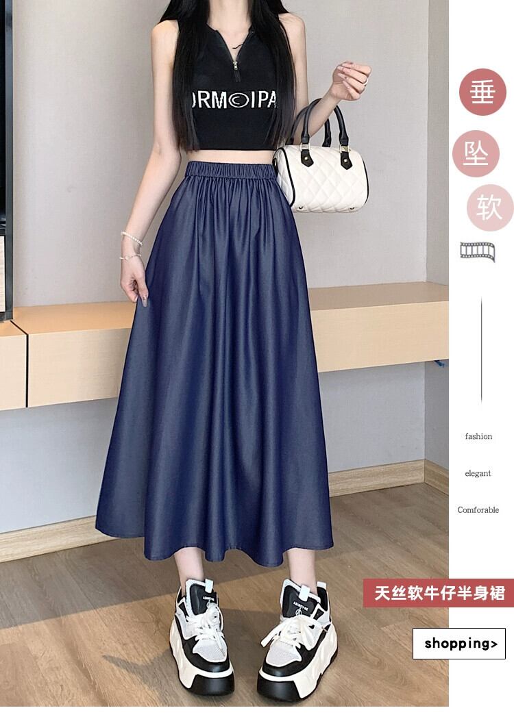 薄いテンセルデニムスカート女性の夏のレトロウエストスリム A ライン傘スカートミッドレングスドレープスイングスカート サマー 夏物 Aライン 7460079431677928 | framboise21