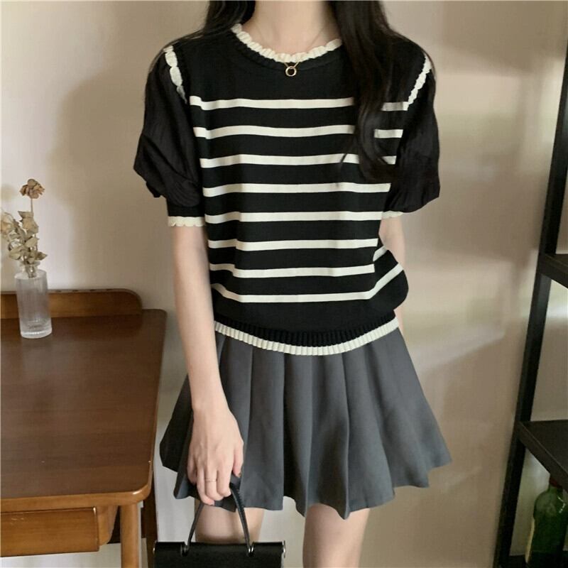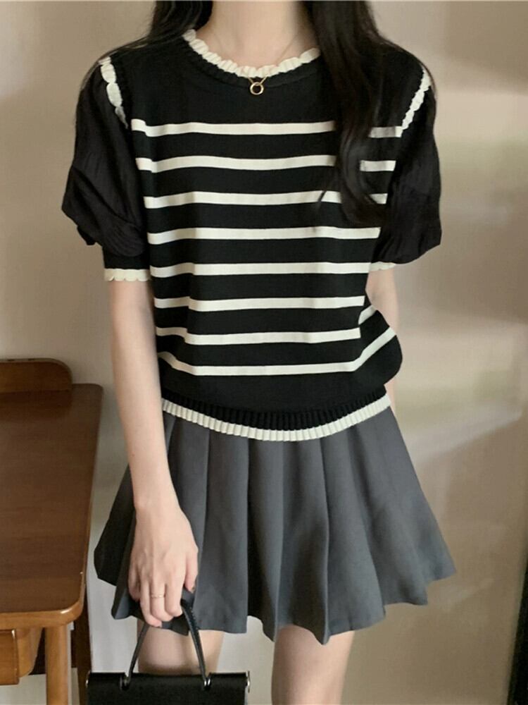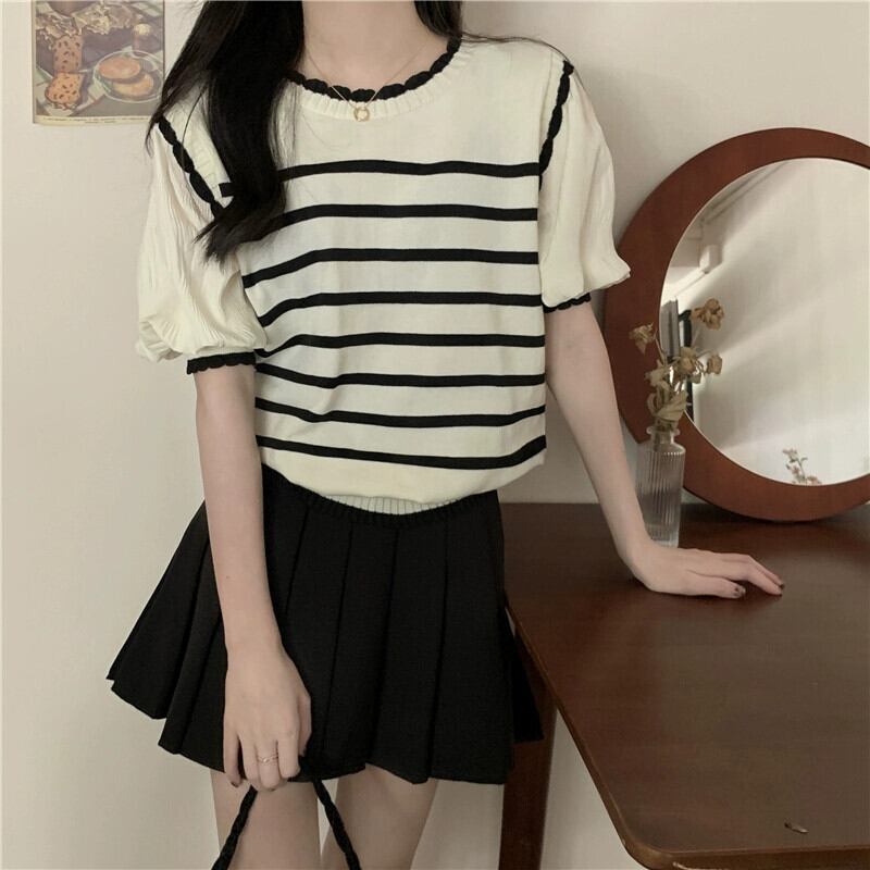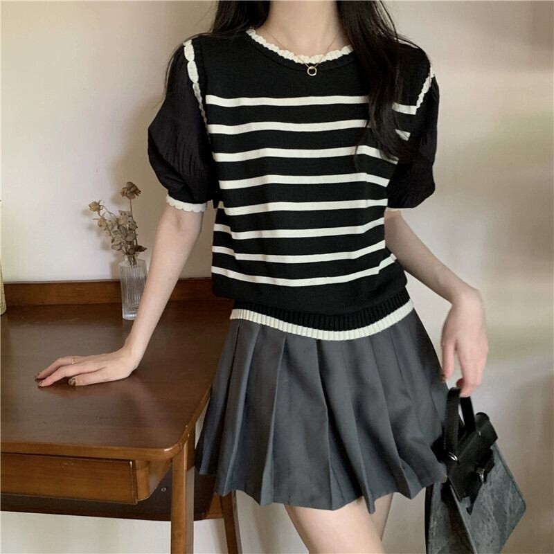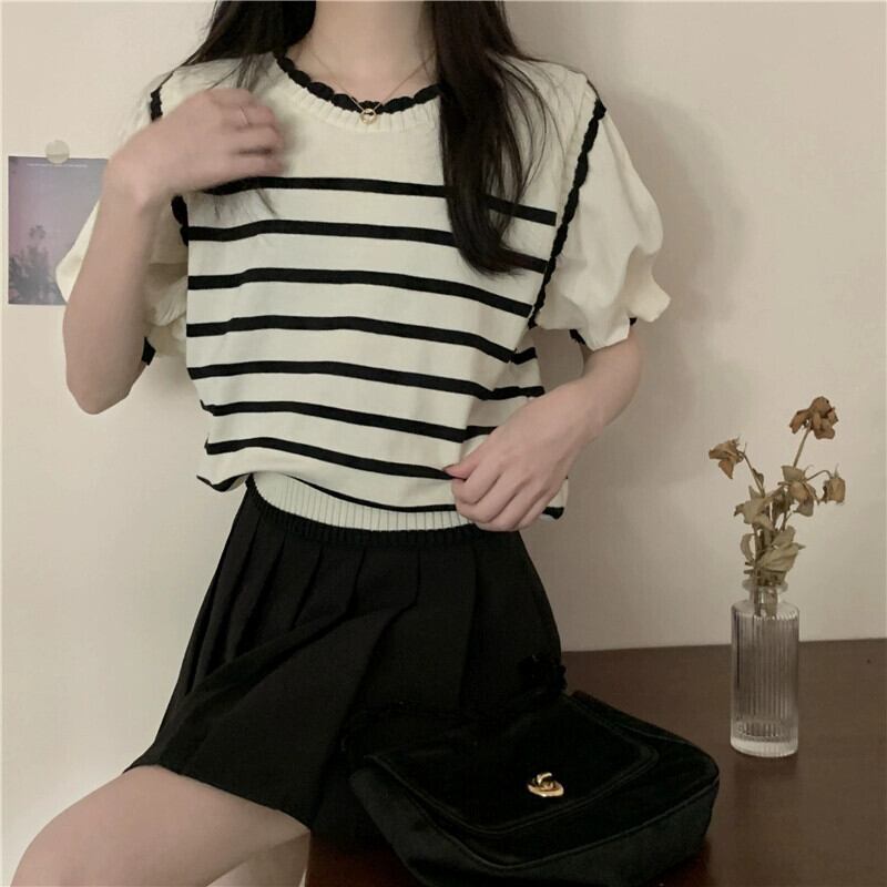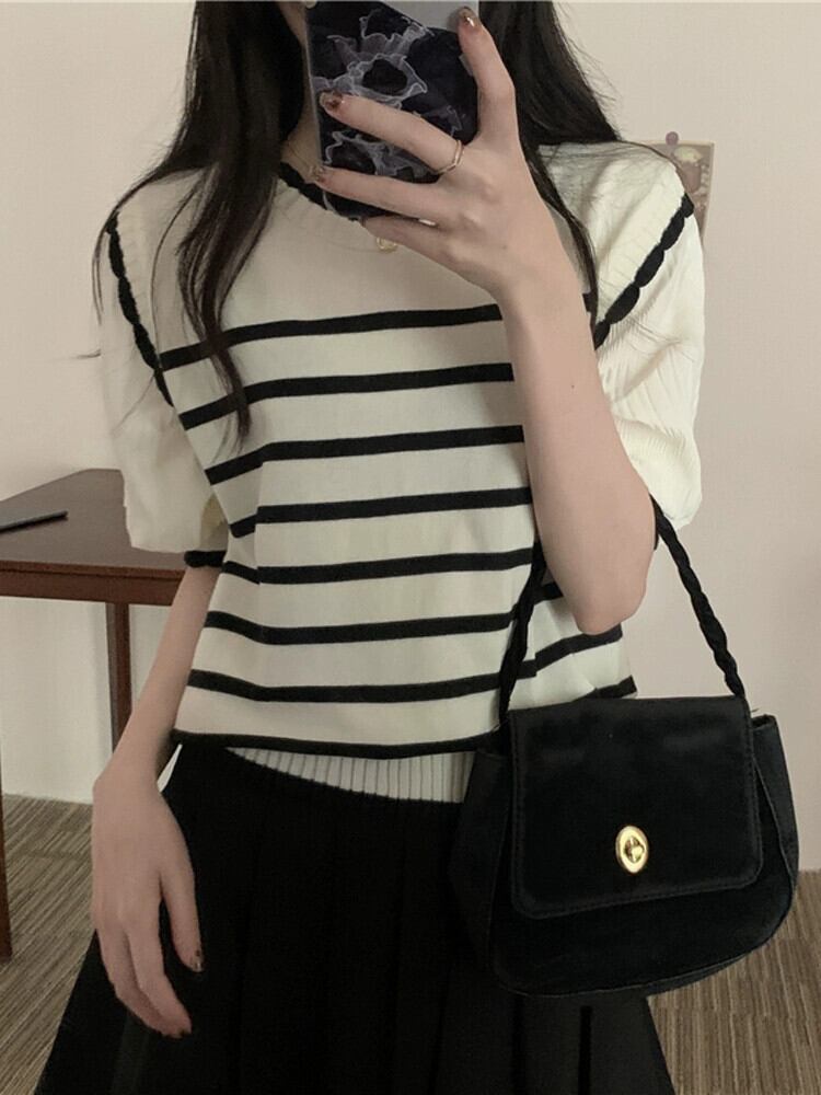 黒と白のストライプの半袖セーターの女性の夏のデザイン感覚、ゆったりと多用途のショートスプライシングシフォンパフスリーブトップ ホワイト ブラック サマー 夏物 7460018467452817 | framboise21
