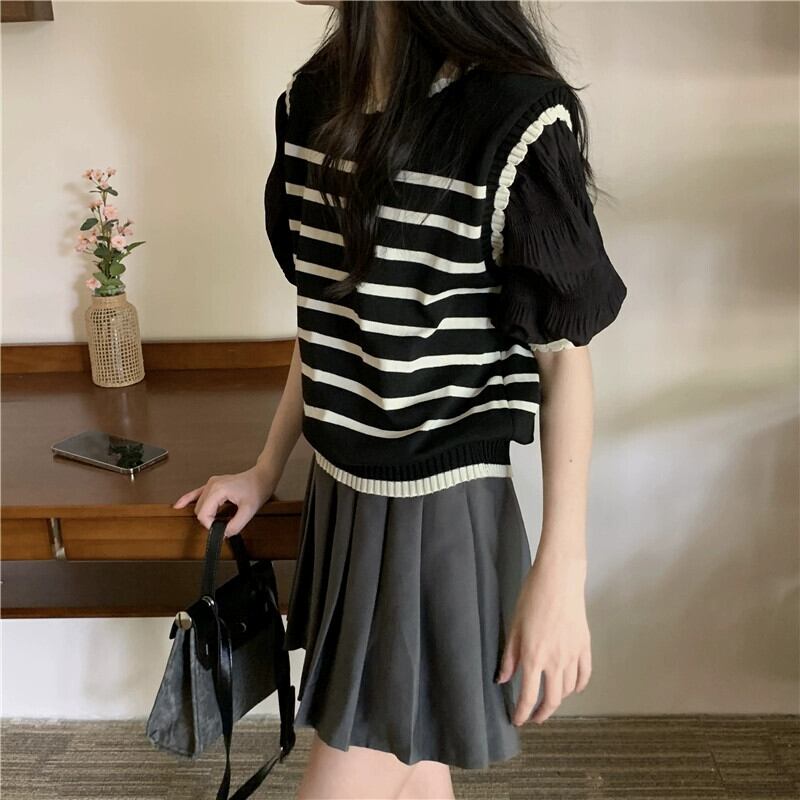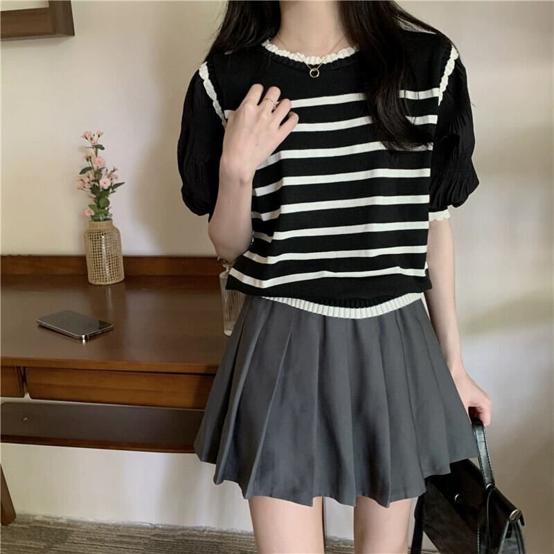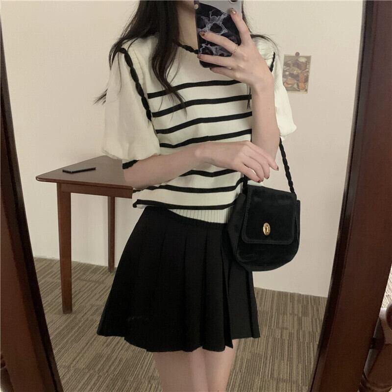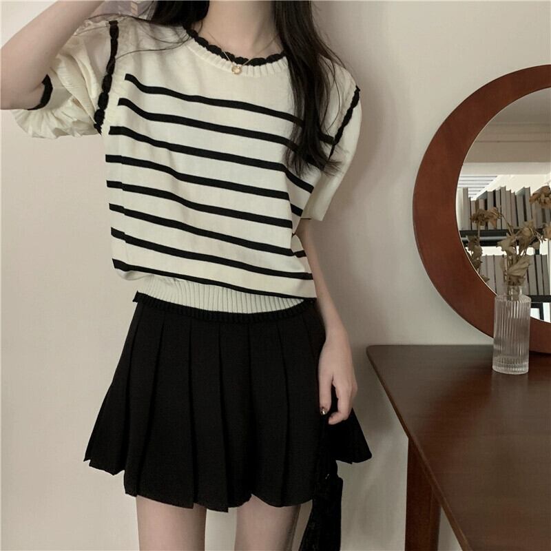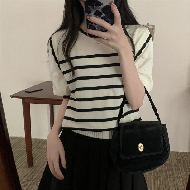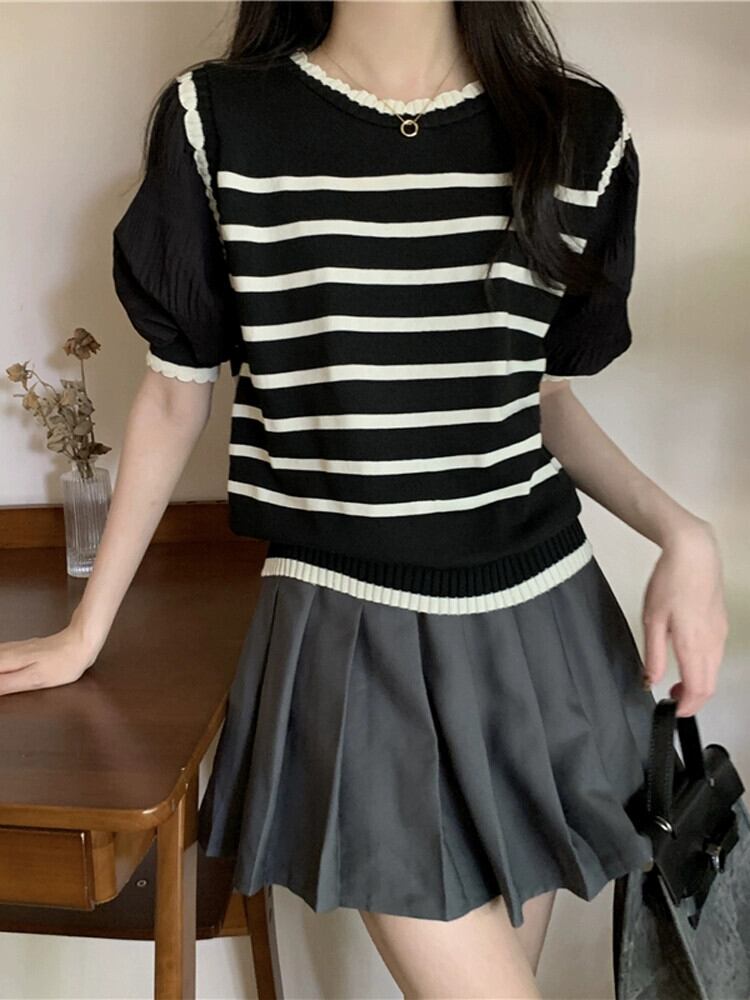 黒と白のストライプの半袖セーターの女性の夏のデザイン感覚、ゆったりと多用途のショートスプライシングシフォンパフスリーブトップ ホワイト ブラック サマー 夏物 7460018467452817 | framboise21