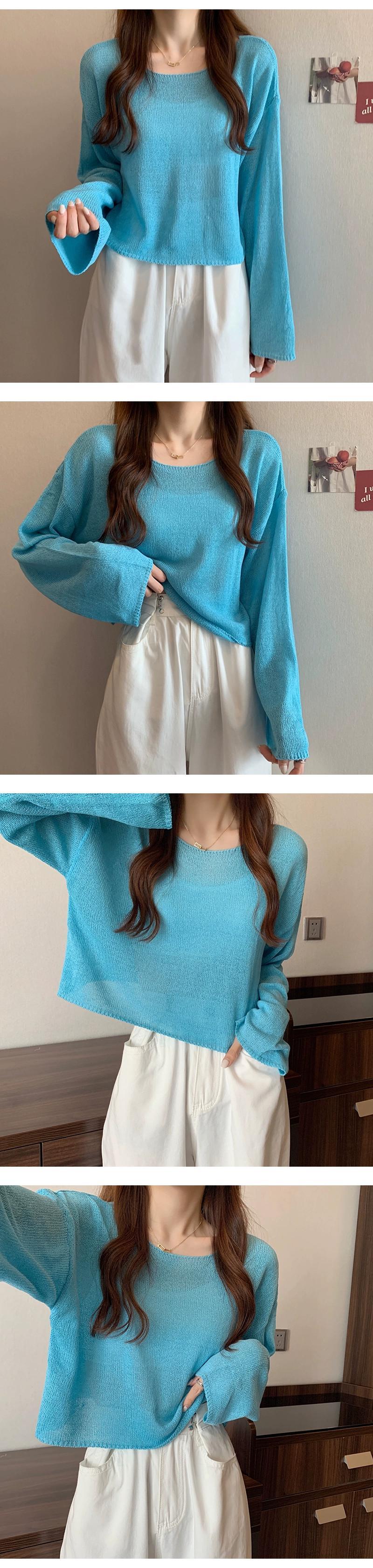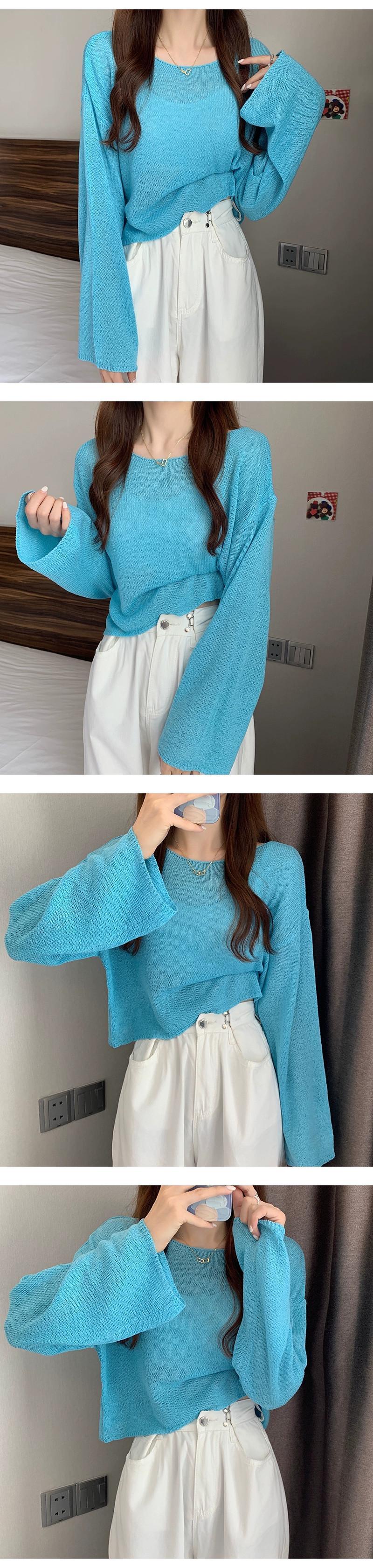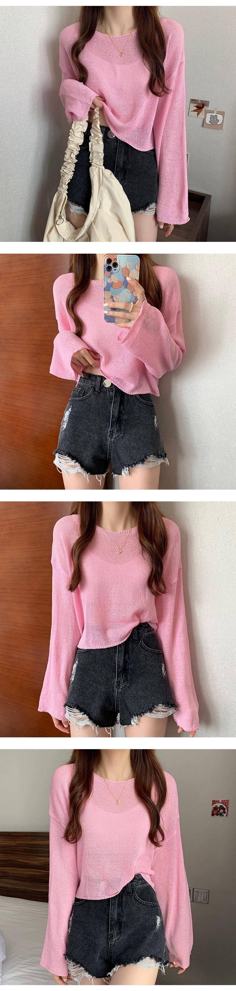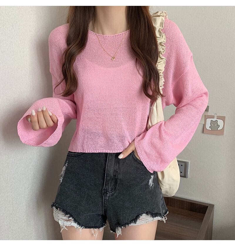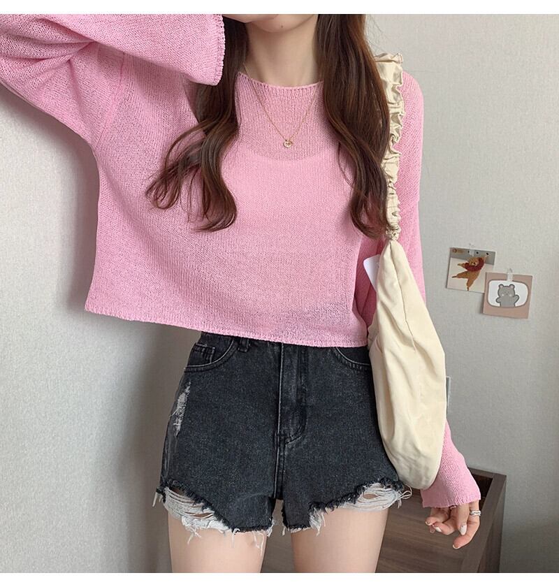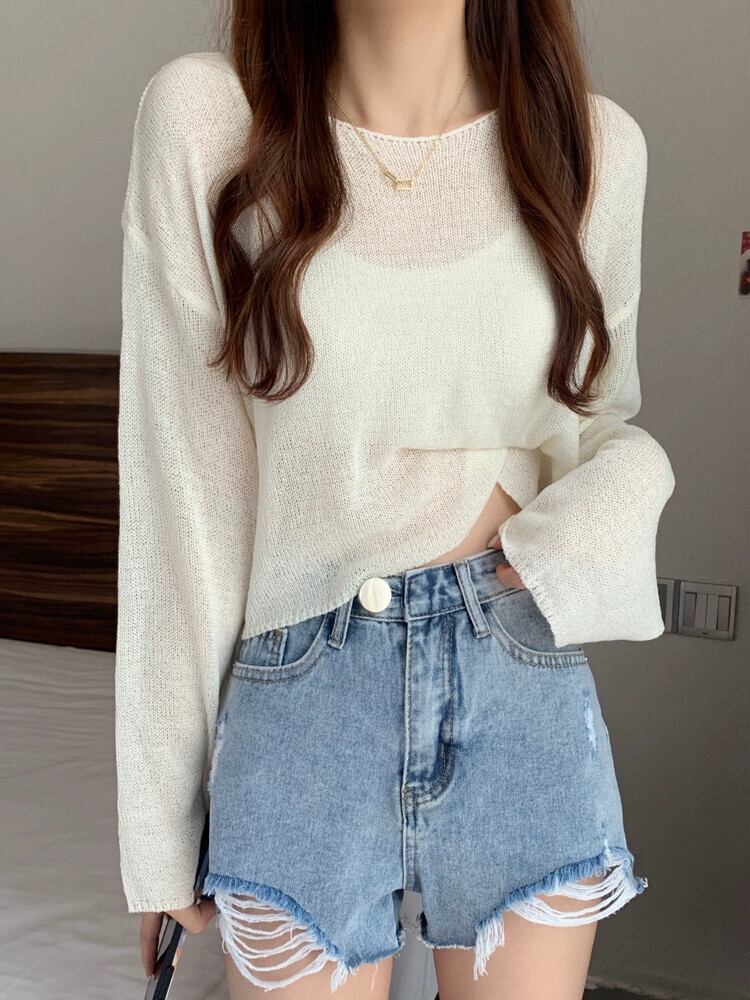 ホワイトアイスシルクニット日焼け止めブラウス女性の夏のルーズアウターウェア薄肉空調シャツわずかに透明なショートラウンドネックトップ サマー 夏物 Oネック 7460017133108210 | framboise21