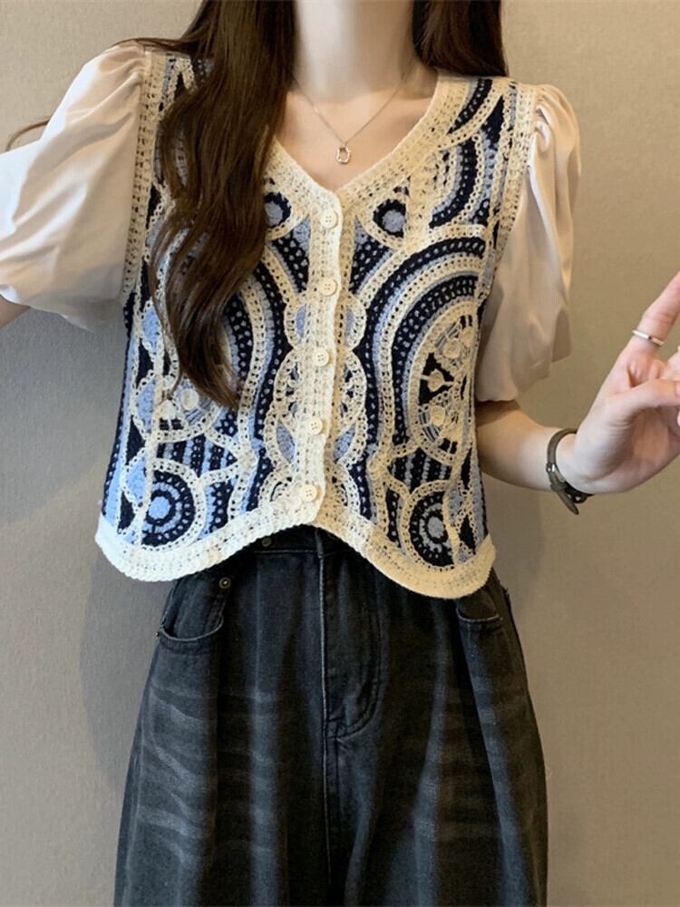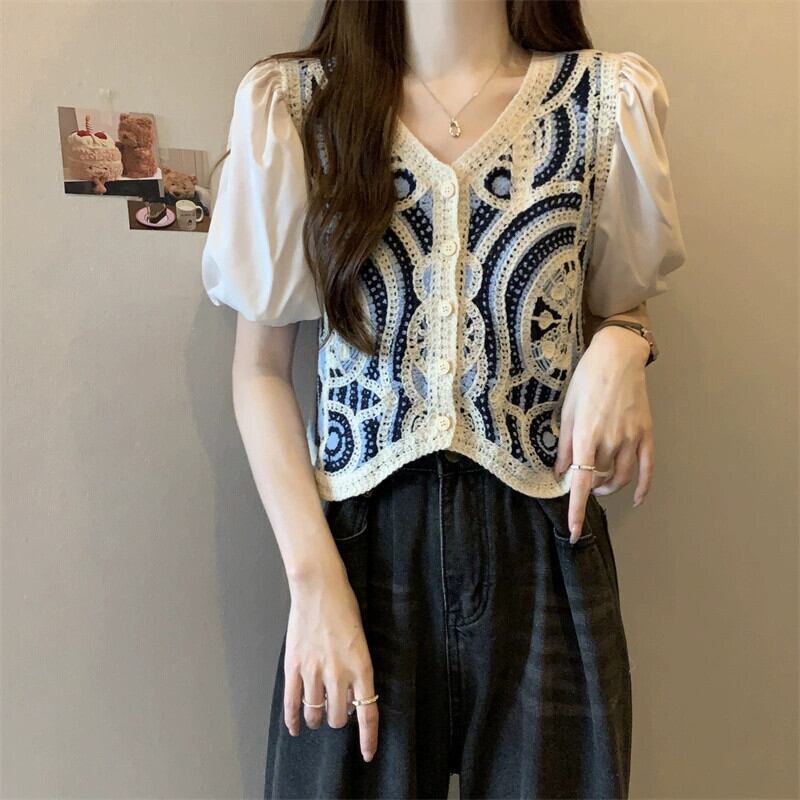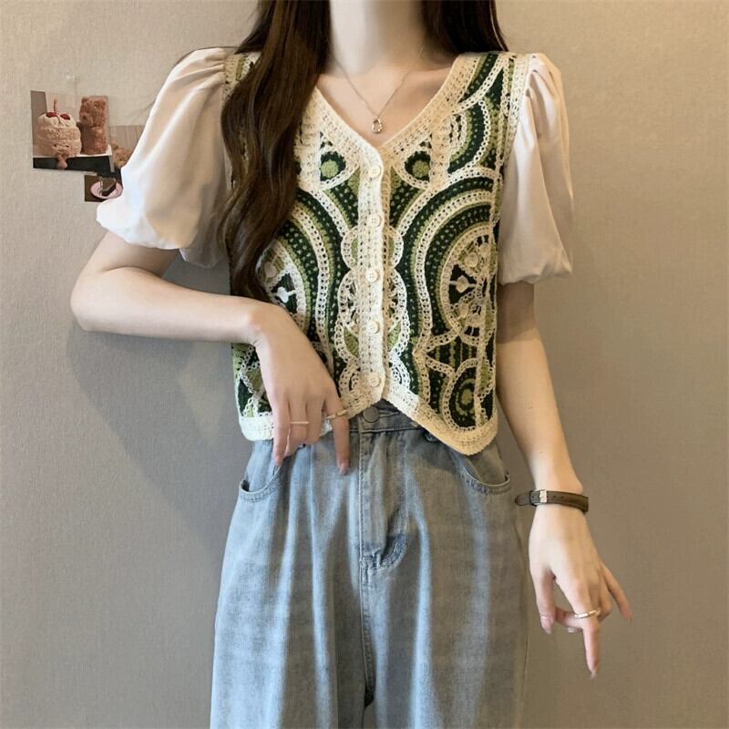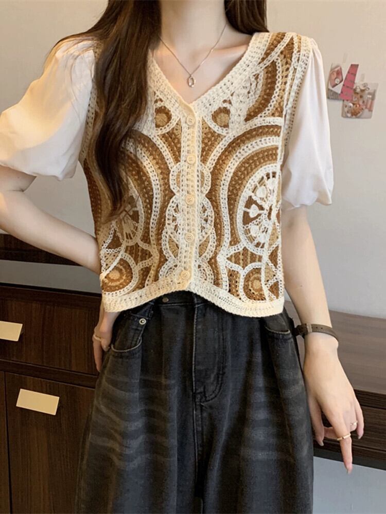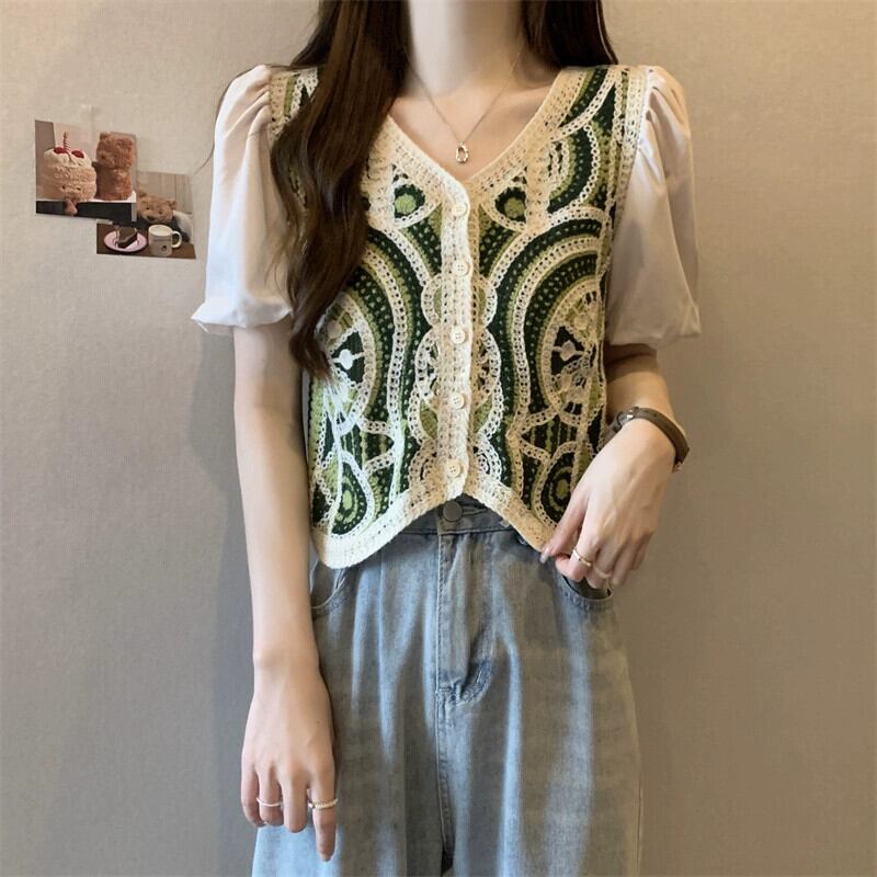 不規則な半袖シャツの女性の夏フレンチデザイン中空フックフラワーシャツショートパフスリーブ V ネックトップ サマー 夏物 Vネック フラワーデザイン 7460038950523886 | framboise21